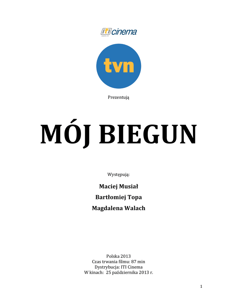 Prezentują MÓJ BIEGUN Występują: Maciej Musiał Bartłomiej Topa Magdalena Walach Polska 2013 Czas trwania filmu: 87 min Dystrybucja: ITI Cinema W kinach: 25 października 2013 r. 1 Obsada Maciej Musiał Jasiek Mela Bartłomiej Topa Bogdan Mela Magdalena Walach Ula Mela Twórcy Reżyseria Marcin Głowacki Scenariusz Kaśka Śliwińska-‐Kłosowicz, Marek Kłosowicz Zdjęcia Dariusz Rudziński Montaż Robert Ciodyk PSM Kierownictwo produkcji Krzysztof Łojan Scenografia Grzegorz Skawiński Kostiumy Justyna Krzepkowska Charakteryzacja Monika Chojnacka Muzyka Mateusz Pospieszalski Dźwięk Mirosław Gibas (dźwięk na planie) Casting Gabi von Seltmann, Natalia Schmidt Sekretarz programu Elżbieta Czaja Producenci Krystyna Lasoń, Marek Kłosowicz 2 O filmie Los potrafi często doświadczyć człowieka tak, że trudno się podnieść. Są jednak ludzie, którzy wobec największych przeciwności wydają się być niepokonani. Ich prawdziwą siłą jest to, że nigdy nie tracą nadziei. „Mój biegun” to prawdziwa historia Jaśka Meli, najmłodszego w historii zdobywcy dwóch biegunów, a zarazem pierwszej niepełnosprawnej osoby, która dokonała takiego wyczynu. Zanim jednak do tego doszło, jego rodzina musiała poradzić sobie z serią tragicznych wydarzeń. Śmierć młodszego syna, a po kliku latach – ciężki wypadek nastoletniego Jaśka. To historia, w której rodzina odnajduje na nowo wiarę i miłość. Historia chłopca, który walcząc o powrót do normalnego życia, odnajduje w sobie siłę charakteru obcą niejednemu dorosłemu. To przepiękna opowieść o ludziach, którzy trwają razem pomimo tragedii i uczą się bolesne wydarzenia przekuwać w zwycięstwo. Jako Jaśka Melę zobaczymy po raz pierwszy na wielkim ekranie w głównej roli Macieja Musiała, a w rolach jego rodziców Bartłomieja Topę (Drogówka, Dom zły) i Magdalenę Walach (Enen). Historia chłopca, który, po tym jak uległ wypadkowi, podjął walkę z własnymi ograniczeniami, aby w końcu wraz z podróżnikiem Markiem Kamińskim zdobyć dwa bieguny Ziemi, zainspirowała producentów filmu „Nad życie” i „Oszukane” do opowiedzenia tych niezwykłych wydarzeń. Prawdziwa historia Jaśka Meli od 25 października w kinach. 3 Reżyser o filmie Jasiek to połączenie wrażliwości, siły i normalności Jakkolwiek obecnie nie są modne takie określenia, jak bohater – to Jasiek Mela bez wątpienia właśnie nim jest. Dlaczego? Ponieważ w tym chłopaku jest niezwykłe połączenie wrażliwości, siły a jednocześnie normalności. Przy czym Jasiek Mela to nie jest wymyślona postać rodem z amerykańskiego komiksu, pełna sztucznego heroizmu. Jest to jak najbardziej realnie żyjący, normalny chłopak, który został postawiony przez los w nadzwyczajnej sytuacji i jej sprostał. To historia o miłości „Mój biegun” to dla mnie historia miłości rodziców do swoich dzieci i dzieci do rodziców. Miłość, która często sama w sobie jest trudna i może rodzić konflikty, tutaj zarówno w życiu jak i filmie staje przed wielką próbą. Najpierw śmierć młodszego syna, potem kalectwo starszego. I właśnie miłość daje odpowiedź na to jak sobie z tymi tragediami poradzić. Opowieść bez lukru Historia Jaśka Meli i jego rodziny jest niezwykle budująca. Pokazuje jak wielka siła drzemie w człowieku. W każdym z nas. To w końcu historia zwycięstwa nad różnorakimi słabościami. Jednak nie ma tutaj lukru, ludzie są egoistami, potrafią być dla siebie okrutni. Na szczęście w najtrudniejszych nawet chwilach zawsze znajduje się ktoś kto chce drugiemu pomóc. Dzięki temu ten drugi nie poddaje się i ma siłę, aby walczyć. Dla kogo jest ten film? Najprościej mówiąc dla wszystkich powyżej 7 roku życia. Powodów dla których warto zobaczyć ten film można wymieniać wiele. Od doskonałej obsady z Magdą Walach, Bartkiem Topą i Maćkiem Musiałem na czele, poprzez świetną muzykę Mateusza Pospieszalskiego. Jednak najważniejsza jest historia Jaśka Meli, która 4 powoduje, że film poruszy zarówno tych, którzy chcą zobaczyć niezwykłą historię rodzinną jak i tych, którzy fascynują się podróżami i chcą dowiedzieć się, jak to się stało, że niepełnosprawny chłopak zdobył biegun. To prawdziwa historia Autorzy scenariusza spędzili wiele godzin na rozmowach z Jaśkiem Melą jak i jego rodzicami. Rodzina poznała zarówno scenariusz, jak i widziała film. To jest ich historia. Jednak nie da się w 90 minutowym filmie zmieścić całego bogactwa ludzkiego życia. Dla potrzeb filmu kilka więc rzeczy zostało zmienionych. Nie szukaliśmy też np. fizycznego podobieństwa pomiędzy bohaterami filmu a ich realnymi pierwowzorami. Przede wszystkim chodziło o to, aby wiarygodnie opowiedzieć ich historię. I to sądzę, obserwując reakcje samego Jaśka jak i jego rodziców, w trakcie i po obejrzeniu filmu, udało się osiągnąć. Producentka o filmie Najciekawsze w historii Jaśka Meli zawsze wydawało mi się nie to, w jaki sposób zdobywał „swój” biegun, ale wydarzenia z jego życia, które doprowadziły go do tego momentu. „Sercem” naszej filmowej historii jest przemiana, jaką musi przeżyć młody chłopak, po dramacie, jaki go dotknął. „Mój biegun” opowiada historię chłopca, który miał bardzo szczęśliwe dzieciństwo, aż do chwili śmierci młodszego brata. Jasiek czuje się winny tej śmierci, a co gorsze, wie, że wini go także jego ojciec. Ten konflikt ojca i syna trwa przez okres dojrzewania młodego bohatera. Jednak w chwili, kiedy Jaśka dotyka nieszczęśliwy wypadek i potem kalectwo, cała rodzina, a najmocniej ojciec, walczy o chłopca i jest razem z nim. Ta część historii jest mi szczególnie bliska: pokazuje, jak w obliczu prawdziwego dramatu ludzie potrafią być razem, pokonać egoizm. 5 „Mój biegun” zupełnie wyjątkowo pokazuje relację ojca z synem: łączy ich więź silniejsza, niż przypuszczają. To, jak s