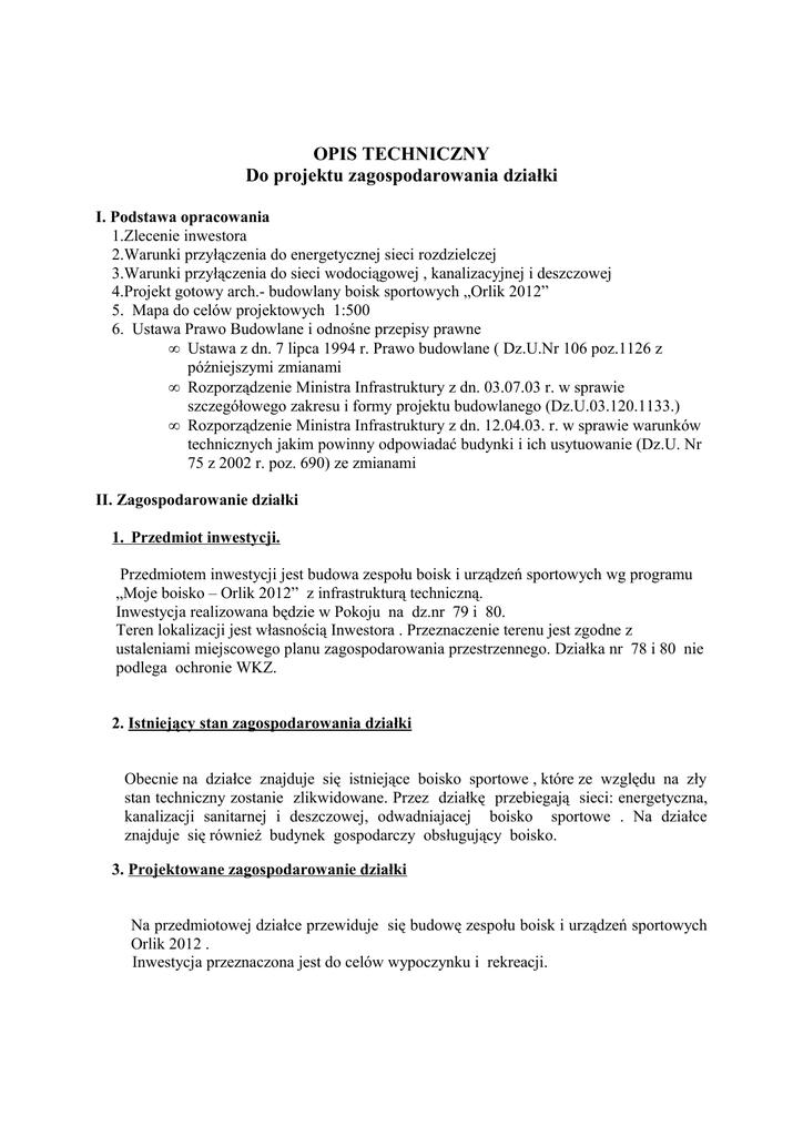 OPIS TECHNICZNY Do projektu zagospodarowania działki I. Podstawa opracowania 1.Zlecenie inwestora 2.Warunki przyłączenia do energetycznej sieci rozdzielczej 3.Warunki przyłączenia do sieci wodociągowej , kanalizacyjnej i deszczowej 4.Projekt gotowy arch.- budowlany boisk sportowych „Orlik 2012” 5. Mapa do celów projektowych 1:500 6. Ustawa Prawo Budowlane i odnośne przepisy prawne • Ustawa z dn. 7 lipca 1994 r. Prawo budowlane ( Dz.U.Nr 106 poz.1126 z późniejszymi zmianami • Rozporządzenie Ministra Infrastruktury z dn. 03.07.03 r. w sprawie szczegółowego zakresu i formy projektu budowlanego (Dz.U.03.120.1133.) • Rozporządzenie Ministra Infrastruktury z dn. 12.04.03. r. w sprawie warunków technicznych jakim powinny odpowiadać budynki i ich usytuowanie (Dz.U. Nr 75 z 2002 r. poz. 690) ze zmianami II. Zagospodarowanie działki 1. Przedmiot inwestycji. Przedmiotem inwestycji jest budowa zespołu boisk i urządzeń sportowych wg programu „Moje boisko – Orlik 2012” z infrastrukturą techniczną. Inwestycja realizowana będzie w Pokoju na dz.nr 79 i 80. Teren lokalizacji jest własnością Inwestora . Przeznaczenie terenu jest zgodne z ustaleniami miejscowego planu zagospodarowania przestrzennego. Działka nr 78 i 80 nie podlega ochronie WKZ. 2. Istniejący stan zagospodarowania działki Obecnie na działce znajduje się istniejące boisko sportowe , które ze względu na zły stan techniczny zostanie zlikwidowane. Przez działkę przebiegają sieci: energetyczna, kanalizacji sanitarnej i deszczowej, odwadniajacej boisko sportowe . Na działce znajduje się również budynek gospodarczy obsługujący boisko. 3. Projektowane zagospodarowanie działki Na przedmiotowej działce przewiduje się budowę zespołu boisk i urządzeń sportowych Orlik 2012 . Inwestycja przeznaczona jest do celów wypoczynku i rekreacji. Zakres inwestycji obejmuje budowę : - boiska do piłki nożnej o nawierzchni syntetycznej - boiska wielofunkcyjnego do piłki ręcznej, koszykówki, siatkówki i tenisa o nawierzchni syntetycznej. - ciągu komunikacyjnego - oświetlenia boisk - ogrodzenia boisk z bramą wjazdową i 3 furtkami - infrastruktury technicznej podziemnej – wg opracowania branżowego. Wydzielona część działki przeznaczona na realizację przedmiotowej inwestycji zostanie ogrodzona systemowym ogrodzeniem o wys. 4m. Za bramkami boisk do piłki nożnej i piłki ręcznej projektuje się piłkochwyty o wys. 6m i długości 27m . Zestawienie powierzchni L.p 1. 2. 3. 4. nr 1. opis Powierzchnia objęta opracowaniem po obrysie ogrodzenia = powierzchni potrzebnej do zrealizowania zadania inwestycyjnego Powierzchnia boiska do piłki nożnej Powierzchnia boiska wielofunkcyjnego do piłki ręcznej, koszykówki i siatkówki Powierzchnia ciągów komunikacyjnych(chodniczek poza ogrodzeniem boisk) Teren utwardzony kostką betonową w obrębie ogrodzenia boisk Teren utwardzony kostka betonową wokół ogrodzenia obiekt BOISKO DO PIŁKI NOŻNEJ powierzchnia 3726,48 m2 1860,00m2 1500,00m2 116,97m2 252,73m2 149,39m2 opis Nawierzchnia z trawy syntetycznej piłkarskiej Dane liczbowe Powierzchnia całkowita Szerokość Długość 1860,00m2 26,00 m+2x2m wybiegi = 30m 56,00m+2x3m wybiegi = 62m 2. obiekt BOISKO DO PIŁKI RĘCZNEJ KOSZYKÓWKI SIATKÓWKI oraz TENISA opis Nawierzchnia syntetyczna poliuretan Dane liczbowe Powierzchnia całkowita Szerokość Długość 1500m2 30m 50m 4 . Dojazd Układ komunikacyjny: Dojazd do zespołu boisk wjazdem istniejącym od ul. Namysłowskiej dz. nr 938/4, oraz istniejące dojścia dla pieszych do ul. Sienkiewicza , jak i do strony szkoły. 5. Sieci uzbrojenia terenu Dla potrzeb budowy boisk sportowych przewidywane jest podłączenie projektowanej inwestycji do podziemnej sieci uzbrojenia terenu - Sieć elektroenergetyczna – oświetlenie terenu boisk - Sieć kanalizacji drenarskiej i deszczowej – boiska i tereny utwardzone 6.Ukształtowanie terenu Teren w obrębie inwestycji jest terenem płaskim z łagodnym spadkiem w kierunku południowym .Rzędne terenu objętego zagospodarowaniem o wysokościach od 159.19 do 159.66. Na podstawie dokumentacji geotechnicznej wykonanej przez „Grunt” s.c. ZUG w Opolu stwierdza się iż grunty rodzime (piaski średnie i drobne) przykrywa warstwa ( ok. 0,5 – 0,6 m) nasypów z gleby, piasku, gruzu ceglanego i gruzowego. Nasypy z gruzu ceglanego po odpowiednim doziarnowaniu oraz dogęszczeniu mogą stanowić podłoże dla wykonania właściwej podbudowy nawierzchni boisk. Pozostałe nasypy oraz glebę należy usunąć i wymienić aż do poziomu rodzimych piasków na odpowiedni materiał piaszczysto – żwirowy i tłuczniowy. Obszar boisk powinien być odpowiednio zdrenowany z odprowadzeniem wody do istniejącej kanalizacji deszczowej . Wszelkie spadki podłużne projektowane na ciągach komunikacyjnych nie przekraczają 1%, a spadki poprzeczne 1%. Spadki przewidziane w obszarze boisk zgodne są z wytycznymi dla obiektów sportowych. 7.Dane o istniejących i przewidywanych cechach zagrożenia dla środowiska oraz higieny i zdrowia użytkowników Projektowany obiekt nie wywiera negatywnego wpływu na środowisko . Gromadzenie odpadków stałych w kontenerze przy istniejącym budynku gospodarczym na terenie opracowania. ROZWIĄZANIA TECHNICZNE BOISK Boisko do gry w PIŁKĘ NOŻNĄ PODBUDOWA. - grunt rodzimy, - warstwa odsączająca z piasku lub pospółki o gr. 10cm, - warstwa konstrukcyjna z kruszywa kamiennego (fr. 31,5-63mm) o gr. 10cm, - warstwa klinująca z kruszywa kamiennego (fr. 0-31,5mm) o gr. 5cm, - warstwa wyrównująca z miału kamiennego (fr. 0-4mm) o gr. 4cm, Boisko należy oddzielić od sąsiadujących elementów terenu za pomocą obrzeży betonowych 8x30x100cm układanych na ławie z betonu B15 z oporem. Na powierzchni boiska należy wyprofilować spadki o wartości min. 0,5%. Pod całą powierzchnią boisk zostanie wykonany drenaż wewnętrzny. NAWIERZCHNIA DO PIŁKI NOŻNEJ. Jako nawierzchnię przyjmuje się 