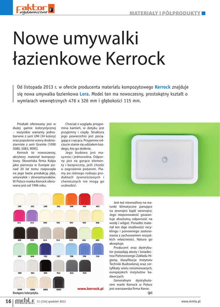 MATERIAŁY I PÓŁPRODUKTY Nowe umywalki łazienkowe Kerrock Od listopada 2013 r. w ofercie producenta materiału kompozytowego Kerrock znajduje się nowa umywalka łazienkowa Lora. Model ten ma nowoczesny, prostokątny kształt o wymiarach wewnętrznych 476 x 326 mm i głębokości 115 mm. Produkt oferowany jest w dużej gamie kolorystycznej – wszystkie warianty jednobarwne z serii UNI (34 kolory) oraz popularne wzory drobnoziarniste z serii Granite (1090 5080, 5083, 9095). Kerrock to nowoczesny, akrylowy materiał kompozytowy. Słoweńska firma Kolpa jako pierwsza w Europie ponad 20 lat temu rozpoczęła na jego bazie produkcję płyt, umywalek i zlewozmywaków. W Polsce marka Kerrock oferowana jest od 1996 roku. Chociaż z wyglądu przypomina kamień, w dotyku jest przyjemny i ciepły. Struktura jego powierzchni jest pociągająca i nęcąca. Przyjemne odczucie stanie się udziałem każdego, kto go dotknie. Jego budowa jest masywna i jednorodna. Odporny jest na gorące elementy i bezpieczny, jeśli chodzi o zagrożenie pożarem. Plamy po różnego rodzaju produktach żywnościowych i chemicznych nie mogą go uszkodzić. Dostępna kolorystyka. 16 11 (154) grudzień 2013 Jest też niewrażliwy na warunki klimatyczne panujące na zewnątrz bądź wewnątrz. Jego nieporowatość gwarantuje absolutną odporność na wodę i wilgoć. Ponadto materiał ten daje możliwości recyklingu i ponownego zastosowania z zachowaniem wszystkich właściwości. Natura go akceptuje. Producent oraz dystrybutor posiadają atesty i świadectwa Państwowego Zakładu Higieny, klasyfikacje Instytutu Techniki Budowlanej oraz certyfikaty wielu renomowanych, europejskich instytutów badawczych. Generalnym dystrybutorem marki Kerrock w Polsce jest warszawska firma Kerox. (jr) www.mmia.pl