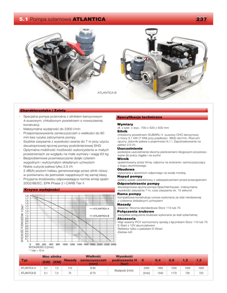 5.1 Pompa szlamowa ATLANTICA 237 ATLANTICA B Charakterystyka / Zalety - Specjalna pompa przenośna z silnikiem benzynowym 4-suwowym, chłodzonym powietrzem o nowoczesnej konstrukcji. - Maksymalna wydajność do 2300 l/min - Przepompowywanie zanieczyszczeń o wielkości do 80 mm bez ryzyka zatrzymania pompy - Szybkie zasysanie z wysokości ssania do 7 m przy użyciu dwustopniowej ręcznej pompy podciśnieniowej SHG - Optymalna mobilność możliwość wykorzystania w małych przestrzeniach ze względu na małe wymiary i wagę 63 kg - Bezproblemowe przemieszczanie dzięki czterem wygodnym i wytrzymałym składanym uchwytom - Niskie zużycie paliwa tylko 2,5 l/h - 2 dB(A) poziom hałasu generowanego przez silnik niższy w porównaniu do jednostek napędowych tej samej klasy - Przyjazna środowisku odpowiadająca normie emisji spalin 2002/88/EC, EPA Phase 2 i CARB Tier II Specyfikacja techniczna Wymiary dł. x szer. x wys.: 700 x 520 x 500 mm Silnik chłodzony powietrzem SUBARU 4 -suwowy OHC benzynowy o mocy 5,1 kW (7 KM) przy prędkości 3600 obr/min. Rozruch ręczny; zbiornik paliwa o pojemności 6,1 l. Zapotrzebowanie na paliwo 2,5 l/h. Uszczelnienie podwójne uszczelnienie dwoma pierścieniami ślizgowymi przystosowane do pracy ciągłej i na sucho Wirnik opatentowany przez firmę, odporny na ścieranie i samoczyszczący z brązu aluminiowego Obudowa wykonana z aluminium odpornego na wodę morską Napęd pompy solidny pasek wieloklinowy z zabezpieczeniem przed przeciążeniem Odpowietrzenie pompy dwustopniowa ręczna pompa Spechtenhauser, maksymalna wysokość zasysania 7 m, czas zasysania ok. 15 sekund Krzywa wydajności Rama pompy kompaktowa konstrukcja rurowa wykonana ze stali nierdzewnej z czterema składanymi uchwytami WYSOKOŚĆ PODNOSZENIA H [bar] * Nasady ssawna i tłoczna standardowe Storz 110 lub 75 Połączenia śrubowe wszystkie połączenia śrubowe wykonane ze stali szlachetnej Akcesoria Wąż ssawny PCV wzmocniony spiralą z łącznikami Storz 110 lub 75 E-Start z 12V akumulatorem Reflektor tylko z pakietem E-Strart Zestaw kół WYDAJNOŚĆ Q [l/min] * 1 bar = 10 m Nasady Wielkość zanieczyszczeń [mm] Moc silnika Typ [kW] [KM] ATLANTICA A 5,1 7,0 110 Ø 80 ATLANTICA B 5,1 7,0 75 Ø 70 Wysokość podnoszenia H [bar] Wydajność [l/min] 0 0,4 0,8 1,2 1,2 2300 1950 1530 1000 1000 [l/min] 1540 1170 720 720