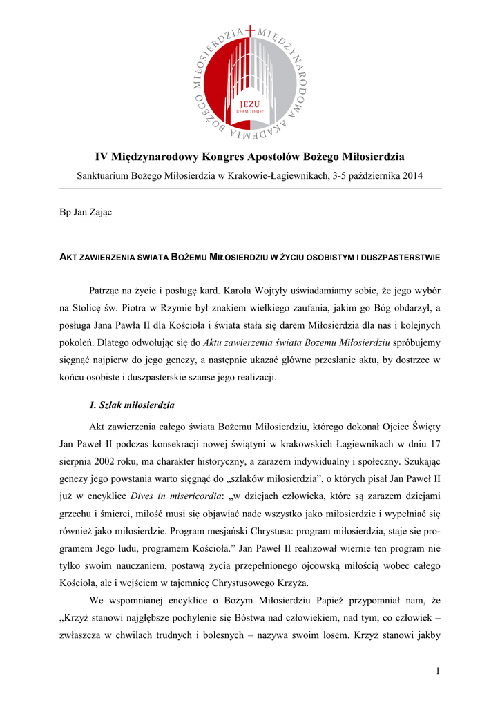 IV Międzynarodowy Kongres Apostołów Bożego Miłosierdzia Sanktuarium Bożego Miłosierdzia w Krakowie-Łagiewnikach, 3-5 października 2014 Bp Jan Zając AKT ZAWIERZENIA ŚWIATA BOŻEMU MIŁOSIERDZIU W ŻYCIU OSOBISTYM I DUSZPASTERSTWIE Patrząc na życie i posługę kard. Karola Wojtyły uświadamiamy sobie, że jego wybór na Stolicę św. Piotra w Rzymie był znakiem wielkiego zaufania, jakim go Bóg obdarzył, a posługa Jana Pawła II dla Kościoła i świata stała się darem Miłosierdzia dla nas i kolejnych pokoleń. Dlatego odwołując się do Aktu zawierzenia świata Bożemu Miłosierdziu spróbujemy sięgnąć najpierw do jego genezy, a następnie ukazać główne przesłanie aktu, by dostrzec w końcu osobiste i duszpasterskie szanse jego realizacji. 1. Szlak miłosierdzia Akt zawierzenia całego świata Bożemu Miłosierdziu, którego dokonał Ojciec Święty Jan Paweł II podczas konsekracji nowej świątyni w krakowskich Łagiewnikach w dniu 17 sierpnia 2002 roku, ma charakter historyczny, a zarazem indywidualny i społeczny. Szukając genezy jego powstania warto sięgnąć do „szlaków miłosierdzia”, o których pisał Jan Paweł II już w encyklice Dives in misericordia: „w dziejach człowieka, które są zarazem dziejami grzechu i śmierci, miłość musi się objawiać nade wszystko jako miłosierdzie i wypełniać się również jako miłosierdzie. Program mesjański Chrystusa: program miłosierdzia, staje się programem Jego ludu, programem Kościoła.” Jan Paweł II realizował wiernie ten program nie tylko swoim nauczaniem, postawą życia przepełnionego ojcowską miłością wobec całego Kościoła, ale i wejściem w tajemnicę Chrystusowego Krzyża. We wspomnianej encyklice o Bożym Miłosierdziu Papież przypomniał nam, że „Krzyż stanowi najgłębsze pochylenie się Bóstwa nad człowiekiem, nad tym, co człowiek – zwłaszcza w chwilach trudnych i bolesnych – nazywa swoim losem. Krzyż stanowi jakby 1 dotknięcie odwieczną miłością najboleśniejszych ran ziemskiej egzystencji człowieka, wypełnienie do końca mesjańskiego programu, który kiedyś Chrystus sformułował w Nazarecie, a potem powtórzył wobec wysłanników Jana Chrzciciela. Program ten wedle słów zapisanych już w proroctwie Izajasza polegał na objawieniu miłości miłosiernej w stosunku do ubogich, cierpiących i więźniów, w stosunku do niewidomych, uciśnionych i grzeszników.” (DiM 8). Ten wymagający szlak Miłosierdzia stał się programem i szlakiem Jana Pawła II. Podejmując trud bezpośredniego przygotowania Kościoła oraz świata do Jubileuszu roku 2000 Jan Paweł II w liście apostolskim Tertio millennio adveniente ukazał pasterzom i wiernym kolejne etapy przygotowań, zaznaczając, że „wszystko powinno zmierzać ku pierwszoplanowemu celowi Jubileuszu, jakim jest ożywienie wiary i świadectwo chrześcijan. Aby to świadectwo było skuteczne, trzeba rozbudzić w każdym wierzącym prawdziwą tęsknotę za świętością, mocne pragnienie nawrócenia i osobistej odnowy w klimacie coraz żarliwszej modlitwy i solidarności z bliźnimi, zwłaszcza z tymi najbardziej potrzebującymi” (TMA 42). W tym duchu nastąpiło także ożywienie kultu Bożego Miłosierdzia, zwłaszcza po beatyfikacji Siostry Faustyny, które miało miejsce na placu św. Piotra w Rzymie w 1993 roku. Nić Bożego Miłosierdzia obecna jest w słowach i czynach Jana Pawła II, a ich potwierdzeniem była również jego pielgrzymka do Łagiewnik w 1997 roku, kiedy powiedział: „Kościół odczytuje na nowo orędzie miłosierdzia, aby skutecznie nieść pokoleniu końca drugiego tysiąclecia i przyszłym generacjom światło nadziei. Nieprzerwanie też prosi Boga o miłosierdzie dla wszystkich ludzi. W żadnym czasie, w żadnym okresie dziejów - a zwłaszcza w okresie tak przełomowym jak nasz - Kościół nie może zapomnieć o modlitwie, która jest wołaniem o miłosierdzie Boga wobec wielorakiego zła, jakie ciąży nad ludzkością i jakie jej zagraża.” Podczas pobytu w Łagiewnikach w dniu 7 czerwca 1997 roku Ojciec Święty pobłogosławił „kamień z Golgoty”, który miał się stać kamieniem węgielnym powstającej świątyni ku czci Bożego Miłosierdzia. Pięć lat później, mimo słabnących już sił, przybył ponownie, by osobiście dokonać konsekracji nowej świątyni, bo miał świadomość wielkich zagrożeń, z jakimi zmaga się współczesny człowiek i świat. Mówił wówczas z wielkim już trudem: „Jak bardzo dzisiejszy świat potrzebuje Bożego miłosierdzia! Na wszystkich kontynentach z głębin ludzkiego cierpienia zdaje się wznosić wołanie o miłosierdzie. Tam, gdzie panuje nienawiść i chęć odwetu, gdzie wojna przynosi ból i śmierć niewinnych, potrzeba łaski miłosierdzia, które koi ludzkie umysły i serca i rodzi pokój. Gdzie brak szacunku dla życia i godności człowieka, potrzeba miłosiernej miłości Boga, w której świetle odsłania się niewypowiedziana wartość każdego ludzkiego istnienia. Potrzeba miłosierdzia, aby wszelka niesprawiedliwość na świecie znalazła kres w blasku prawdy.” 2 2. Nasza nadzieja w Miłosierdziu Pana Przejmująco zabrzmiały słowa Jana Pawła II, który podczas konsekracji nowej świątyni w krakowskich Łagiewnikach podkreślił już na samym początku homilii, że „nie ma dla człowieka innego źródła nadziei, jak miłosierdzie Boga.” Dociera ono do ludzkich serc poprzez święte sakramenty, które są uobecniane i sprawowane we wspólnocie Kościoła, w tych miejscach wybranych przez Boga, gdzie ludzie wiedzeni zmysłem wiary – jak mówił Ojciec Święty – przychodzą, bo „mają pewność, że rzeczywiście stają przed Bogiem, który jest tam obecny.” To głębokie przekonanie było decydującym motywem, by ponownie wejść na ten szlak Miłosierdzia i modlitwy, jakim jest każda świątynia. „Modlę się – mówił Papież, by ten kościół był zawsze miejscem