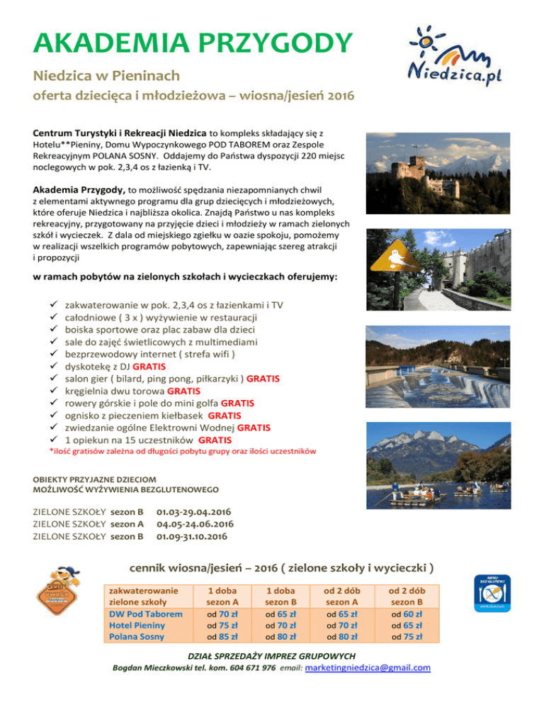 AKADEMIA PRZYGODY Niedzica w Pieninach oferta dziecięca i młodzieżowa – wiosna/jesień 2016 Centrum Turystyki i Rekreacji Niedzica to kompleks składający się z Hotelu**Pieniny, Domu Wypoczynkowego POD TABOREM oraz Zespole Rekreacyjnym POLANA SOSNY. Oddajemy do Państwa dyspozycji 220 miejsc noclegowych w pok. 2,3,4 os z łazienką i TV. Akademia Przygody, to możliwość spędzania niezapomnianych chwil z elementami aktywnego programu dla grup dziecięcych i młodzieżowych, które oferuje Niedzica i najbliższa okolica. Znajdą Państwo u nas kompleks rekreacyjny, przygotowany na przyjęcie dzieci i młodzieży w ramach zielonych szkół i wycieczek. Z dala od miejskiego zgiełku w oazie spokoju, pomożemy w realizacji wszelkich programów pobytowych, zapewniając szereg atrakcji i propozycji w ramach pobytów na zielonych szkołach i wycieczkach oferujemy: zakwaterowanie w pok. 2,3,4 os z łazienkami i TV całodniowe ( 3 x ) wyżywienie w restauracji boiska sportowe oraz plac zabaw dla dzieci sale do zajęć świetlicowych z multimediami bezprzewodowy internet ( strefa wifi ) dyskotekę z DJ GRATIS salon gier ( bilard, ping pong, piłkarzyki ) GRATIS kręgielnia dwu torowa GRATIS rowery górskie i pole do mini golfa GRATIS ognisko z pieczeniem kiełbasek GRATIS zwiedzanie ogólne Elektrowni Wodnej GRATIS 1 opiekun na 15 uczestników GRATIS *ilość gratisów zależna od długości pobytu grupy oraz ilości uczestników OBIEKTY PRZYJAZNE DZIECIOM MOŻLIWOŚĆ WYŻYWIENIA BEZGLUTENOWEGO ZIELONE SZKOŁY sezon B ZIELONE SZKOŁY sezon A ZIELONE SZKOŁY sezon B 01.03-29.04.2016 04.05-24.06.2016 01.09-31.10.2016 cennik wiosna/jesień – 2016 ( zielone szkoły i wycieczki ) zakwaterowanie zielone szkoły DW Pod Taborem Hotel Pieniny Polana Sosny 1 doba sezon A od 70 zł od 75 zł od 85 zł 1 doba sezon B od 65 zł od 70 zł od 80 zł od 2 dób sezon A od 65 zł od 70 zł od 80 zł od 2 dób sezon B od 60 zł od 65 zł od 75 zł DZIAŁ SPRZEDAŻY IMPREZ GRUPOWYCH Bogdan Mieczkowski tel. kom. 604 671 976 email: [email protected] PRZYKŁADY ZAJĘĆ i ATRAKCJI – zielone szkoły i wycieczki NIEDZICA - Pieniny Survival – cena 500 zł/grupa max 30 os/ zajęcia czas trwania 3 godz. zdobędziesz wiedzę o zasadach orientacji w terenie, posługiwania się kompasem, mapą, zegarkiem, elementami przyrody poznasz trudną sztukę kamuflażu i wzniecania ognie bez zapałek przekonasz się, że survival to doświadczenie, niezapomniana przygoda, przetrwanie a przede wszystkim doskonała zabawa Poznanie okolicy – cena 500 zł/grupa max 30 os czas trwania 2 godz. zwiad terenowy po okolicy nauka posługiwania się mapą i kompasem wyznaczanie kierunków świata – jak to robiono kiedyś i dziś bieg na orientację z wykorzystaniem nowych umiejętności Zajęcia strzeleckie i łucznicze – cena od 25 zł/os Warsztaty lepienia z gliny – cena 700 zł/grupa max 30 os czas trwania 3 godz. Warsztaty malowania na szkle – cena 500 zł/grupa max 30 os czas trwania 2 godz. Metaloplastyka – sztuka regionalna – cena 700 zł/grupa max 30 os czas trwania 3 godz. Z przyrodą za pan brat – cena 350 zł/grupa max 30 os czas trwania 2 godz. Gra terenowa „Świetliki” – cena 350 zł/grupa max 30 os czas trwania 2 godz. Izba Regionalna w Sromowcach – cena 500 zł/grupa max 30 os czas trwania 3 godz. wypiekanie chleba wyrób i pieczenie moskoli warsztaty tkackie robienie kwiatów i ozdób z papieru i bibuły ZAPRASZAMY W PIENINY ;) DZIAŁ SPRZEDAŻY IMPREZ GRUPOWYCH Bogdan Mieczkowski tel. kom. 604 671 976 email: [email protected]