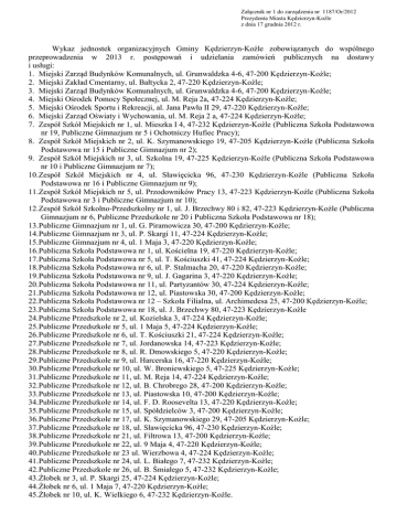 Załącznik nr 1 do zarządzenia nr 1187/Or/2012 Prezydenta Miasta Kędzierzyn-Koźle z dnia 17 grudnia 2012 r. Wykaz jednostek organizacyjnych Gminy Kędzierzyn-Koźle zobowiązanych do wspólnego przeprowadzenia w 2013 r. postępowań i udzielania zamówień publicznych na dostawy i usługi: 1. Miejski Zarząd Budynków Komunalnych, ul. Grunwaldzka 4-6, 47-200 Kędzierzyn-Koźle; 2. Miejski Zakład Cmentarny, ul. Bałtycka 2, 47-220 Kędzierzyn-Koźle; 3. Miejski Zarząd Budynków Komunalnych, ul. Grunwaldzka 4-6, 47-200 Kędzierzyn-Koźle; 4. Miejski Ośrodek Pomocy Społecznej, ul. M. Reja 2a, 47-224 Kędzierzyn-Koźle; 5. Miejski Ośrodek Sportu i Rekreacji, al. Jana Pawła II 29, 47-220 Kędzierzyn-Koźle; 6. Miejski Zarząd Oświaty i Wychowania, ul. M. Reja 2 a, 47-224 Kędzierzyn-Koźle; 7. Zespół Szkół Miejskich nr 1, ul. Mieszka I 4, 47-232 Kędzierzyn-Koźle (Publiczna Szkoła Podstawowa nr 19, Publiczne Gimnazjum nr 5 i Ochotniczy Hufiec Pracy); 8. Zespół Szkół Miejskich nr 2, ul. K. Szymanowskiego 19, 47-205 Kędzierzyn-Koźle (Publiczna Szkoła Podstawowa nr 15 i Publiczne Gimnazjum nr 2); 9. Zespół Szkół Miejskich nr 3, ul. Szkolna 19, 47-225 Kędzierzyn-Koźle (Publiczna Szkoła Podstawowa nr 10 i Publiczne Gimnazjum nr 7); 10. Zespół Szkół Miejskich nr 4, ul. Sławięcicka 96, 47-230 Kędzierzyn-Koźle (Publiczna Szkoła Podstawowa nr 16 i Publiczne Gimnazjum nr 9); 11. Zespół Szkół Miejskich nr 5, ul. Przodowników Pracy 13, 47-223 Kędzierzyn-Koźle (Publiczna Szkoła Podstawowa nr 3 i Publiczne Gimnazjum nr 10); 12. Zespół Szkół Szkolno-Przedszkolny nr 1, ul. J. Brzechwy 80 i 82, 47-223 Kędzierzyn-Koźle (Publiczna Gimnazjum nr 6, Publiczne Przedszkole nr 20 i Publiczna Szkoła Podstawowa nr 18); 13. Publiczne Gimnazjum nr 1, ul. G. Piramowicza 30, 47-200 Kędzierzyn-Koźle; 14. Publiczne Gimnazjum nr 3, ul. P. Skargi 11, 47-224 Kędzierzyn-Koźle; 15. Publiczne Gimnazjum nr 4, ul. 1 Maja 3, 47-220 Kędzierzyn-Koźle; 16. Publiczna Szkoła Podstawowa nr 1, ul. Kościelna 19, 47-220 Kędzierzyn-Koźle; 17. Publiczna Szkoła Podstawowa nr 5, ul. T. Kościuszki 41, 47-224 Kędzierzyn-Koźle; 18. Publiczna Szkoła Podstawowa nr 6, ul. P. Stalmacha 20, 47-220 Kędzierzyn-Koźle; 19. Publiczna Szkoła Podstawowa nr 9, ul. J. Gagarina 3, 47-220 Kędzierzyn-Koźle; 20. Publiczna Szkoła Podstawowa nr 11, ul. Partyzantów 30, 47-224 Kędzierzyn-Koźle; 21. Publiczna Szkoła Podstawowa nr 12, ul. Piastowska 30, 47-200 Kędzierzyn-Koźle; 22. Publiczna Szkoła Podstawowa nr 12 – Szkoła Filialna, ul. Archimedesa 25, 47-200 Kędzierzyn-Koźle; 23. Publiczna Szkoła Podstawowa nr 18, ul. J. Brzechwy 80, 47-223 Kędzierzyn-Koźle 24. Publiczne Przedszkole nr 2, ul. Kozielska 3, 47-224 Kędzierzyn-Koźle; 25. Publiczne Przedszkole nr 5, ul. 1 Maja 5, 47-224 Kędzierzyn-Koźle; 26. Publiczne Przedszkole nr 6, ul. T. Kościuszki 21, 47-224 Kędzierzyn-Koźle; 27. Publiczne Przedszkole nr 7, ul. Jordanowska 14, 47-223 Kędzierzyn-Koźle; 28. Publiczne Przedszkole nr 8, ul. R. Dmowskiego 5, 47-220 Kędzierzyn-Koźle; 29. Publiczne Przedszkole nr 9, ul. Harcerska 16, 47-220 Kędzierzyn-Koźle; 30. Publiczne Przedszkole nr 10, ul. W. Broniewskiego 5, 47-225 Kędzierzyn-Koźle; 31. Publiczne Przedszkole nr 11, ul. M. Reja 14, 47-224 Kędzierzyn-Koźle; 32. Publiczne Przedszkole nr 12, ul. B. Chrobrego 28, 47-200 Kędzierzyn-Koźle; 33. Publiczne Przedszkole nr 13, ul. Piastowska 10, 47-200 Kędzierzyn-Koźle; 34. Publiczne Przedszkole nr 14, ul. F. D. Roosevelta 13, 47-220 Kędzierzyn-Koźle; 35. Publiczne Przedszkole nr 15, ul. Spółdzielców 3, 47-200 Kędzierzyn-Koźle; 36. Publiczne Przedszkole nr 17, ul. K. Szymanowskiego 29, 47-205 Kędzierzyn-Koźle; 37. Publiczne Przedszkole nr 18, ul. Sławięcicka 96, 47-230 Kędzierzyn-Koźle; 38. Publiczne Przedszkole nr 21, ul. Filtrowa 13, 47-200 Kędzierzyn-Koźle; 39. Publiczne Przedszkole nr 22, ul. 9 Maja 4, 47-220 Kędzierzyn-Koźle; 40. Publiczne Przedszkole nr 23 ul. Wierzbowa 4, 47-224 Kędzierzyn-Koźle; 41. Publiczne Przedszkole nr 24, ul. L. Białego 7, 47-232 Kędzierzyn-Koźle; 42. Publiczne Przedszkole nr 26, ul. B. Śmiałego 5, 47-232 Kędzierzyn-Koźle; 43. Żłobek nr 3, ul. P. Skargi 25, 47-224 Kędzierzyn-Koźle; 44. Żłobek nr 6, ul. 1 Maja 7, 47-220 Kędzierzyn-Koźle; 45. Żłobek nr 10, ul. K. Wielkiego 6, 47-232 Kędzierzyn-Koźle.
