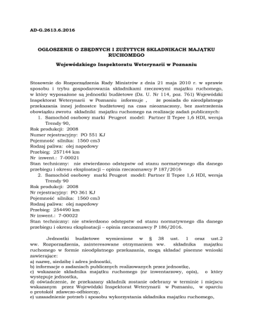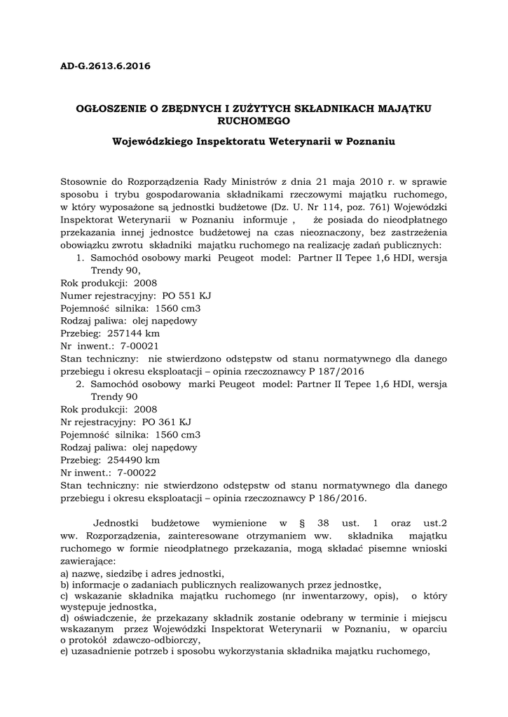 AD-G.2613.6.2016 OGŁOSZENIE O ZBĘDNYCH I ZUŻYTYCH SKŁADNIKACH MAJĄTKU RUCHOMEGO Wojewódzkiego Inspektoratu Weterynarii w Poznaniu Stosownie do Rozporządzenia Rady Ministrów z dnia 21 maja 2010 r. w sprawie sposobu i trybu gospodarowania składnikami rzeczowymi majątku ruchomego, w który wyposażone są jednostki budżetowe (Dz. U. Nr 114, poz. 761) Wojewódzki Inspektorat Weterynarii w Poznaniu informuje , że posiada do nieodpłatnego przekazania innej jednostce budżetowej na czas nieoznaczony, bez zastrzeżenia obowiązku zwrotu składniki majątku ruchomego na realizację zadań publicznych: 1. Samochód osobowy marki Peugeot model: Partner II Tepee 1,6 HDI, wersja Trendy 90, Rok produkcji: 2008 Numer rejestracyjny: PO 551 KJ Pojemność silnika: 1560 cm3 Rodzaj paliwa: olej napędowy Przebieg: 257144 km Nr inwent.: 7-00021 Stan techniczny: nie stwierdzono odstępstw od stanu normatywnego dla danego przebiegu i okresu eksploatacji – opinia rzeczoznawcy P 187/2016 2. Samochód osobowy marki Peugeot model: Partner II Tepee 1,6 HDI, wersja Trendy 90 Rok produkcji: 2008 Nr rejestracyjny: PO 361 KJ Pojemność silnika: 1560 cm3 Rodzaj paliwa: olej napędowy Przebieg: 254490 km Nr inwent.: 7-00022 Stan techniczny: nie stwierdzono odstępstw od stanu normatywnego dla danego przebiegu i okresu eksploatacji – opinia rzeczoznawcy P 186/2016. Jednostki budżetowe wymienione w § 38 ust. 1 oraz ust.2 ww. Rozporządzenia, zainteresowane otrzymaniem ww. składnika majątku ruchomego w formie nieodpłatnego przekazania, mogą składać pisemne wnioski zawierające: a) nazwę, siedzibę i adres jednostki, b) informacje o zadaniach publicznych realizowanych przez jednostkę, c) wskazanie składnika majątku ruchomego (nr inwentarzowy, opis), o który występuje jednostka, d) oświadczenie, że przekazany składnik zostanie odebrany w terminie i miejscu wskazanym przez Wojewódzki Inspektorat Weterynarii w Poznaniu, w oparciu o protokół zdawczo-odbiorczy, e) uzasadnienie potrzeb i sposobu wykorzystania składnika majątku ruchomego, f) telefon kontaktowy. Wnioski o których mowa powyżej należy Wojewódzkiego Lekarza Weterynarii w Poznaniu . kierować do Wielkopolskiego Wnioski należy składać osobiście lub za pośrednictwem poczty (decyduje data wpływu) do dnia 07 września 2016 r., do godz. 9-tej na adres : Wojewódzki Inspektorat Weterynarii w Poznaniu, ul. Grunwaldzka 250, 60-166 Poznań. Składniki majątku można oglądać w Wojewódzkim Inspektoracie Weterynarii w Poznaniu, ul. Grunwaldzka 250, od godz. 9:00 do 13.00, w terminie od 24.08. 2016 r. do dnia 06.09.2016 r., po wcześniejszym uzgodnieniu telefonicznym. Osobą upoważnioną do kontaktów jest Pan Bartosz Żak tel. 61 868-47-48 adres e-mail: bzak@ wiw.poznan.pl (pok. nr 202), W przypadku gdy co najmniej dwie jednostki wymienione w § 38 ust. 1 oraz ust.2 ww. Rozporządzenia będą zainteresowane nieodpłatnym przekazaniem, o przydziale składnika majątku ruchomego decyduje kolejność wpłynięcia wniosków oraz analiza potrzeb podmiotu wnioskującego. Sporządził: H. Musiał