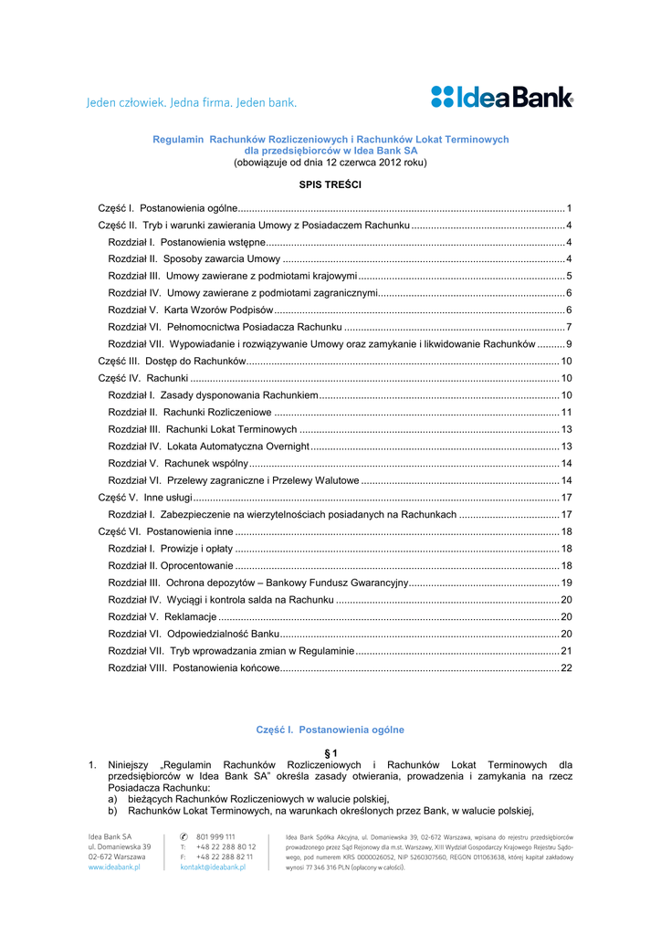 Regulamin Rachunków Rozliczeniowych i Rachunków Lokat Terminowych dla przedsiębiorców w Idea Bank SA (obowiązuje od dnia 12 czerwca 2012 roku) SPIS TREŚCI Część I. Postanowienia ogólne..................................................................................................................... 1 Część II. Tryb i warunki zawierania Umowy z Posiadaczem Rachunku ....................................................... 4 Rozdział I. Postanowienia wstępne ........................................................................................................... 4 Rozdział II. Sposoby zawarcia Umowy ..................................................................................................... 4 Rozdział III. Umowy zawierane z podmiotami krajowymi .......................................................................... 5 Rozdział IV. Umowy zawierane z podmiotami zagranicznymi................................................................... 6 Rozdział V. Karta Wzorów Podpisów ........................................................................................................ 6 Rozdział VI. Pełnomocnictwa Posiadacza Rachunku ............................................................................... 7 Rozdział VII. Wypowiadanie i rozwiązywanie Umowy oraz zamykanie i likwidowanie Rachunków .......... 9 Część III. Dostęp do Rachunków................................................................................................................ 10 Część IV. Rachunki .................................................................................................................................... 10 Rozdział I. Zasady dysponowania Rachunkiem ...................................................................................... 10 Rozdział II. Rachunki Rozliczeniowe ...................................................................................................... 11 Rozdział III. Rachunki Lokat Terminowych ............................................................................................. 13 Rozdział IV. Lokata Automatyczna Overnight ......................................................................................... 13 Rozdział V. Rachunek wspólny ............................................................................................................... 14 Rozdział VI. Przelewy zagraniczne i Przelewy Walutowe ....................................................................... 14 Część V. Inne usługi ................................................................................................................................... 17 Rozdział I. Zabezpieczenie na wierzytelnościach posiadanych na Rachunkach .................................... 17 Część VI. Postanowienia inne .................................................................................................................... 18 Rozdział I. Prowizje i opłaty .................................................................................................................... 18 Rozdział II. Oprocentowanie .................................................................................................................... 18 Rozdział III. Ochrona depozytów – Bankowy Fundusz Gwarancyjny...................................................... 19 Rozdział IV. Wyciągi i kontrola salda na Rachunku ................................................................................ 20 Rozdział V. Reklamacje .......................................................................................................................... 20 Rozdział VI. Odpowiedzialność Banku .................................................................................................... 20 Rozdział VII. Tryb wprowadzania zmian w Regulaminie ......................................................................... 21 Rozdział VIII. Postanowienia końcowe.................................................................................................... 22 Część I. Postanowienia ogólne 1. §1 Niniejszy „Regulamin Rachunków Rozliczeniowych i Rachunków Lokat Terminowych dla przedsiębiorców w Idea Bank SA” określa zasady otwierania, prowadzenia i zamykania na rzecz Posiadacza Rachunku: a) bieżących Rachunków Rozliczeniowych w walucie polskiej, b) Rachunków Lokat Terminowych, na warunkach określonych przez Bank, w walucie polskiej, 2. c) Rachunków Lokat Terminowych, na warunkach negocjowanych, w walucie polskiej, oraz określa zasady przeprowadzania rozliczeń pieniężnych na zlecenie Posiadacza Rachunku. Regulamin stanowi integralną część „Umowy o Rachunek Rozliczeniowy” oraz „Umowy o Rachunek Lokaty Terminowej”. §2 Użytym w Regulaminie następującym określeniom nadaje się poniższe znaczenie: 1) Bank – Idea Bank Spółka Akcyjna z siedzibą w Warszawie, ul. Domaniewska 39, 02-672 Warszawa, wpisana do rejestru przedsiębiorców Krajowego Rejestru Sądowego prowadzonego przez Sąd Rejonowy dla m.st. Warszawy, XIII Wydział Gospodarczy Krajowego Rejestru Sądowego, pod numerem KRS 0000026052, NIP 5260307560, REGON 011063638, której kapitał zakładowy wynosi 53 289 128,00 PLN (w pełni opłacony); 2) Bank Korespondent – bank działający jako organ upoważniony przez Bank do wykonywania czynności finansowych na danym rynku w jego imieniu; 3) Bank Zagraniczny – bank mający siedzibę za granicą. Przez używane w Regulaminie określenie „Bank Zagraniczny” rozumie się także „Instytucję Pośredniczącą”; 4) Bankowość Elektroniczna – usługi Bankowości Internetowej i Bankowości Telefonicznej świadczone przez Bank na rzecz Posiadacza Rachunku, zgodnie z Regulaminem Usług Bankowości Elektronicznej; 5) Beneficjent – Rezydent lub Nierezydent, na którego rzecz wystawiony został Przelew Zagraniczny lub Przelew Walutowy; 6) Certyfikat Rezydencji Podatkowej – zaświadczenie o miejscu siedziby Posiadacza Rachu