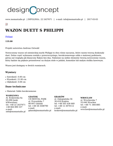 www.momastudio.pl | INFOLINIA.: 22 2437671 | e-mail: [email protected] | 2017-03-03 WAZON DUETT S PHILIPPI Philippi 119.00 Projekt autorstwa Andreas Ostwald Nowoczesny wazon od niemieckiej marki Philippi to dwa różne naczynia, które razem tworzą doskonały duet. Dolna część wykonana została z przezroczystego, borokrzemowego szkła o matowej podstawie, górna zaś wygląda jak klasyczny flakon bez dna. Nałożone na siebie elementy tworzą nowoczesny wazon, który będzie się pięknie prezentować na dużym stole w jadalni, komodzie lub małym stoliku kawowym. Wazon jest dostępny w dwóch rozmiarach. Wymiary ● ● ● Szerokość: 0.00 cm Wysokość: 21.00 cm Głębokość: 0.00 cm Dane techniczne ● Materiał: Szkło borokrzemowe WARSZAWA Al. Krakowska 6a 05-090 Janki k/Warszawy tel: +48 22 2437671 +48 664 890 337 e-mail: [email protected] GDAŃSK CH RENTAL PARK ul. Przywidzka 7 80-001 Gdańsk tel: +48 58 3508790 e-mail: [email protected] KRAKÓW ul. Zakopiańska 56 30-418 Kraków tel: +48 505 436 669 tel: +48 12 3070112 e-mail: [email protected] WROCŁAW ul. Wrocławska 7 55-040 Wrocław tel: +48 71 3461885 e-mail: [email protected]