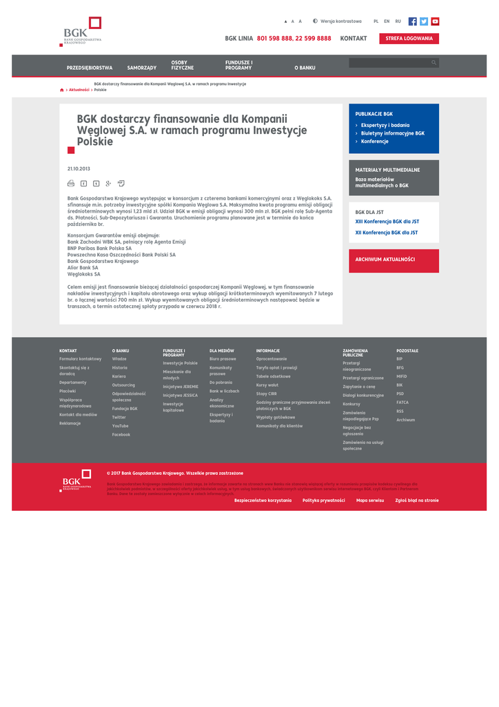 A A A Wersja kontrastowa BGK LINIA 801 598 888, 22 599 8888 PRZEDSIĘBIORSTWA SAMORZĄDY OSOBY FIZYCZNE FUNDUSZE I PROGRAMY PL KONTAKT EN RU STREFA LOGOWANIA O BANKU BGK dostarczy finansowanie dla Kompanii Węglowej S.A. w ramach programu Inwestycje AktualnościPolskie PUBLIKACJE BGK BGK dostarczy finansowanie dla Kompanii Węglowej S.A. w ramach programu Inwestycje Polskie Ekspertyzy i badania Biuletyny informacyjne BGK Konferencje 21.10.2013 MATERIAŁY MULTIMEDIALNE Baza materiałów multimedialnych o BGK PDF Bank Gospodarstwa Krajowego występując w konsorcjum z czterema bankami komercyjnymi oraz z Węglokoks S.A. sfinansuje m.in. potrzeby inwestycyjne spółki Kompania Węglowa S.A. Maksymalna kwota programu emisji obligacji średnioterminowych wynosi 1,23 mld zł. Udział BGK w emisji obligacji wynosi 300 mln zł. BGK pełni rolę Sub-Agenta ds. Płatności, Sub-Depozytariusza i Gwaranta. Uruchomienie programu planowane jest w terminie do końca października br. BGK DLA JST XIII Konferencja BGK dla JST XII Konferencja BGK dla JST Konsorcjum Gwarantów emisji obejmuje: Bank Zachodni WBK SA, pełniący rolę Agenta Emisji BNP Paribas Bank Polska SA Powszechna Kasa Oszczędności Bank Polski SA Bank Gospodarstwa Krajowego Alior Bank SA Węglokoks SA ARCHIWUM AKTUALNOŚCI Celem emisji jest finansowanie bieżącej działalności gospodarczej Kompanii Węglowej, w tym finansowanie nakładów inwestycyjnych i kapitału obrotowego oraz wykup obligacji krótkoterminowych wyemitowanych 7 lutego br. o łącznej wartości 700 mln zł. Wykup wyemitowanych obligacji średnioterminowych następować będzie w transzach, a termin ostatecznej spłaty przypada w czerwcu 2018 r. KONTAKT O BANKU Formularz kontaktowy Władze Skontaktuj się z doradcą Historia Departamenty Placówki Współpraca międzynarodowa Kontakt dla mediów Reklamacje Kariera Outsourcing Odpowiedzialność społeczna Fundacja BGK Twitter YouTube FUNDUSZE I PROGRAMY Inwestycje Polskie Mieszkanie dla młodych Inicjatywa JEREMIE Inicjatywa JESSICA Inwestycje kapitałowe DLA MEDIÓW INFORMACJE Biuro prasowe Oprocentowanie Komunikaty prasowe Taryfa opłat i prowizji Przetargi nieograniczone Tabele odsetkowe Przetargi ograniczone MIFiD Kursy walut Zapytanie o cenę BIK Stopy CIRR Dialogi konkurencyjne PSD Godziny graniczne przyjmowania zleceń płatniczych w BGK Konkursy FATCA Zamówienia niepodlegające Pzp RSS Do pobrania Bank w liczbach Analizy ekonomiczne Ekspertyzy i badania Wypłaty gotówkowe Komunikaty dla klientów Facebook ZAMÓWIENIA PUBLICZNE POZOSTAŁE BIP BFG Archiwum Negocjacje bez ogłoszenia Zamówienia na usługi społeczne © 2017 Bank Gospodarstwa Krajowego. Wszelkie prawa zastrzeżone Bank Gospodarstwa Krajowego zawiadamia i zastrzega, że informacje zawarte na stronach www Banku nie stanowią wiążącej oferty w rozumieniu przepisów kodeksu cywilnego dla jakichkolwiek podmiotów, w szczególności oferty jakichkolwiek usług, w tym usług bankowych, świadczonych użytkownikom serwisu internetowego BGK, czyli Klientom i Partnerom Banku. Dane te zostały zamieszczone wyłącznie w celach informacyjnych. Bezpieczeństwo korzystania Polityka prywatności Mapa serwisu Zgłoś błąd na stronie