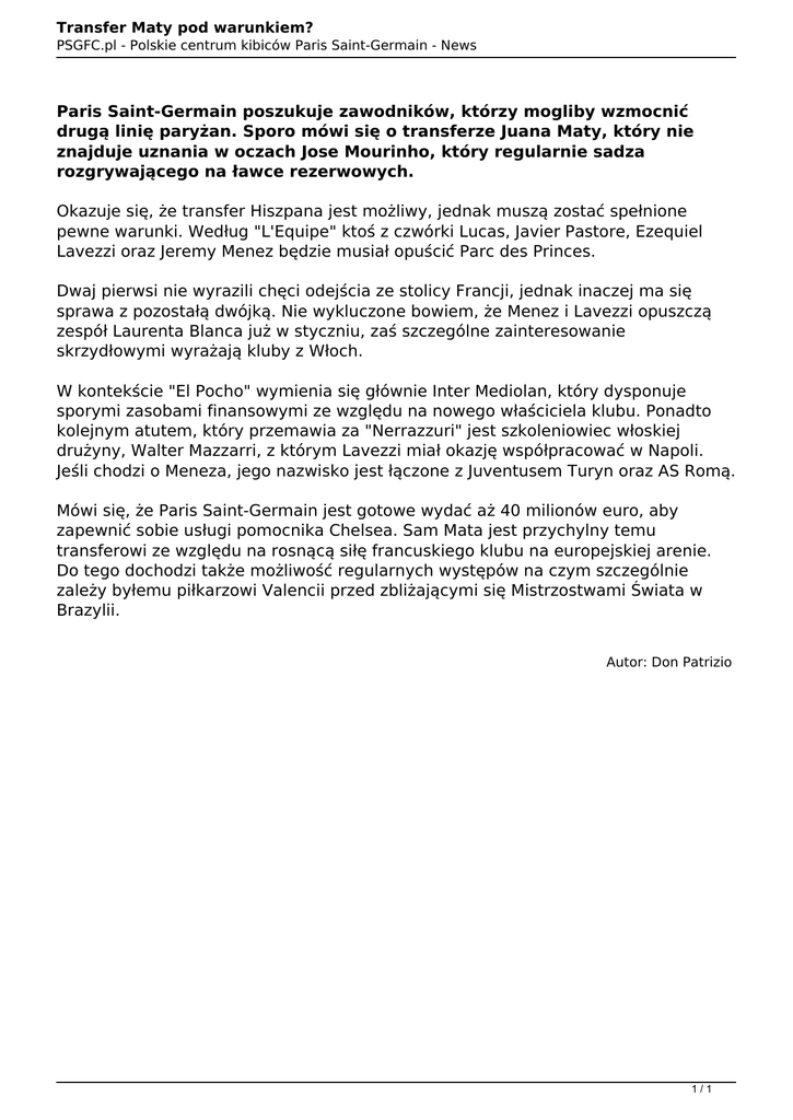 Transfer Maty pod warunkiem? PSGFC.pl - Polskie centrum kibiców Paris Saint-Germain - News Paris Saint-Germain poszukuje zawodników, którzy mogliby wzmocnić drugą linię paryżan. Sporo mówi się o transferze Juana Maty, który nie znajduje uznania w oczach Jose Mourinho, który regularnie sadza rozgrywającego na ławce rezerwowych. Okazuje się, że transfer Hiszpana jest możliwy, jednak muszą zostać spełnione pewne warunki. Według "L'Equipe" ktoś z czwórki Lucas, Javier Pastore, Ezequiel Lavezzi oraz Jeremy Menez będzie musiał opuścić Parc des Princes. Dwaj pierwsi nie wyrazili chęci odejścia ze stolicy Francji, jednak inaczej ma się sprawa z pozostałą dwójką. Nie wykluczone bowiem, że Menez i Lavezzi opuszczą zespół Laurenta Blanca już w styczniu, zaś szczególne zainteresowanie skrzydłowymi wyrażają kluby z Włoch. W kontekście "El Pocho" wymienia się głównie Inter Mediolan, który dysponuje sporymi zasobami finansowymi ze względu na nowego właściciela klubu. Ponadto kolejnym atutem, który przemawia za "Nerrazzuri" jest szkoleniowiec włoskiej drużyny, Walter Mazzarri, z którym Lavezzi miał okazję współpracować w Napoli. Jeśli chodzi o Meneza, jego nazwisko jest łączone z Juventusem Turyn oraz AS Romą. Mówi się, że Paris Saint-Germain jest gotowe wydać aż 40 milionów euro, aby zapewnić sobie usługi pomocnika Chelsea. Sam Mata jest przychylny temu transferowi ze względu na rosnącą siłę francuskiego klubu na europejskiej arenie. Do tego dochodzi także możliwość regularnych występów na czym szczególnie zależy byłemu piłkarzowi Valencii przed zbliżającymi się Mistrzostwami Świata w Brazylii. Autor: Don Patrizio 1/1 Powered by TCPDF (www.tcpdf.org)