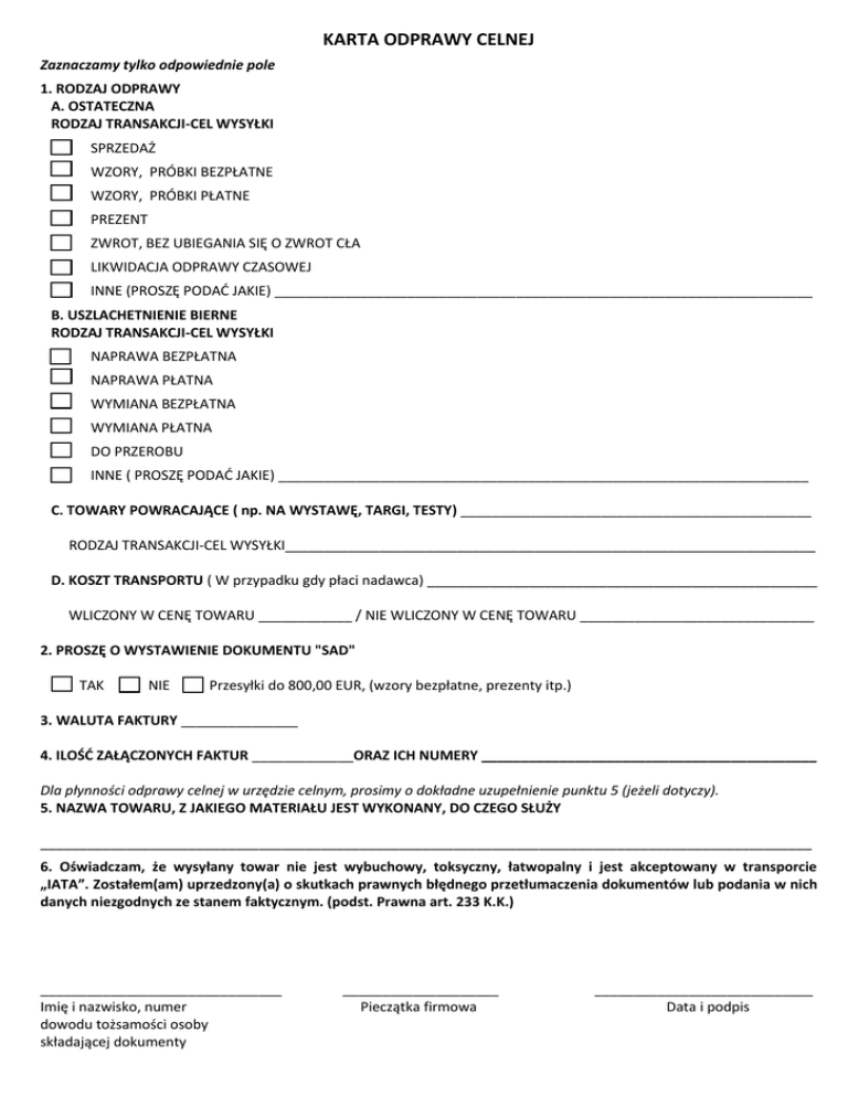 KARTA ODPRAWY CELNEJ Zaznaczamy tylko odpowiednie pole 1. RODZAJ ODPRAWY A. OSTATECZNA RODZAJ TRANSAKCJI-CEL WYSYŁKI SPRZEDAŻ WZORY, PRÓBKI BEZPŁATNE WZORY, PRÓBKI PŁATNE PREZENT ZWROT, BEZ UBIEGANIA SIĘ O ZWROT CŁA LIKWIDACJA ODPRAWY CZASOWEJ INNE (PROSZĘ PODAD JAKIE) _____________________________________________________________________ B. USZLACHETNIENIE BIERNE RODZAJ TRANSAKCJI-CEL WYSYŁKI NAPRAWA BEZPŁATNA NAPRAWA PŁATNA WYMIANA BEZPŁATNA WYMIANA PŁATNA DO PRZEROBU INNE ( PROSZĘ PODAD JAKIE) ____________________________________________________________________ C. TOWARY POWRACAJĄCE ( np. NA WYSTAWĘ, TARGI, TESTY) _____________________________________________ RODZAJ TRANSAKCJI-CEL WYSYŁKI____________________________________________________________________ D. KOSZT TRANSPORTU ( W przypadku gdy płaci nadawca) __________________________________________________ WLICZONY W CENĘ TOWARU ____________ / NIE WLICZONY W CENĘ TOWARU ______________________________ 2. PROSZĘ O WYSTAWIENIE DOKUMENTU "SAD" TAK NIE Przesyłki do 800,00 EUR, (wzory bezpłatne, prezenty itp.) 3. WALUTA FAKTURY _______________ 4. ILOŚĆ ZAŁĄCZONYCH FAKTUR _____________ORAZ ICH NUMERY ___________________________________________ Dla płynności odprawy celnej w urzędzie celnym, prosimy o dokładne uzupełnienie punktu 5 (jeżeli dotyczy). 5. NAZWA TOWARU, Z JAKIEGO MATERIAŁU JEST WYKONANY, DO CZEGO SŁUŻY ___________________________________________________________________________________________________ 6. Oświadczam, że wysyłany towar nie jest wybuchowy, toksyczny, łatwopalny i jest akceptowany w transporcie „IATA”. Zostałem(am) uprzedzony(a) o skutkach prawnych błędnego przetłumaczenia dokumentów lub podania w nich danych niezgodnych ze stanem faktycznym. (podst. Prawna art. 233 K.K.) _______________________________ Imię i nazwisko, numer dowodu tożsamości osoby składającej dokumenty ____________________ Pieczątka firmowa ____________________________ Data i podpis