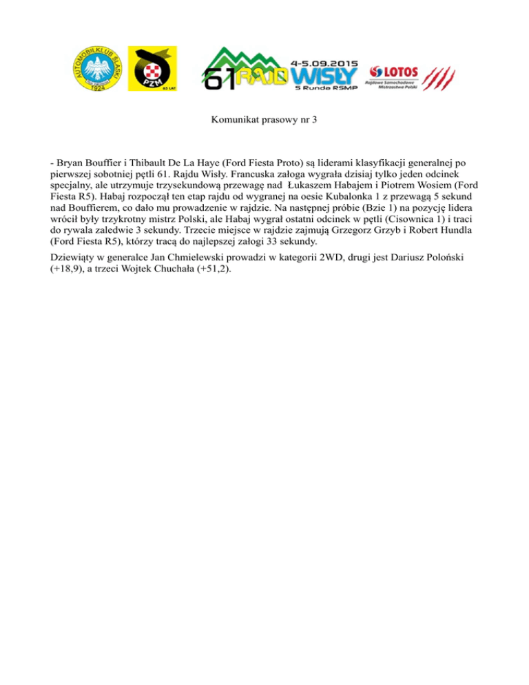 Komunikat prasowy nr 3 - Bryan Bouffier i Thibault De La Haye (Ford Fiesta Proto) są liderami klasyfikacji generalnej po pierwszej sobotniej pętli 61. Rajdu Wisły. Francuska załoga wygrała dzisiaj tylko jeden odcinek specjalny, ale utrzymuje trzysekundową przewagę nad Łukaszem Habajem i Piotrem Wosiem (Ford Fiesta R5). Habaj rozpoczął ten etap rajdu od wygranej na oesie Kubalonka 1 z przewagą 5 sekund nad Bouffierem, co dało mu prowadzenie w rajdzie. Na następnej próbie (Bzie 1) na pozycję lidera wrócił były trzykrotny mistrz Polski, ale Habaj wygrał ostatni odcinek w pętli (Cisownica 1) i traci do rywala zaledwie 3 sekundy. Trzecie miejsce w rajdzie zajmują Grzegorz Grzyb i Robert Hundla (Ford Fiesta R5), którzy tracą do najlepszej załogi 33 sekundy. Dziewiąty w generalce Jan Chmielewski prowadzi w kategorii 2WD, drugi jest Dariusz Poloński (+18,9), a trzeci Wojtek Chuchała (+51,2).