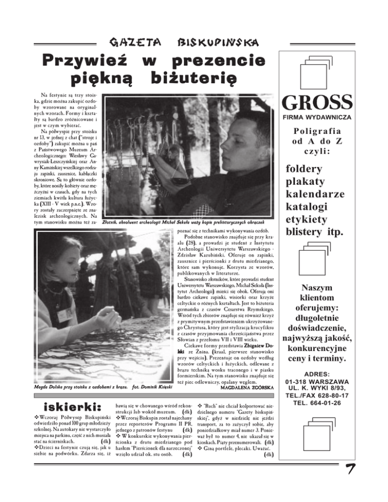 Przywieź w prezencie piękną biżuterię Na festynie są trzy stois− ka, gdzie można zakupić ozdo− by wzorowane na oryginal− nych wzorach. Formy i kszta− łty są bardzo zróżnicowane i jest w czym wybierać. Na półwyspie przy stoisku nr 13, w jednej z chat (“stroje i ozdoby”) zakupić można u pań z Państwowego Muzeum Ar− cheologicznego: Wiesławy Ga− wrysiak−Leszczyńskiej oraz An− ny Kamińskiej wszelkiego rodza− ju zapinki, zausznice, kabłączki skroniowe. Są to głównie ozdo− by, które nosiły kobiety oraz mę− żczyźni w czasach, gdy na tych ziemiach kwitła kultura łużyc− ka (XIII − V wiek p.n.e.). Wzo− ry zostały zaczerpnięte ze zna− lezisk archeologicznych. Na tym stanowisku można też za− FIRMA WYDAWNICZA Poligrafia od A do Z czyli: Złotnik, absolwent archeologii Michał Sekuła waży kopie prehistorycznych obrączek Magda Dolska przy stoisku z ozdobami z brązu. fot. Dominik Księski iskierki: LWczoraj Półwysep Biskupiński odwiedziło ponad 100 grup młodzieży szkolnej. Na autokary nie wystarczyło miejsca na parkinu, część z nich musiała stać na ścierniskach. (dk) LDzieci na festynie czują się, jak u siebie na podwórku. Zdarza się, iż poznać się z technikami wykonywania ozdób. Podobne stanowisko znajduje się przy kra− alu (28), a prowadzi je student z Instytutu Archeologii Uniwersytetu Warszawskiego − Zdzisław Kazubiński. Oferuje on zapinki, zausznice i pierścionki z drutu miedzianego, które sam wykonuje. Korzysta ze wzorów, publikowanych w literaturze. Stanowisko złotników, które prowadzi student Uniwersytetu Warszawskiego, Michał Sekuła (Ins− tytut Archeologii) mieści się obok. Oferują oni bardzo ciekawe zapinki, wisiorki oraz krzyże celtyckie o różnych kształtach. Jest to biżuteria germańska z czasów Cesarstwa Rzymskiego. Wśród tych zbiorów znajduje się również krzyż z prymitywnym przedstawieniem ukrzyżowane− go Chrystusa, który jest stylizacją krucyfiksu z czasów przyjmowania chrześcijaństwa przez Słowian z przełomu VII i VIII wieku. Ciekawe formy przedstawia Zbigniew Do− lski ze Żnina. (kraal, pierwsze stanowisko przy wejściu). Prezentuje on ozdoby według wzorów celtyckich i łużyckich, odlewane z brązu techniką wosku traconego i w piasku formierskim. Na tym stanowisku znajduje się też piec odlewniczy, opalany węglem. bawią się w chowanego wśród rekon− strukcji lub wokół muzeum. (dk) LWczoraj Biskupin został najechany przez reporterów Programu II PR, jednego z patronów festynu (dk) L W konkurskie wykonywania pier− ścionka z drutu miedzianego pod hasłem "Pierścionek dla narzeczonej" wzięło udział ok. stu osób. (dk) MAGDALENA ZGÓRSKA L "Ruch" nie chciał kolportować nie− dzielnego numeru "Gazety biskupiń− skiej", gdyż w niedzielę nie jeździ transport, za to zażyczył sobie, aby poniedziałkowy miał numer 3. Ponie− waż był to numer 4, nie ukazał się w kioskach. Piąty przenumerowali. (dk) L Giną portfele, plecaki. Uważać. (dk) foldery plakaty kalendarze katalogi etykiety blistery itp. Naszym klientom oferujemy: d³ugoletnie dowiadczenie, najwy¿sz¹ jakoæ, konkurencyjne ceny i terminy. ADRES: 01-318 WARSZAWA UL. K. WYKI 8/93, TEL./FAX 628-80-17 TEL. 664-01-26
