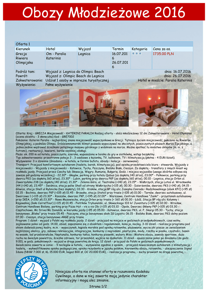 Obozy Młodzieżowe 2016 Oferta 1 Kierunek Grecja Riwiera Olimpijska Hotel Om - Paralia Katerinis Podróż tam: Powrót: Zakwaterowanie: Wyżywienie: Wyjazd z: Legnica do Olimpic Beach Wyjazd z: Olimpic Beach do Legnica Udział 1 osoby w imprezie turystycznej Pełne wyżywienie Wyjazd Legnica Termin 16.07.201 6 26.07.201 6 Kategoria Cena za os. 1735.00 PLN dnia: 16.07.2016 dnia: 26.07.2016 Hotel w mieście: Paralia Katerinis Oferta: Kraj - GRECJA Miejscowość - KATERINI PARALIA Rodzaj oferty - obóz młodzieżowy 12 dni Zakwaterowanie - Hotel Olympias (ocena obiektu - 3 słoneczka) Kod - GRE7002 Położenie: Katerini Paralia - najbardziej znana miejscowość wypoczynkowa w Grecji. Tętniąca życiem miejscowość, położona na Riwierze Olimpijskiej, u podnóża Olimpu. Śródziemnomorski klimat pozwala wypoczywać na złocistych, piaszczystych plażach Morza Egejskiego, a jednocześnie wędrować ścieżkami potężnego masywu górskiego z widokiem na morze. Można spotkać tu mnóstwo sklepów (m. in. z futrami), restauracji, kawiarni, barów szybkiej obsługi. Plaża: ok. 200 m od hotelu, piaszczysta, szeroka, wyposażona w boiska do gry w siatkówkę, wstęp bezpłatny. Typ zakwaterowania: przestronne pokoje 2-, 3-osobowe z łazienką, TV, balkonem, TV i klimatyzacją (płatna - 4 EUR/dzień). Wyżywienie: 3 x dziennie (śniadania - w hotelu, w formie bufetu, obiady i kolacje - serwowane). Transport: Przejazd komfortowym autokarem (toaleta, barek, klimatyzacja), pod opieką przedstawiciela biura - stewarda. Wyjazdy z miejscowości - Wyjazdy z miejscowości - Katowice, Tychy, Pszczyna, Bielsko Biała, Cieszyn. Za dopłatą - transfery z innych miast wg rozkładu jazdy. Przejazd przez Czechy lub Słowację, Węgry, Rumunię, Bułgarię. Godz. i miejsca wyjazdów (uwaga zbiórka odbywa się zawsze pół godziny wcześniej) - 22.30* - Głogów, parking przy hotelu Qubus (za dopłatą 140 zł/os), 23.00* - Polkowice, parking przy dworcu PKS (za dopłatą 160 zł/os), 23.30* - Lubin, parking przy dworcu PKP (za dopłatą 160 zł/os), 00.10 - Legnica, stacja Orlen ul. Jaworzyńska 238 (za dopłatą 140 zł/os). 21.30* - Jelenia Góra, ul. Teatralna (+140 zł), 23.15* - Wałbrzych, stacja Lotos ul. Wrocławska 144 (+140 zł), 23.45* - Świdnica, stacja paliw Shell od strony Wałbrzycha (+115 zł), 00.30 - Dzierżoniów, dworzec PKS (+140 zł), 04.15 Gliwice, stacja Shell ul Rybnicka (bez dopłaty), 03.30 - Kraków, stacja BP róg ulic Josepha Conrada i Radzikowskiego (obok KFC) (+95 zł) 02.15 - Bochnia, dworzec PKP (+105 zł) 01.45 - Brzesko, stacja Statoil przy trasie (+105 zł) 01.00 - Tarnów, dworzec autobusowy, ul. Dworcowa 1 (+115 zł) 23.30* - Rzeszów, dworzec PKP, (+195 zł) 22.00* - Warszawa, Centrum Handlowe "Janki" - przystanek autobusowy przy IKEA, (+250 zł) 23.30* - Rawa Mazowiecka, stacja Orlen przy trasie (+ 160 zł) 00.30 - Łódź, Stacja BP róg ulic Kolumny i Rzgowskiej (koło Carreffour) (+115 zł) 01.45 - Piotrków Trybunalski, ul. Słowackiego 103 k/ Juventuru (+105 zł) 02.00 - Wrocław, Centrum Handlowe Bielany, parking przy Pizza Hut - vis a vis Obi (+115 zł) 03.10 - Opole, Dworzec Główny PKP (+105 zł) 03.30 Częstochowa, Mc Drive/Mc Donalds, w kierunku jazdy (+95 zł) 05.00 - Katowice, dworzec PKS, ul. P. Skargi 05.30 - Tychy, stacja benzynowa „Bliska” przy trasie 05.45 - Pszczyna, stacja benzynowa obok IG Logistic 06.15 - Bielsko Biała, dworzec PKS dolny poziom 07.00 - Cieszyn, stacja benzynowa ARGE przy trasie Program: 1 dzień - wyjazd z Polski wg rozkładu jazdy. 2 dzień - przyjazd na miejsce w godzinach przedpołudniowych, czas wolny, zajmowanie pokoi od godz. 14.00, obiad, zapoznanie się z obiektem i regulaminem, kolacja, nocleg. 3-10 dzień - realizacja programu pod okiem doświadczonej kadry, m.in. - wypoczynek, kąpiele morskie pod opieką ratownika, plażowanie, wycieczki piesze ze zwiedzaniem najbliższej okolicy, gry, zabawy rekreacyjne, integracyjne, konkursy z nagrodami, plastyczne, mody, rzeźby w piasku, czystości, basen na wesoło, bal przebierańców, Neptunalia, konkursy tańca, konkursy piosenki, wybory Miss i Mistera obozu, zawody sportowe, dużo ruchu na świeżym powietrzu, ścieżka zdrowia, tor przeszkód, wyjście na dyskoteki. 11 dzień - opuszczenie pokoi po śniadaniu (do godz. 9.00), w godz. południowych - wyjazd w drogę powrotną do kraju. 12 dzień - przyjazd do Polski w godzinach popołudniowych. świadczenia zawarte w cenie: - 9 noclegów w hotelu, - wyżywienie zgodnie z opisem, - przejazd nowoczesnym autokarem z klimatyzacją i toaletą, - wykwalifikowana opieka pedagogiczna, opieka rezydenta w języku polskim, kierownika obozu, ratownika, - ubezpieczenie Signal Iduna (NNW 7.000 zł, KL 15.000 EUR, bagaż 800 zł, OC 20.000 EUR), - realizacja programu, - suchy prowiant na drogę powrotną, - Niniejsza oferta nie stanowi oferty w rozumieniu Kodeksu Cywilnego, a dane w niej zawarte mają jedynie charakter informacyjny i mogą ulec zmianie. Strona 1/2 Obozy Młodzieżowe 2016 taksę klimatyczną. Cena nie zawiera: - opłaty miejscowej w wysokości 50 zł/os./pobyt - płatnej przy rezerwacji - kaucji zwrotnej w wysokości 10 EUR/os. pobieranej przez wychowawcę na miejscu (jako zabezpieczenie przed ewentualnymi szkodami wyrządzonymi przez uczestnika obozu młodzieżowego). Opłaty obowiązkowe: - opłata miejscowa w wysokości 50 zł/os./pobyt - płatna przy rezerwacji, - kaucja zwrotna w wysokości 10 EUR/os. - pobierana przez wychowawcę na miejscu (jako zabezpieczenie przed ewentualnymi szkodami wyrządzonymi przez uczestnika obozu młodzieżowego). Legenda Wypożyczalnia sprzętu zimowego Sporty zimowe Życie nocne Klimatyzacja Żeglarstwo Ułatwienia dla niepełnosprawnych Nordic walking Jazda konna Sporty wodne Minigolf Tenis Sport Blisko lotniska Zjeżdzalnie wodne Basen kryty Basen odkryty Fitness / siłownia Hotel klubowy CityBreak Region nadmorski Bez paszportu Blisko stoku Niniejsza oferta nie stanowi ofe