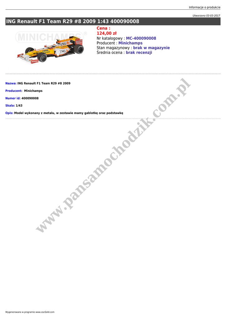 Informacje o produkcie Utworzono 03-03-2017 ING Renault F1 Team R29 #8 2009 1:43 400090008 Cena : 124,00 zł Nr katalogowy : MC-400090008 Producent : Minichamps Stan magazynowy : brak w magazynie Średnia ocena : brak recenzji .p l Nazwa: ING Renault F1 Team R29 #8 2009 Skala: 1/43 w w w .p an sa m oc ho dz ik Opis: Model wykonany z metalu, w zestawie mamy gablotkę oraz podstawkę .c Numer id: 400090008 om Producent: Minichamps Wygenerowano w programie www.oscGold.com