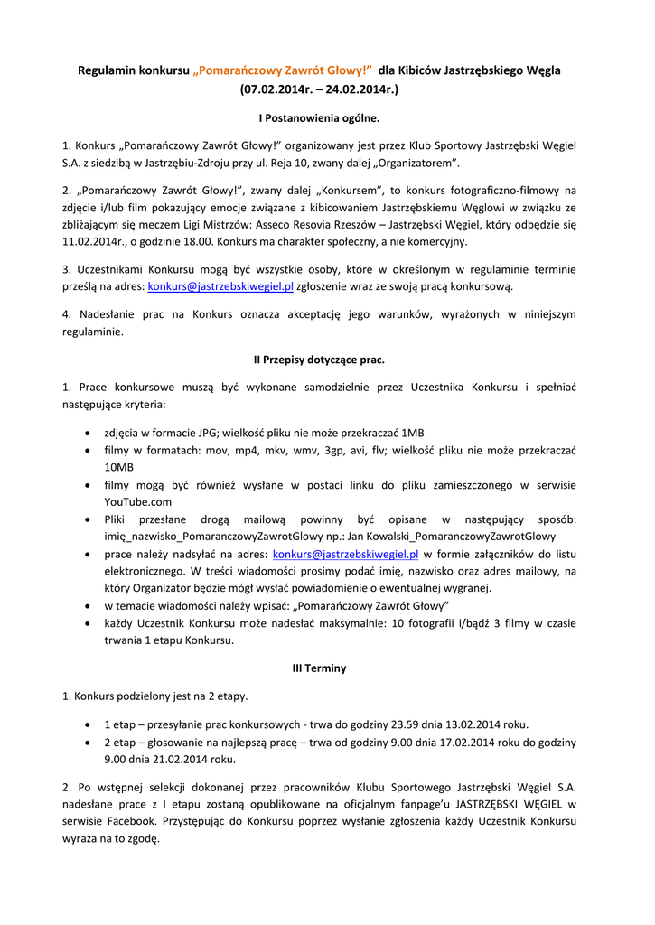 Regulamin konkursu „Pomarańczowy Zawrót Głowy!” dla Kibiców Jastrzębskiego Węgla (07.02.2014r. – 24.02.2014r.) I Postanowienia ogólne. 1. Konkurs „Pomarańczowy Zawrót Głowy!” organizowany jest przez Klub Sportowy Jastrzębski Węgiel S.A. z siedzibą w Jastrzębiu-Zdroju przy ul. Reja 10, zwany dalej „Organizatorem”. 2. „Pomarańczowy Zawrót Głowy!”, zwany dalej „Konkursem”, to konkurs fotograficzno-filmowy na zdjęcie i/lub film pokazujący emocje związane z kibicowaniem Jastrzębskiemu Węglowi w związku ze zbliżającym się meczem Ligi Mistrzów: Asseco Resovia Rzeszów – Jastrzębski Węgiel, który odbędzie się 11.02.2014r., o godzinie 18.00. Konkurs ma charakter społeczny, a nie komercyjny. 3. Uczestnikami Konkursu mogą być wszystkie osoby, które w określonym w regulaminie terminie prześlą na adres: [email protected] zgłoszenie wraz ze swoją pracą konkursową. 4. Nadesłanie prac na Konkurs oznacza akceptację jego warunków, wyrażonych w niniejszym regulaminie. II Przepisy dotyczące prac. 1. Prace konkursowe muszą być wykonane samodzielnie przez Uczestnika Konkursu i spełniać następujące kryteria: zdjęcia w formacie JPG; wielkość pliku nie może przekraczać 1MB filmy w formatach: mov, mp4, mkv, wmv, 3gp, avi, flv; wielkość pliku nie może przekraczać 10MB filmy mogą być również wysłane w postaci linku do pliku zamieszczonego w serwisie YouTube.com Pliki przesłane drogą mailową powinny być opisane w następujący sposób: imię_nazwisko_PomaranczowyZawrotGlowy np.: Jan Kowalski_PomaranczowyZawrotGlowy prace należy nadsyłać na adres: [email protected] w formie załączników do listu elektronicznego. W treści wiadomości prosimy podać imię, nazwisko oraz adres mailowy, na który Organizator będzie mógł wysłać powiadomienie o ewentualnej wygranej. w temacie wiadomości należy wpisać: „Pomarańczowy Zawrót Głowy” każdy Uczestnik Konkursu może nadesłać maksymalnie: 10 fotografii i/bądź 3 filmy w czasie trwania 1 etapu Konkursu. III Terminy 1. Konkurs podzielony jest na 2 etapy. 1 etap – przesyłanie prac konkursowych - trwa do godziny 23.59 dnia 13.02.2014 roku. 2 etap – głosowanie na najlepszą pracę – trwa od godziny 9.00 dnia 17.02.2014 roku do godziny 9.00 dnia 21.02.2014 roku. 2. Po wstępnej selekcji dokonanej przez pracowników Klubu Sportowego Jastrzębski Węgiel S.A. nadesłane prace z I etapu zostaną opublikowane na oficjalnym fanpage’u JASTRZĘBSKI WĘGIEL w serwisie Facebook. Przystępując do Konkursu poprzez wysłanie zgłoszenia każdy Uczestnik Konkursu wyraża na to zgodę. 3. Autorzy zwycięskich prac zostaną powiadomieni o wygranej w Konkursie do godziny 17.00 dnia 24.02.2014 roku przez jednokrotne wysłanie wiadomości elektronicznej na adres e-mail podany przez Uczestnika w zgłoszeniu. Lista zwycięzców zostanie opublikowana na oficjalnym fanpage’u JASTRZĘBSKI WĘGIEL w serwisie Facebook oraz stronie internetowej www.jastrzebskiwegiel.pl. IV Nagrody. 1. W Konkursie przewidziano nagrody dla autorów: 1 najlepszego zdjęcia oraz 1 najlepszego filmu. 2. Główną nagrodą w Konkursie jest przeprowadzenie przez zwycięzców wywiadu z jednym, wybranym zawodnikiem pierwszego zespołu Jastrzębskiego Węgla. Wywiady przeprowadzone przez zwycięzców Konkursu zostaną zrealizowane i zmontowane przez pracowników Klubu Sportowego Jastrzębski Węgiel S.A., a następnie opublikowane na oficjalnej stronie internetowej Klubu, profilu JASTRZĘBSKI WĘGIEL w serwisie Facebook oraz kanale w serwisie YouTube.com. 3. Zwycięzcy Konkursu zostaną wyłonieni przez Jury, którym są użytkownicy serwisu społecznościowego Facebook. Jury głosuje na zwycięską pracę poprzez użycie przycisku „Lubię to” pod wybranym zdjęciem i/lub filmem. Zwycięzcą konkursu zostanie autor zdjęcia oraz autor filmu, który otrzyma najwięcej głosów w postaci kliknięć „Lubię to”. 4. Decyzja Jury o przyznaniu nagród jest ostateczna i nie ma od niej odwołania. 5. Przyjmuje się, że osobą uprawnioną do odbioru nagrody jest osoba, której dane wskazane są w zgłoszeniu, jako Uczestnik. V Wykorzystanie prac nadesłanych na konkurs. 1. Każdy Uczestnik oświadcza, że jest autorem i posiadaczem praw autorskich do prac zgłaszanych do Konkursu. 2. Zgłoszenie prac do Konkursu jest równoznaczne z nieodpłatnym przekazaniem majątkowych praw autorskich na rzecz Organizatora oraz zgodą na nieodpłatne prezentowanie zdjęć na wystawach, w druku oraz w Internecie. 3. Zgłoszenie prac do Konkursu jest równoznaczne z udzieleniem zgody na przetwarzanie podanych przez Uczestnika danych osobowych (zgodnie z Ustawą z dnia 29 sierpnia 1997 roku, Dz.U. z 1997 Nr 133 poz. 883) w celu przeprowadzenia niniejszego konkursu, a także zgody na wykorzystanie zdjęcia przez Organizatora. 4. Osoba zgłaszająca zdjęcie do Konkursu bierze odpowiedzialność za zgodę dotyczącą wykorzystania wizerunku osób występujących na zdjęciach. VI Postanowienia końcowe. 1. Jeżeli zgłoszenie będzie niezgodnie z postanowieniami niniejszego regulaminu, praca konkursowa nie będzie rozpatrywana. 2. Organizatorzy zastrzegają sobie prawo do przerwania lub odwołania Konkursu z przyczyn niezależnych od Organizatora.