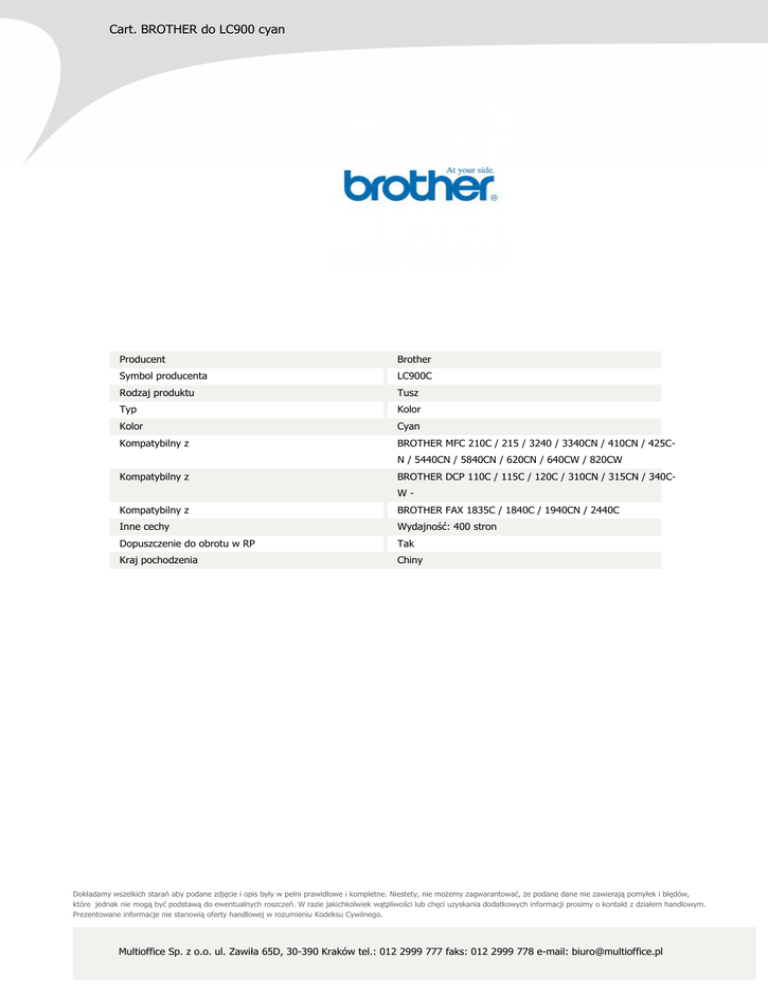 Cart. BROTHER do LC900 cyan Producent Brother Symbol producenta LC900C Rodzaj produktu Tusz Typ Kolor Kolor Cyan Kompatybilny z BROTHER MFC 210C / 215 / 3240 / 3340CN / 410CN / 425CN / 5440CN / 5840CN / 620CN / 640CW / 820CW Kompatybilny z BROTHER DCP 110C / 115C / 120C / 310CN / 315CN / 340CW- Kompatybilny z BROTHER FAX 1835C / 1840C / 1940CN / 2440C Inne cechy Wydajność: 400 stron Dopuszczenie do obrotu w RP Tak Kraj pochodzenia Chiny Dokładamy wszelkich starań aby podane zdjęcie i opis były w pełni prawidłowe i kompletne. Niestety, nie możemy zagwarantować, że podane dane nie zawierają pomyłek i błędów, które jednak nie mogą być podstawą do ewentualnych roszczeń. W razie jakichkolwiek wątpliwości lub chęci uzyskania dodatkowych informacji prosimy o kontakt z działem handlowym. Prezentowane informacje nie stanowią oferty handlowej w rozumieniu Kodeksu Cywilnego. Multioffice Sp. z o.o. ul. Zawiła 65D, 30-390 Kraków tel.: 012 2999 777 faks: 012 2999 778 e-mail: [email protected]
