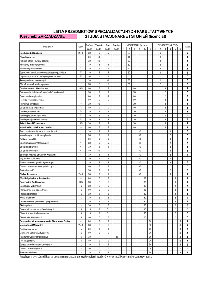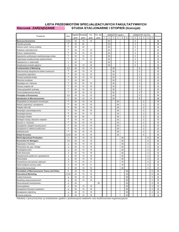 LISTA PRZEDMIOTÓW SPECJALIZACYJNYCH FAKULTATYWNYCH Kierunek: ZARZĄDZANIE STUDIA STACJONARNE I STOPIEŃ (licencjat) Ćw. Ćw. lab. godz. godz. godz. godz. 2,4,6 30 15 15 Filozofia przyrody 2 30 Historia sztuki i kultury polskiej 2 30 Podstawy makroekonomii 2 30 15 Kultura i społeczeństwo 2 30 Zagrożenia cywilizacyjne współczesnego świata 2 Organizacja współczesnego społeczeństwa Przedmiot Sem. Ogółem Wykłady SEMESTRY (godz.) 1 2 3 4 5 SEMESTRY (ECTS) 6 1 2 3 4 5 Razem 6 30 6 6 30 30 2 2 30 30 2 2 15 30 2 2 15 15 30 2 2 30 15 15 30 2 2 2 30 15 15 30 2 2 Repetytorium z matematyki 2 30 30 30 2 2 Współczesna kwestia agrarna 2 30 15 15 30 2 2 Fundamentals of Marketing Resource Economics 3,5 30 15 15 30 6 6 Dokumentacja fotograficzna badań naukowych 3 30 15 15 30 2 2 Gospodarka regionalna 3 30 15 15 30 2 2 Rozwój cywilizacji świata 3 30 15 15 30 2 2 Rolnictwo światowe 3 30 30 30 2 2 Socjologia wsi i rolnictwa 3 30 15 15 30 2 2 Obszary wiejskie UE 3 30 15 15 30 2 2 Teoria gospodarki rynkowej 3 30 15 15 30 2 2 Teoria podejmowania decyzji 3 30 15 15 30 2 2 6 Principles of Economics 3,5 30 15 15 30 6 Introduction to Microeconomics 3 30 15 15 30 6 Gospodarka na obszarach chronionych 4 30 15 15 30 2 2 Metody organizacji i zarządzania 4 30 15 15 30 2 2 Polityka rolna UE 4 30 15 15 30 2 2 Socjologia i psychologia pracy 4 30 15 15 30 2 2 Socjologia biznesu 4 30 15 15 30 2 2 Socjologia mediów 4 30 30 30 2 2 Strategie rozwoju obszarów wiejskich 4 30 15 15 30 2 2 Wycena w rolnictwie 4 30 15 15 30 2 2 Zarządzanie usługami turystycznymi 4 30 15 15 30 2 2 Zarządzanie w sektorze publicznym 4 30 15 15 30 2 2 Spółdzielczość 4 30 15 15 30 2 2 2,4,6 30 15 15 30 6 5 30 15 15 30 6 6 3-5 30 15 15 30 6 6 Negocjacje w biznesie 5 30 15 15 30 2 2 Planowanie org. gos. rolnego 5 30 15 15 30 2 2 Przedsiębiorczość 5 30 15 15 30 2 2 Rynki finansowe 5 30 15 15 30 2 2 Ubezpieczenia społeczne i gospodarcze 5 30 15 15 30 2 2 Ekoturystyka 5 30 15 15 30 2 2 Przyrodnicza rola terenów zielonych 5 15 15 0 15 2 2 Obrót środkami ochrony roślin 5 15 15 0 15 2 2 Ekonomika konsumpcji 5 30 15 15 30 2 2 Global Economy World Agricultural Production Economics for Managers 6 6 6 30 15 15 30 6 6 2,4,6 30 15 15 30 6 6 Analiza finansowa 6 30 15 15 30 2 2 Marketing usług turystycznych 6 30 15 15 30 2 2 Rachunkowość komputerowa 6 30 30 2 2 Rynek giełdowy 6 30 15 15 30 2 2 Zarządzanie finansami osobistymi 6 30 15 15 30 2 2 6 30 15 15 30 2 2 6 30 15 15 30 2 2 Foundation of Macroeconomic Theory and Policy International Marketing Zarządzanie małą firmą Finanse publiczne 30 Fakultety z powyższej listy są uruchamiane zgodnie z preferencjami studentów oraz możliwościami organizacyjnymi.