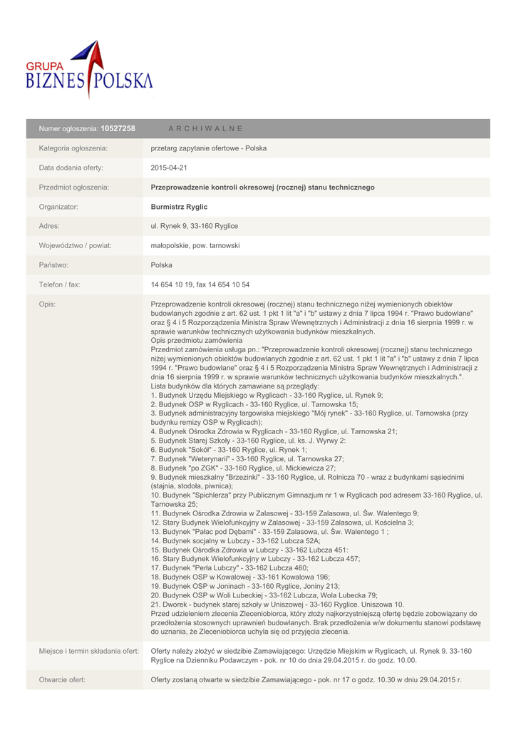 Numer ogłoszenia: 10527258 A RCHI WA L N E Kategoria ogłoszenia: przetarg zapytanie ofertowe - Polska Data dodania oferty: 2015-04-21 Przedmiot ogłoszenia: Przeprowadzenie kontroli okresowej (rocznej) stanu technicznego Organizator: Burmistrz Ryglic Adres: ul. Rynek 9, 33-160 Ryglice Województwo / powiat: małopolskie, pow. tarnowski Państwo: Polska Telefon / fax: 14 654 10 19, fax 14 654 10 54 Opis: Przeprowadzenie kontroli okresowej (rocznej) stanu technicznego niżej wymienionych obiektów budowlanych zgodnie z art. 62 ust. 1 pkt 1 lit "a" i "b" ustawy z dnia 7 lipca 1994 r. "Prawo budowlane" oraz § 4 i 5 Rozporządzenia Ministra Spraw Wewnętrznych i Administracji z dnia 16 sierpnia 1999 r. w sprawie warunków technicznych użytkowania budynków mieszkalnych. Opis przedmiotu zamówienia Przedmiot zamówienia usługa pn.: "Przeprowadzenie kontroli okresowej (rocznej) stanu technicznego niżej wymienionych obiektów budowlanych zgodnie z art. 62 ust. 1 pkt 1 lit "a" i "b" ustawy z dnia 7 lipca 1994 r. "Prawo budowlane" oraz § 4 i 5 Rozporządzenia Ministra Spraw Wewnętrznych i Administracji z dnia 16 sierpnia 1999 r. w sprawie warunków technicznych użytkowania budynków mieszkalnych.". Lista budynków dla których zamawiane są przeglądy: 1. Budynek Urzędu Miejskiego w Ryglicach - 33-160 Ryglice, ul. Rynek 9; 2. Budynek OSP w Ryglicach - 33-160 Ryglice, ul. Tarnowska 15; 3. Budynek administracyjny targowiska miejskiego "Mój rynek" - 33-160 Ryglice, ul. Tarnowska (przy budynku remizy OSP w Ryglicach); 4. Budynek Ośrodka Zdrowia w Ryglicach - 33-160 Ryglice, ul. Tarnowska 21; 5. Budynek Starej Szkoły - 33-160 Ryglice, ul. ks. J. Wyrwy 2: 6. Budynek "Sokół" - 33-160 Ryglice, ul. Rynek 1; 7. Budynek "Weterynarii" - 33-160 Ryglice, ul. Tarnowska 27; 8. Budynek "po ZGK" - 33-160 Ryglice, ul. Mickiewicza 27; 9. Budynek mieszkalny "Brzezinki" - 33-160 Ryglice, ul. Rolnicza 70 - wraz z budynkami sąsiednimi (stajnia, stodoła, piwnica); 10. Budynek "Spichlerza" przy Publicznym Gimnazjum nr 1 w Ryglicach pod adresem 33-160 Ryglice, ul. Tarnowska 25; 11. Budynek Ośrodka Zdrowia w Zalasowej - 33-159 Zalasowa, ul. Św. Walentego 9; 12. Stary Budynek Wielofunkcyjny w Zalasowej - 33-159 Zalasowa, ul. Kościelna 3; 13. Budynek "Pałac pod Dębami" - 33-159 Zalasowa, ul. Św. Walentego 1 ; 14. Budynek socjalny w Lubczy - 33-162 Lubcza 52A; 15. Budynek Ośrodka Zdrowia w Lubczy - 33-162 Lubcza 451: 16. Stary Budynek Wielofunkcyjny w Lubczy - 33-162 Lubcza 457; 17. Budynek "Perła Lubczy" - 33-162 Lubcza 460; 18. Budynek OSP w Kowalowej - 33-161 Kowalowa 196; 19. Budynek OSP w Joninach - 33-160 Ryglice, Joniny 213; 20. Budynek OSP w Woli Lubeckiej - 33-162 Lubcza, Wola Lubecka 79; 21. Dworek - budynek starej szkoły w Uniszowej - 33-160 Ryglice. Uniszowa 10. Przed udzieleniem zlecenia Zleceniobiorca, który złoży najkorzystniejszą ofertę będzie zobowiązany do przedłożenia stosownych uprawnień budowlanych. Brak przedłożenia w/w dokumentu stanowi podstawę do uznania, że Zleceniobiorca uchyla się od przyjęcia zlecenia. Miejsce i termin składania ofert: Oferty należy złożyć w siedzibie Zamawiającego: Urzędzie Miejskim w Ryglicach, ul. Rynek 9. 33-160 Ryglice na Dzienniku Podawczym - pok. nr 10 do dnia 29.04.2015 r. do godz. 10.00. Otwarcie ofert: Oferty zostaną otwarte w siedzibie Zamawiającego - pok. nr 17 o godz. 10.30 w dniu 29.04.2015 r. Termin składania: 2015-04-29 Miejsce i termin realizacji: Termin wykonania zamówienia - od dnia udzielenia zamówienia (zlecenia) do dnia 14.05.2015 r. (termin przekazania Zamawiającemu protokołów z przeglądów: do 29.05.2015 r.) Wymagania: Opis sposobu obliczania ceny 1) Wykonawca określi cenę oferty, która stanowić będzie wynagrodzenie ryczałtowe za realizację całego przedmiotu zamówienia. 2) Cena oferty brutto jest ceną ostateczną obejmującą wszystkie koszty i składniki związane z realizacją zamówienia, w tym m.in. podatek VAT, upusty, rabaty. 3) Cenę ofertową należy podać na formularzu ofertowym - wzór załącznik nr 1 do Zapytania o ofertę cenową. Cenę ofertową należy podać z dokładnością do dwóch miejsc po przecinku. Cenę oferty należy podać w zapisie liczbowym i słownie w złotych polskich. 4) Każdy z wykonawców może podać tylko jedna cenę. Opis sposobu przygotowania oferty cenowej 1) Oferta musi byś sporządzona z zachowaniem formy pisemnej pod rygorem nieważności. 2) Oferta wraz z załącznikami musi być czytelna. 3) Zaleca się, by każda zawierająca jakąkolwiek treść strona oferty była podpisana lub parafowana przez Wykonawcę. Każda poprawka w treści oferty, a w szczególności każde przerobienie, przekreślenie, uzupełnienie, nadpisanie itd. powinno być parafowane przez Wykonawcę. 4) Wykonawca ponosi wszelkie koszty związane z przygotowaniem i złożeniem oferty. 5) Na ofertę składają się: - Formularz ofertowy - wzór załącznik nr 1 do Zapytania o ofertę cenową, 6) Ofertę należy umieścić w zamkniętym opakowaniu, uniemożliwiającym odczytanie zawartości bez uszkodzenia tego opakowania. Opakowanie winno być oznaczone nazwą (firmą) i adresem Wykonawcy, zaadresowane: Urząd Miejski w Ryglicach oraz opisane: Nazwa (firma) Wykonawcy Adres Urząd Miejski w Ryglicach ul. Rynek 9 33-160 Ryglice "Przeprowadzenie kontroli okresowej (rocznej) sianu technicznego niżej wymienionych obiektów budowlanych zgodnie z art. 62 ust. I pkt I lit "a" i "b" ustawy z dnia 7 lipca 1994 r. "Prawo budowlane" oraz § 4 i 5 Rozporządzenia Ministra Spraw Wewnętrznych i Administracji z dnia 16 sierpnia 1999 r. w sprawie warunków technicznych użytkowania budynków mieszkalnych."., zamówienie publiczne nr ZP.271.2.54.2015 Nie otwierać przed terminem otwarcia ofert tj. 29.04.2015 r.. godz. 10.30 Uwagi: Opis kryteriów, którymi Zamawiający będzie się kierował przy wyborze oferty 1) Przy wyborze oferty Zamawiający kierował się będzie kryterium ceny brutto za