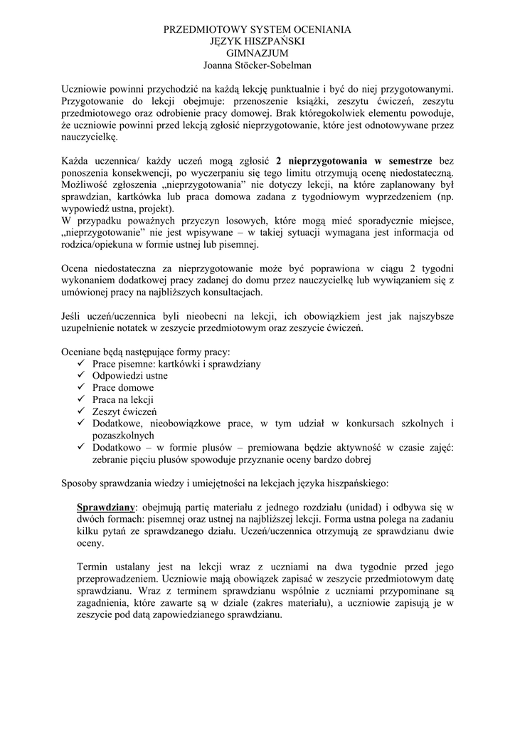 PRZEDMIOTOWY SYSTEM OCENIANIA JĘZYK HISZPAŃSKI GIMNAZJUM Joanna Stöcker-Sobelman Uczniowie powinni przychodzić na każdą lekcję punktualnie i być do niej przygotowanymi. Przygotowanie do lekcji obejmuje: przenoszenie książki, zeszytu ćwiczeń, zeszytu przedmiotowego oraz odrobienie pracy domowej. Brak któregokolwiek elementu powoduje, że uczniowie powinni przed lekcją zgłosić nieprzygotowanie, które jest odnotowywane przez nauczycielkę. Każda uczennica/ każdy uczeń mogą zgłosić 2 nieprzygotowania w semestrze bez ponoszenia konsekwencji, po wyczerpaniu się tego limitu otrzymują ocenę niedostateczną. Możliwość zgłoszenia „nieprzygotowania” nie dotyczy lekcji, na które zaplanowany był sprawdzian, kartkówka lub praca domowa zadana z tygodniowym wyprzedzeniem (np. wypowiedź ustna, projekt). W przypadku poważnych przyczyn losowych, które mogą mieć sporadycznie miejsce, „nieprzygotowanie” nie jest wpisywane – w takiej sytuacji wymagana jest informacja od rodzica/opiekuna w formie ustnej lub pisemnej. Ocena niedostateczna za nieprzygotowanie może być poprawiona w ciągu 2 tygodni wykonaniem dodatkowej pracy zadanej do domu przez nauczycielkę lub wywiązaniem się z umówionej pracy na najbliższych konsultacjach. Jeśli uczeń/uczennica byli nieobecni na lekcji, ich obowiązkiem jest jak najszybsze uzupełnienie notatek w zeszycie przedmiotowym oraz zeszycie ćwiczeń. Oceniane będą następujące formy pracy: Prace pisemne: kartkówki i sprawdziany Odpowiedzi ustne Prace domowe Praca na lekcji Zeszyt ćwiczeń Dodatkowe, nieobowiązkowe prace, w tym udział w konkursach szkolnych i pozaszkolnych Dodatkowo – w formie plusów – premiowana będzie aktywność w czasie zajęć: zebranie pięciu plusów spowoduje przyznanie oceny bardzo dobrej Sposoby sprawdzania wiedzy i umiejętności na lekcjach języka hiszpańskiego: Sprawdziany: obejmują partię materiału z jednego rozdziału (unidad) i odbywa się w dwóch formach: pisemnej oraz ustnej na najbliższej lekcji. Forma ustna polega na zadaniu kilku pytań ze sprawdzanego działu. Uczeń/uczennica otrzymują ze sprawdzianu dwie oceny. Termin ustalany jest na lekcji wraz z uczniami na dwa tygodnie przed jego przeprowadzeniem. Uczniowie mają obowiązek zapisać w zeszycie przedmiotowym datę sprawdzianu. Wraz z terminem sprawdzianu wspólnie z uczniami przypominane są zagadnienia, które zawarte są w dziale (zakres materiału), a uczniowie zapisują je w zeszycie pod datą zapowiedzianego sprawdzianu. Sprawdzian poprzedza lekcja powtórzeniowa. Jeśli uczennica/uczeń nadal ma wątpliwości dotyczące sprawdzianu, zobowiązani są do przyjścia na najbliższe konsultacje, celem wyjaśnienia niejasności. Każdy sprawdzian jest obowiązkowy, w przypadku nieobecności uczeń ma obowiązek po przyjściu do szkoły umówić się na najbliższy możliwy termin pisania. W przypadku otrzymania oceny niedostatecznej, uczeń/uczennica mają obowiązek poprawienia oceny w terminie dwóch tygodni od jej uzyskania; poprawa może się odbyć tylko raz. W przypadku otrzymania oceny dopuszczającej, uczeń/uczennica może poprawić ocenę w ciągu dwóch tygodni od jej uzyskania. Poprawy odbywają się na konsultacjach. Ostateczna ocena ze sprawdzianu jest uśrednieniem oceny z pierwszego i jego poprawy. Uczeń/uczennica, który oszukuje w trakcie sprawdzianu i kartkówki, otrzymuje ocenę niedostateczną bez możliwości poprawy. Kartkówki: obejmują partię materiału najwyżej z trzech ostatnich lekcji. Ta forma sprawdzania wiadomości jest zawsze zapowiedziana. Każda kartkówka musi być wklejona do zeszytu, i jej pisemna poprawa traktowana jest, jako praca domowa, która musi być wykonana na najbliższą lekcję, jeśli nie zostanie to ustalone inaczej. Pisemna poprawa obejmuje prawidłowe zapisanie zwrotów/słówek w zeszycie. Kartkówki oceniane są w skali 1-5. W ciągu tygodnia od uzyskania oceny, uczeń/uczennica mają prawo do poprawienia oceny niedostatecznej i dopuszczającej. Uczeń/uczennica ma prawo do poprawienia ocen niedostatecznej i dopuszczającej na konsultacjach w ciągu tygodnia od uzyskania oceny. Prace domowe: mogą mieć formę pisemną lub ustną i są oceniane w skali 1-6 lub za pomocą + i -. Aktywność na lekcji: oceniania na bieżąco znakami + lub minus -. Pięć plusów równa się ocenie bardzo dobrej. Cztery minusy równają się z oceną niedostateczną. Minusy są przyznawane, jeśli ktoś nie uważa na lekcji. Odpowiedź ustna: pytania – podobnie, jak w przypadku kartkówki - mogą dotyczyć materiału z trzech ostatnich lekcji i oceniane są w skali 1-6 lub za pomocą + i -. Prace semestralne: dodatkowe obowiązkowe i nieobowiązkowe prace przygotowywane przez uczniów, sprawdzane pod koniec semestru, oceniane w skali 1-6. Zeszyt ćwiczeń – zadania sprawdzane pod kątem merytorycznej zawartości ze zwróceniem uwagi na estetykę wykonania ćwiczenia i oceniane są w skali 1-6 lub za pomocą + i -. Ocena: Oceny są jawne, wystawiane według ustalonych kryteriów, umieszczane regularnie w e-dzienniczku. Sprawdziany nie są oddawane uczniom do domu, ponieważ stanowią dokumentację postępów uczniów, ale są udostępniane rodzicom/opiekunom w czasie dni otwartych lub indywidualnych spotkań, jeśli wyrażą taką wolę. Uczniowie informowani są o zagrożeniu oceną niedostateczną co najmniej miesiąc przed Radą Klasyfikacyjną. W sytuacji, gdy ocena semestralna lub końcowa waha się między dwoma stopniami, uczniowie mogą starać się o ocenę wyższą – w takim przypadku warunki pracy są ustalane indywidualnie. Przewidywana ocena semestralna i roczna podawana jest do wiadomości uczniom na dwa tygodnie przed Radą Klasyfikacyjną. Ocena może ulec zmianie. W tym celu należy w przeciągu tygodnia od czasu, kiedy uczniowie zostali poinformowani o ocenie, zgłosić zamiar jej poprawiania. Ocena może być poprawiona o jeden stopień i nie dotyczy 