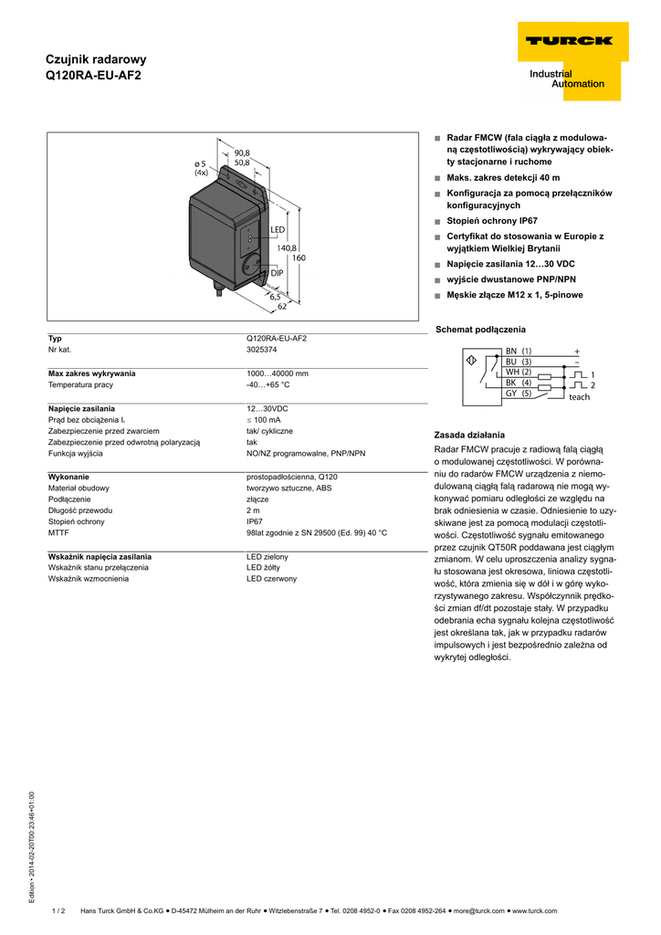 Czujnik radarowy Q120RA-EU-AF2 ■ ■ ■ ■ ■ Q120RA-EU-AF2 3025374 Max zakres wykrywania Temperatura pracy 1000…40000 mm -40…+65 °C Napięcie zasilania Prąd bez obciążenia I0 Zabezpieczenie przed zwarciem Zabezpieczenie przed odwrotną polaryzacją Funkcja wyjścia 12…30VDC ð 100 mA tak/ cykliczne tak NO/NZ programowalne, PNP/NPN Wykonanie Materiał obudowy Podłączenie Długość przewodu Stopień ochrony MTTF prostopadłościenna, Q120 tworzywo sztuczne, ABS złącze 2m IP67 98lat zgodnie z SN 29500 (Ed. 99) 40 °C Wskaźnik napięcia zasilania Wskaźnik stanu przełączenia Wskaźnik wzmocnienia LED zielony LED żółty LED czerwony Maks. zakres detekcji 40 m Konfiguracja za pomocą przełączników konfiguracyjnych Stopień ochrony IP67 Certyfikat do stosowania w Europie z wyjątkiem Wielkiej Brytanii ■ Napięcie zasilania 12…30 VDC ■ wyjście dwustanowe PNP/NPN ■ Męskie złącze M12 x 1, 5-pinowe Schemat podłączenia Zasada działania Radar FMCW pracuje z radiową falą ciągłą o modulowanej częstotliwości. W porównaniu do radarów FMCW urządzenia z niemodulowaną ciągłą falą radarową nie mogą wykonywać pomiaru odległości ze względu na brak odniesienia w czasie. Odniesienie to uzyskiwane jest za pomocą modulacji częstotliwości. Częstotliwość sygnału emitowanego przez czujnik QT50R poddawana jest ciągłym zmianom. W celu uproszczenia analizy sygnału stosowana jest okresowa, liniowa częstotliwość, która zmienia się w dół i w górę wykorzystywanego zakresu. Współczynnik prędkości zmian df/dt pozostaje stały. W przypadku odebrania echa sygnału kolejna częstotliwość jest określana tak, jak w przypadku radarów impulsowych i jest bezpośrednio zależna od wykrytej odległości. Edition • 2014-02-20T00:23:46+01:00 Typ Nr kat. Radar FMCW (fala ciągła z modulowaną częstotliwością) wykrywający obiekty stacjonarne i ruchome 1/2 Hans Turck GmbH & Co.KG ñ D-45472 Mülheim an der Ruhr ñ Witzlebenstraße 7 ñ Tel. 0208 4952-0 ñ Fax 0208 4952-264 ñ [email protected] ñ www.turck.com Czujnik radarowy Q120RA-EU-AF2 Akcesoria montażowe Typ Nr kat. SMB30A 3032723 Rysunek wymiarowy Uchwyt montażowy, stal nierdzewna, dla czujników z gwintem 30 mm SMB30MM 3027162 Uchwyt montażowy, prostopadłościenny, stal nierdzewna, dla czujników z gwintem 30 mm, szerokie otwory dla dokładnego wyrównania SMB30SC 3052521 Uchwyt montażowy, czarny PBT; dla gwintu 30 mm; z czterema śrubami M5 x 0,8 Akcesoria - funkcja Typ Nr kat. SMBWSQ120 3026881 BRTR-CC20E 3011118 Rysunek wymiarowy Schutzkappe, verhindert Wasserfilm oder Eisbildung auf der aktiven Fläche, benötigt bei Regen oder Schnee Radar Reflektor, großer Tetraeder, geschützt durch Plastikgehäuse, 7-fache Funktionsreserve bei 6 m Abstand, Edition • 2014-02-20T00:23:46+01:00 optional 2/2 Hans Turck GmbH & Co.KG ñ D-45472 Mülheim an der Ruhr ñ Witzlebenstraße 7 ñ Tel. 0208 4952-0 ñ Fax 0208 4952-264 ñ [email protected] ñ www.turck.com