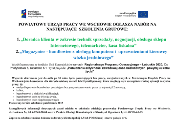 POWIATOWY URZĄD PRACY WE WSCHOWIE OGŁASZA NABÓR NA NASTĘPUJĄCE SZKOLENIA GRUPOWE: 1. „Doradca klienta w zakresie technik sprzedaży, negocjacji, obsługa sklepu Internetowego, telemarketer, kasa fiskalna” 2. „Magazynier - handlowiec z obsługą komputera i uprawnieniami kierowcy wózka jezdniowego” Współfinansowane ze środków Unii Europejskiej w ramach Regionalnego Programu Operacyjnego – Lubuskie 2020, Oś Priorytetowa 6, Działanie 6.1 Tytuł projektu: „Pobudzenie aktywności zawodowej osób bezrobotnych powyżej 30 roku życia” Wsparcie skierowane jest do osób po 30 roku życia pozostających bez pracy, zarejestrowanych w Powiatowym Urzędzie Pracy we Wschowie jako bezrobotne dla których ustalony został I lub II profil pomocy, które znajdują się w szczególnie trudnej sytuacji na rynku pracy, tj.: osoby długotrwale bezrobotne- pozostające bez pracy nieprzerwanie przez co najmniej 12 miesięcy, kobiet, bezrobotnych o niskich kwalifikacjach, bezrobotnych osób po 50 roku życia, bezrobotnych osób niepełnosprawnych Planowany termin szkolenia: październik 2015 Szczegółowych informacji dotyczących zasad udziału w szkoleniu udzielają pracownicy Powiatowego Urzędu Pracy we Wschowie, ul. Łazienna 2a, tel. 65/540-28-68 oraz w Punkcie Obsługi Bezrobotnych w Sławie, ul. Ogrodowa 1, tel. 68/356-65-05. Zapisu na szkolenie można dokonać u doradcy klienta (pokój 1,3 lub POB Sława) oraz w pokoju nr 6.