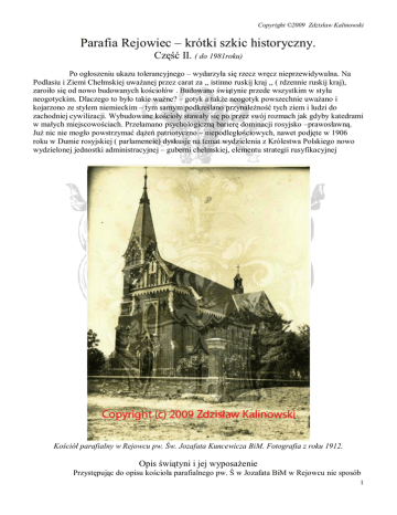 Copyright ©2009 Zdzisław Kalinowski Parafia Rejowiec – krótki szkic historyczny. Część II. ( do 1981roku) Po ogłoszeniu ukazu tolerancyjnego – wydarzyła się rzecz wręcz nieprzewidywalna. Na Podlasiu i Ziemi Chełmskiej uważanej przez carat za ,, istinno ruskij kraj ,, ( rdzennie ruskij kraj), zaroiło się od nowo budowanych kościołów . Budowano świątynie przede wszystkim w stylu neogotyckim. Dlaczego to było takie ważne? – gotyk a także neogotyk powszechnie uważano i kojarzono ze stylem niemieckim – tym samym podkreślano przynależność tych ziem i ludzi do zachodniej cywilizacji. Wybudowane kościoły stawały się po przez swój rozmach jak gdyby katedrami w małych miejscowościach. Przełamano psychologiczną barierę dominacji rosyjsko –prawosławną. Już nic nie mogło powstrzymać dążeń patriotyczno – niepodległościowych, nawet podjęte w 1906 roku w Dumie rosyjskiej ( parlamencie) dyskusje na temat wydzielenia z Królestwa Polskiego nowo wydzielonej jednostki administracyjnej – guberni chełmskiej, elementu strategii rusyfikacyjnej Kościół parafialny w Rejowcu pw. Św. Jozafata Kuncewicza BiM. Fotografia z roku 1912. Opis świątyni i jej wyposażenie Przystępując do opisu kościoła parafialnego pw. Ś w Jozafata BiM w Rejowcu nie sposób 1 Copyright ©2009 Zdzisław Kalinowski jeszcze raz nie wspomnieć o fundatorach tego kościoła i wielkim skrócie przypomnieć o trudnościach jego budowy. Wybrałem niewielkie fragmenty wspomnień na ten temat spisane przez ks. Bronisława Zakrzewskiego. W swoich notatkach zapisał: (…) ,, Duże rozmiary jak na kaplicę, nigdzie w rozmowach jak i dokumentach nie padło słowo kościół. Było to celowe działanie, Moskale na budowę obszernego kościoła zgodzić się nie chcieli 1, przedstawiony był przeto projekt budowy kaplicy, żeby łatwiej można było uzyskać zatwierdzenie planu a zrealizować inną wersję opracowaną również przez Stefana Szyllera- wersję dużego kościoła,,. (…) ,, Mieszkańcy okoliczni 2 niczym nie przyczynili się do budowy , jeżeli zwozili cegłę i wapno, to pobierali zapłatę za pracę swoją 3,, Kwit z 1912 roku wystawiony na nazwisko Anieli Kossowskiej z Rejowca potwierdzający Z ,,Kroniki Rejowca,, - (…),,duchowieństwo prawosławne nie życzyło sobie nowych parafii katolickich na terenie Chełmszczyzny pomimo wiekopomnego aktu monarchy rosyjskiego jakim był ukaz z 30 (17) kwietnia 1905 r., darzący poddanych dobrodziejstwem szerokiej, szczerej tolerancji religijnej: - Rozkazujemy uznać, że odpadnięcie od religii prawosławnej do innej religii chrześcijańskiej lub nauki nie podlega prześladowaniu i nie powinno pociągać za sobą żadnych następstw, szkodzących pod względem praw osobistych i cywilnych, przy czym osoba, która po dojściu do pełnoletniości odpadła od prawosławia, uznawana jest za należącą do tego wyznania lub nauki, jaką sobie sama obrała...- . Tak brzmi pierwszy punkt wysokiego słowa cesarskiego,, . 2 Znacząca większość w owym czasie to wyznawcy prawosławia. Po drugie spora grupa katolików uważała, że nie należy budować kościoła w Rejowcu, wystarczy, że jest w Pawłowie i nie będą łożyć na jego budowę. 3 Przyczyną takiego stanu rzeczy było zapewne to, że rozgłaszano, iż jest to prywatna kaplica grobowa Budnych i niech sami sobie ją wystawiają. Po drugie w siedzibie parafii w Pawłowie poczyniono starania do rozpoczęcia budowy nowego murowanego kościoła w miejsce drewnianego z roku 1744, za małego jak na potrzeby rozległej terytorialnie parafii. Każdy parafianin był zobligowany do wpłacenia stosownej na ten cel opłaty pieniężnej. Nowy kościół parafialny w Pawłowie budowano w latach 1909- 1912. 1 2 Copyright ©2009 Zdzisław Kalinowski dokonanie wpłaty na budowę nowego kościoła parafialnego w Pawłowie. Tak wspominał ten czas ks. Bronisław Zakrzewski. Jesienią 1907 roku budowę zakończono. Był to tzw. stan surowy. Przed fundatorami stanął ogrom pracy związanej z wykończeniem wnętrza odpowiedniego jej wyposażenia, które pochłonęło dużo pieniędzy. W dniu 8 stycznia 1908 roku ks. Wincenty Hartman dziekan dekanatu chełmskiego dokonał uroczystego poświęcenia kościoła. W uroczystości uczestniczyło 10 księży. W czasie uroczystości dyrektor Cukrowni Rejowiec Apolinary Machczyński grał na skrzypcach 4 ,, Ave Maria,, Gounoda 5. Słynną arię śpiewał przybyły na tą uroczystość chór z Chełma. Kościół, jako bryła architektoniczna oraz jego wyposażenie zostało wpisane do rejestru zabytków. Pobudowany na planie krzyża łacińskiego, na, który składają się: jednonawowy korpus z wyższym frontowym ryzalitem i wieży przy południowym boku.. Oś krzyża przebiega z zachodu na wschód. Prezbiterium skierowane na zachód, w, którym występują dwie prostokątne zakrystie po bokach a nad nimi loże. Na planie ramion krzyża dwie kaplice. Kaplice i prezbiterium mają rzuty prostokątów. Wysoka pięciokondygnacyjna wieża czworoboczna zakończona trójkątnymi szczytami, nakryta ostrosłupową iglicą. Nad prezbiterium wieżyczka na sygnaturkę. Kościół pokryty jest dachem dwuspadowym (niegdyś dachówka, obecnie blacha ocynkowana i pomalowana). Do kościoła prowadzą cztery wejścia. Główne dwuskrzydłowe drzwi wejściowe umieszczone zostały na osi fasady o kształcie ostrołukowym. Pozostałe wejścia do zakrystii, kruchty bocznej oraz wieży prostokątne. Otwory okienne oraz prześwity drzwiowe maja ostro łukowe wykroje. Ściany kościoła murowane z cegły. Zewnętrzne nietynkowane podniesione na wysokim cokole z ciemniejszej cegły. Cokół odcięty od góry ścian betonowym kształtowanym gzymsem. Ukształtowane są też i inne betonowe gzymsy, uskoki skarp i armaturowe fryzy oraz obramienia niektórych otworów. Bardzo dobry efekt daje zestawienie cegły i jasnego betonu w postaci fryzów, gzymsów, obramień okiennych, 