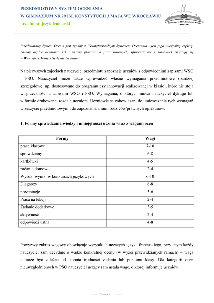 PRZEDMIOTOWY SYSTEM OCENIANIA W GIMNAZJUM NR 29 IM. KONSTYTUCJI 3 MAJA WE WROCŁAWIU przedmiot: język francuski Przedmiotowy System Ocenia jest zgodny z Wewnątrzszkolnym Systemem Oceniania i jest jego integralną częścią. Zasady ogólne oceniania jak i zasady planowania prac klasowych, sprawdzianów i kartkówek znajdują się w Wewnątrzszkolnym Systemie Oceniania. Na pierwszych zajęciach nauczyciel przedmiotu zapoznaje uczniów z odpowiednimi zapisami WSO i PSO. Nauczyciel może także wprowadzić własne wymagania przedmiotowe (bardziej szczegółowe, np. dostosowane do programu czy innowacji realizowanej w klasie), które nie stoją w sprzeczności z zapisami WSO i PSO. Wymagania, o których mowa nauczyciel dyktuje lub w formie drukowanej rozdaje uczniom. Uczniowie są zobowiązani do umieszczenia tych wymagań w zeszycie przedmiotowym i do zapoznania z nimi rodziców/prawnych opiekunów. 1. Formy sprawdzania wiedzy i umiejętności ucznia wraz z wagami ocen Formy Wagi prace klasowe 7-10 sprawdziany 6-8 kartkówki 4-5 zadania domowe 2-4 Wysoki wynik w konkursach językowych 6-10 Diagnozy 6-8 prezentacje 3-6 Praca na lekcji 2-4 Zadanie dodatkowe 3-5 aktywność 2-4 odpowiedź ustna 4-8 Powyższy zakres wagowy obowiązuje wszystkich uczących języka francuskiego, przy czym każdy nauczyciel sam decyduje o wadze konkretnej oceny (w wyżej przewidzianych ramach) – waga ta może być zależna od stopnia trudności zadania lub poziomu klasy. Dla kategorii ocen nieuwzględnionych w PSO nauczyciel uczący sam ustala wagę, o której informuje uczniów. Strona 1 PRZEDMIOTOWY SYSTEM OCENIANIA W GIMNAZJUM NR 29 IM. KONSTYTUCJI 3 MAJA WE WROCŁAWIU przedmiot: język francuski 2. Zasady oceniania prac klasowych i sprawdzianów Liczba zdobytych punktów w procentach ocena 100 - 90 5 89 - 85 5- 89 - 85 4+ 79 - 75 4 74 - 70 4- 69 - 65 3+ 64 - 60 3 59 - 55 3- 54 - 45 2+ 44 - 37 2 36 - 30 2- 29 - 0 1 Ocenę celującą otrzymuje uczeń, który uzyskał ocenę bardzo dobrą i poprawnie rozwiązał zadanie dodatkowe. Nie wszystkie prace kontrolne są oceniane w tej skali, część sprawdzianów i kartkówek jest oceniana w skali bardzo dobry – niedostateczny. Nie wszystkie prace są punktowane, za część prac nauczyciel wystawia ocenę i uzasadnia ją w formie pisemnej lub ustnej. 3. Liczba dopuszczalnych nieprzygotowań (na semestr): 2 4. Wymagania edukacyjne na poszczególne oceny semestralne i roczne ocena celująca Średnia ocen ucznia wynosi minimum 5.0 oraz uczeń wykonał większość zadań dodatkowych. Uczeń posiada wiadomości wykraczające poza program nauczania; w sytuacjach Strona 2 stosuje nietypowych; wiadomości osiąga sukcesy PRZEDMIOTOWY SYSTEM OCENIANIA W GIMNAZJUM NR 29 IM. KONSTYTUCJI 3 MAJA WE WROCŁAWIU przedmiot: język francuski w konkursach pozaszkolnych; wykazuje dużą aktywność w czasie zajęć oraz zainteresowanie językiem poza zajęciami. ocena bardzo dobra Uczeń w pełnym zakresie opanował wiadomości i umiejętności programowe. Zdobytą wiedzę potrafi poprawnie zastosować w codziennej komunikacji. Rozwiązuje samodzielnie zadania o dużym stopniu trudności, ale w zakresie programu. Wykazuje dużą aktywność w czasie zajęć oraz zainteresowanie językiem poza zajęciami. ocena dobra Uczeń w dużym zakresie opanował wiadomości określone programem nauczania. Potrafi zdobyte zastosować do rozwiązywania zadań wiadomości typowych lub problemowych. Aktywnie pracuje w czasie zajęć lekcyjnych. ocena dostateczna Uczeń opanował w zakresie podstawowym wiadomości programem i umiejętności nauczania. określone zastosować Potrafi wiadomości do rozwiązywania zadań z pomocą nauczyciela. ocena dopuszczająca Uczeń posiada braki i umiejętnościach w wiadomościach określonych programem nauczania, ale nie przekreślają one dalszego kształcenia. Rozwiązuje podstawowe zagadnienia z pomocą nauczyciela. ocena niedostateczna Uczeń nie opanował wiadomości i umiejętności koniecznych do dalszego kształcenia. Nie potrafi rozwiązywać zadań o podstawowym stopniu trudności nawet przy pomocy nauczyciela. Nie potrafi ułożyć poprawnych zdań w języku obcym. Strona 3 PRZEDMIOTOWY SYSTEM OCENIANIA W GIMNAZJUM NR 29 IM. KONSTYTUCJI 3 MAJA WE WROCŁAWIU przedmiot: język francuski Zgodnie z rozporządzeniem Ministra Edukacji Narodowej z dnia 30 kwietnia 2013 roku w sprawie zasad udzielania i organizacji pomocy psychologiczno-pedagogicznej w publicznych przedszkolach, szkołach i placówkach (Dz.U. 2013 poz. 532) przy ocenianiu uczniów uwzględnia się zalecenia wynikające z opracowanych indywidualnych lub grupowych programów pomocy psychologiczno-pedagogicznej oraz Indywidualnych Programów Edukacyjno – Terapeutycznych. 5. Klasyfikacja semestralna i roczna Przy ustalaniu oceny klasyfikacyjnej z zajęć edukacyjnych nauczyciel kieruje się zasadami wyszczególnionymi w WSO. W sytuacji, gdy uczeń uzyskał oceny ze wszystkich obowiązkowych form sprawdzania wiedzy i umiejętności, ocena klasyfikacyjna nie może być niższa od średniej ważonej: ocena dopuszczająca – od 1,60 ocena dostateczna – od 2,60 ocena dobra – od 3,60 ocena bardzo dobra - od 4,60 ocena celująca – nie obowiązuje 6. Zmiany w PSO dokonywane są na wniosek członków zespołu przedmiotowego na podstawie ewaluacji PSO i WSO oraz pojawiających się zmian w przepisach prawa oświatowego mających wpływ na ocenianie, klasyfikowanie i promowanie uczniów. Strona 4