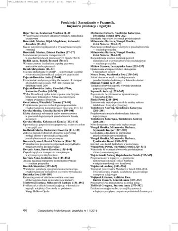 GMiL_Edukacja ekon.qxd 23-10-2016 13:51 Page 44 Produkcja i Zarządzanie w Przemyśle. Inżynieria produkcji i logistyka Bajor Teresa, Krakowiak Marlena [1–10] Wykorzystanie systemów informatycznych w zarządzaniu kryzysowym Brzeziński Marian, Kijek Magdalena, Zelkowski Jarosław [11–26] Ocena systemów logistycznych z wykorzystaniem logiki rozmytej Brzeziński Marian, Zdunek Paulina [27–37] Modelowanie procesów transportowych w przedsiębiorstwach przewozowych branży FMCG Budzik Anna, Budzik Ryszard [38–45] Wybrane prawne i techniczne aspekty przewozu materiałów niebezpiecznych Dąbek Małgorzata [46–54] Mierniki statystyczne w LSEIP — logistycznym systemie elektronicznej identyfikacji pacjenta w przychodni Fajczak-Kowalska Anita [55–64] Econometric analysis regarding the volume of transport of goods by rail in years 1995–2014 within the timeframe until 2030 Fajczak-Kowalska Anita, Ziemiński Piotr, Rudowska Paulina [65–78] Wpływ liberalizacji rynku lotniczego na rozwój rynku przewozów lotniczych w Polsce oraz możliwość regresu związana z Brexitem Gola Łukasz, Wierzbicki Tomasz [79–89] Projektowanie procesu technologicznego montażu z wykorzystaniem komputerowego programu Creo 2.0 Górska Monika, Gruszka Barbara [90–101] Efekty eliminacji wybranych typów marnotrawstwa w procesach logistycznych przedsiębiorstw branży metalowej Górska Monika, Kokoszczyk Kamila [102–114] Optymalizacja gospodarki magazynowej z wykorzystaniem koncepcji Lean Kadłubek Marta, Baskiewicz Nicoletta [115–125] Zakres i poziom wybranych obszarów logistycznej obsługi klienta w procesach zarządzania przedsiębiorstwami transportowymi Knosala Ryszard, Rostek Michaela [126–134] Produktywność procesów logistycznych na przykładzie przedsiębiorstwa produkcyjnego Korczak Anna, Baron Karolina [135–144] Czynniki ryzyka w transporcie zewnętrznym w wybranym przedsiębiorstwie Korczak Anna, Kulińska Ewa [145–156] Analiza realizacji transportu ponadnormatywnego — studium przypadku Krenich Stanisław [157–167] Walidacja i symulacja oprogramowania sterującego z wykorzystaniem wirtualnych systemów wytwarzania Kulińska Ewa [168–180] Estimating costs of risk factors within structures of the logistics chain in metallurgical industry Masłowski Dariusz, Miłaszewicz Barbara [181–191] Problematyka układu komunikacyjnego w kontekście logistyki miejskiej. Case study na podstawie Wyspy Bolko w Opolu 44 Michlowicz Edward, Smolińska Katarzyna, Zwolińska Bożena [192–202] Inżynieria logistyki w systemach produkcyjnych Miłaszewicz Barbara, Wengel Monika, Zelek Natalia [203–213] Planowanie potrzeb materiałowych w przedsiębiorstwie — studium przypadku Miłaszewicz Barbara, Wengel Monika, Zelek Natalia [214–222] Racjonalizacja kosztów realizacji potrzeb materiałowych w przedsiębiorstwie produkcyjnym — studium przypadku Mitkow Szymon, Leszczyńska Anna [223–237] Opakowania a bezpieczeństwo ekologiczne w łańcuchach dostaw Nonas Beata, Staniewska Ewa [238–246] Jakość dostaw w aspekcie funkcjonowania przedsiębiorstwa hutniczego w łańcuchu dostaw Stajniak Maciej [247–254] Tendencje rozwoju logistyki w świetle przemian gospodarki globalnej Szymonik Andrzej [255–267] Zapewnienie bezpieczeństwa żywnościowego w łańcuchu dostaw Ślaski Paweł [268–280] Zastosowanie metody pięciu sił do analizy sektora działalności firmy dystrybucyjnej Tubielewicz Andrzej, Tubielewicz Katarzyna [281–288] Projektowanie modelu doskonalenia łańcucha logistycznego Tubielewicz Katarzyna, Tubielewicz Andrzej [289–296] Nowe horyzonty zarządzania logistycznego Wengel Monika, Miłaszewicz Barbara, Szymański Kacper [297–307] Gospodarka odpadami na przykładzie przedsiębiorstwa produkcyjnego Wengel Monika, Miłaszewicz Barbara, Tymkiewicz Kamil [308–319] Internet jako kanał dystrybucji w motoryzacji Wojakowski Paweł, Warżołek Dorota [320–331] Wdrożenie 5S w przedsiębiorstwie produkcyjnym z branży motoryzacyjnej Wojciechowski Andrzej Wojciechowska Natalia [332–342] Prognozowanie w logistyce — praktyczne zastosowanie modeli Holta i Wintersa w międzynarodowej sieci handlowej Wojcieszak Andrzej [343–356] Transport pasażerski w Mołdawii w latach 2004–2014. Uwarunkowania i wyniki działalności pasażerskiego transportu kolejowego Wojtynek Lilianna, Kulińska Ewa, Budzik Ryszard, Korczak Anna [357–372] Przedsiębiorstwa transportowe na rynku usług Zieliński Grzegorz, Starosta Anna [373–382] Działania reakcyjne wobec sytuacji kryzysowych w logistyce przepływu pacjenta w podmiotach leczniczych Gospodarka Materiałowa i Logistyka nr 11/2016
