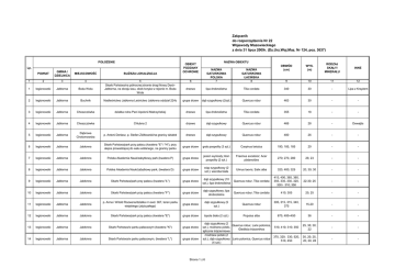 Załącznik do rozporządzenia Nr 22 Wojewody Mazowieckiego z dnia 31 lipca 2009r. (Dz.Urz.Woj.Maz. Nr 124, poz. 3637) POŁOśENIE Lp. NAZWA OBIEKTU OBIEKT PODDANY OCHRONIE OBWÓD (cm) WYS. (m) RODZAJ SKAŁY/ MINERAŁU INNE 9 10 11 12 Tilia cordata 340 30 - Lipa z KrzyŜem 6 NAZWA GATUNKOWA POLSKA 7 NAZWA GATUNKOWA ŁACIŃSKA 8 drzewo lipa drobnolistna POWIAT GMINA / DZIELNICA MIEJSCOWOŚĆ BLIśSZA LOKALIZACJA 1 2 3 4 1 legionowski Jabłonna BoŜa Wola 5 Skarb Państwa/na północnej stronie drogi Nowy DwórJabłonna, na skraju lasu, obok krzyŜa w rejonie m. BoŜa Wola 2 legionowski Jabłonna Buchnik Nadleśnictwo Jabłonna Leśnictwo Jabłonna oddział 224c grupa drzew dąb szypułkowy (2szt.) Quercus robur 463 30 - - 3 legionowski Jabłonna Choszczówka działka rolna Pani Apolonii Małczyńskiej drzewo lipa drobnolistna Tilia cordata 355 18 - - 4 legionowski Jabłonna Choszczówka Chlubna 2 drzewo dąb szypułkowy Quercus robur 466 28 - Dewajtis 5 legionowski Jabłonna Dąbrowa Chotomowska p. Antoni Derlacz, p. Stefan Ziółkowski/na granicy działek drzewo dąb szypułkowy Quercus robur 480 26 - - 6 legionowski Jabłonna Jabłonna Skarb Państwa/park przy pałacu (kwatera "E" i "H"), przy alejce prowadzącej do wału wiślanego, na granicy parku grupa drzew grab pospolity (3 szt.) Carpinus betulus 190, 185, 185 20 - - 7 legionowski Jabłonna Jabłonna Polska Akademia Nauk/zabytkowy park (kwatera P) grupa drzew jesion wyniosły; klon pospolity (2 szt.) Fraxinus excelsior; Acer platanoides 270; 270, 280 26; 23 - - 8 legionowski Jabłonna Jabłonna Polska Akademia Nauk/zabytkowy park, (kwatera D) grupa drzew wiąz szypułkowy (2 szt.); wierzba biała Ulmus laevis; Salix alba 320, 400; 325 20, 30; 30 - - 9 legionowski Jabłonna Jabłonna Skarb Państwa/park przy pałacu (kwatera "Ł") grupa drzew dąb szypułkowy (10 szt.), lipa drobnolistna Quercus robur, Tilia cordata 415, 400, 365, 360, 355, 335, 330, 320, 330 i 310; 350 22-30; 25 - - 10 legionowski Jabłonna Jabłonna Skarb Państwa/park przy pałacu (kwatera "F") grupa drzew dąb szypułkowy; lipa drobnolistna Quercus robur; Tilia cordata 410; 305 25; 25 - - 11 legionowski Jabłonna Jabłonna p. Anna i Witold Rozwens/działka nr ewd. 367, teren parku wiejskiego (zdziczałego) grupa drzew dąb szypułkowy (5 szt.) Quercus robur 305, 315, 315, 340, 375 15-20 - - 12 legionowski Jabłonna Jabłonna Skarb Państwa/park przy pałacu (kwatera "E") grupa drzew topola biała (2 szt.) Populus alba 870, 400+450 36 - - 13 legionowski Jabłonna Jabłonna Skarb Państwa/w parku pałacowym (kwatera "K") grupa drzew 25, 30; 30; 22 - - 14 legionowski Jabłonna Jabłonna Skarb Państwa/w parku pałacowym, (kwatera "L") grupa drzew 30, 20; 25, 20, 20, 28 - - dąb szypułkowy (2 Quercus robur, Larix polonica, szt.), modrzew polski, 510, 410; 310; 350 Gleditsia triacenthos iglicznia trójcierniowa modrzew polski (2 375, 320; 330, 520, szt.), dąb szypułkowy Larix polonica, Quercus robur 510, 450 (4 szt.) Strona 1 z 6 1 2 3 4 5 6 grupa drzew 7 lipy drobnolistne (3 szt.), modrzew polski (2 szt.) dąb szypułkowy (7 szt.), topola biała (3 szt.), klon pospolity, wiąz szypułkowy 8 9 10 11 12 Tilia cordata, Larix polonica 505, 365, 360; 330, 270 18, 25, 25; 25, 28 - - Quercus robur, Populus alba, Acer platanoides, Ulmus laevis 335-410; 485-520; 380; 380 22-28; 3435; 22; 25 - - 15 legionowski Jabłonna Jabłonna Skarb Państwa/w parku, przy pałacu przed frontem pałacu przy podjeździe (kwatera "M") 16 legionowski Jabłonna Jabłonna Skarb Państwa/park przy pałacu (kwatera "G") grupa drzew 17 legionowski Jabłonna Jabłonna Skarb Państwa/w zabytkowym parku Jabłonna, w kwaterze Ł, obok kortów tenisowych grupa drzew dąb szypułkowy (2 szt.) Quercus robur 300, 280 28 - - 18 legionowski Jabłonna Jabłonna Skarb Państwa/park przy pałacu (kwatera "D") drzewo grab pospolity Carpinus betulus 245 22 - - 19 legionowski Jabłonna Jabłonna Polska Akademia Nauk/zabytkowy park (kwatera Ł) drzewo dąb szypułkowy Quercus robur 300 25 - - 20 legionowski Jabłonna Jabłonna Polska Akademia Nauk/zabytkowy park (kwatera J) drzewo modrzew polski Larix polonica 300 25 - - 21 legionowski Jabłonna Jabłonna Polska Akademia Nauk/zabytkowy park, (kwatera H) drzewo jesion wyniosły Fraxinus excelsior 325 20 - - 22 legionowski Jabłonna Jabłonna Zakład Doświadczalny PAN w Jabłonnej/na łakach przed wałem przeciwpowodziowym drzewo wierzba biała Salix alba 650 20 - - 23 legionowski Jabłonna Jabłonna Skarb Państwa/park przy pałacu (kwatera "H") drzewo wiąz szypułkowy Ulmus laevis 375 22 - Pepi 24 legionowski Jabłonna Jabłonna Skarb Państwa/w parku pałacowym (kwatera "J") drzewo lipa drobnolistna Tilia cordata 410 25 - - 25 legionowski Jabłonna Jabłonna Skarb Państwa/w parku zabytkowym Jabłonna, w tarasie pałacu, skrzydło północne drzewo lipa drobnolistna Tilia cordata 250 18 - - 26 legionowski Jabłonna Jabłonna Skarb Państwa/park zabytkowy w Jabłonnie, w kwaterze K (dolny taras-część łęgowa), w pobliŜu zachodniej granicy parku drzewo wiąz szypułkowy Ulmus laevis 310 22 - - 27 legionowski Jabłonna Jabłonna teren osady Nadleśnictwa Jabłonna drzewo dąb szypułkowy Quercus robur 445 27 - - 28 legionowski Jabłonna Jabłonna drzewo dąb szypułkowy Quercus robur 335 18 - - 29 legionowski Jabłonna Jabłonna drzewo dąb szypułkowy Quercus robur 400 22 - - 30 legionowski Jabłonna Jabłonna-Buchnik Wczasowa 9 grupa drzew dąb szypułkowy (3 szt.) Quercus robur 380, 350, 345 28 - Dęby przy Dworze 31 legionowski Jabłonna Jabłonna-Buchnik Wczasowa 7 grupa drzew dąb szypułkowy (2 szt.) Quercus robur 360,340+350 28 - Dęby Powstańców 1863r. Skarb Państwa/w linii rozgraniczającej drogi wewnętrznej, pomiędzy posesjami Modlińska 4 i Modlińska 6 (osiedle Buchnik) p. Elzbieta Smolarek/na skraju zalesionej wydmy, ok. 300 m na wschód od ul. Modlinskiej, w sąsiedztwie urzadzeń szklarniowych Strona 2 z 6 1 2 3 4 5 6 7 8 9 10 11 12 32