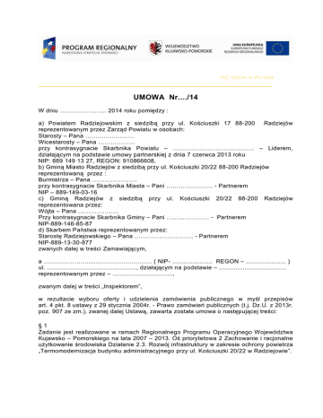 Mój region w Europie ___________________________________________________________________ UMOWA Nr..../14 W dniu ………………….. 2014 roku pomiędzy : a) Powiatem Radziejowskim z siedzibą przy ul. Kościuszki 17 88-200 Radziejów reprezentowanym przez Zarząd Powiatu w osobach: Starosty – Pana …………………… Wicestarosty – Pana ……………… przy kontrasygnacie Skarbnika Powiatu – …………………………………. – Liderem, działającym na podstawie umowy partnerskiej z dnia 7 czerwca 2013 roku NIP: 889 149 13 27, REGON: 910866608, b) Gminą Miasto Radziejów z siedzibą przy ul. Kościuszki 20/22 88-200 Radziejów reprezentowaną przez : Burmistrza – Pana …………………. przy kontrasygnacie Skarbnika Miasta – Pani ………………….. - Partnerem NIP – 889-149-03-16 c) Gminą Radziejów z siedzibą przy ul. Kościuszki 20/22 88-200 Radziejów reprezentowana przez: Wójta – Pana ……………….. Przy kontrasygnacie Skarbnika Gminy – Pani ………………… - Partnerem NIP-889-146-85-87 d) Skarbem Państwa reprezentowanym przez: Starostę Radziejowskiego – Pana ……………………….. - Partnerem NIP-889-13-30-877 zwanych dalej w treści Zamawiającym, a ………………….........…………………… ( NIP- ...................... REGON – ...................... ) ul. ................................................., działającym na podstawie – ..................................... reprezentowanym przez – ................................., zwanym dalej w treści „Inspektorem”, w rezultacie wyboru oferty i udzielenia zamówienia publicznego w myśl przepisów art. 4 pkt. 8 ustawy z 29 stycznia 2004r. - Prawo zamówień publicznych (t.j. Dz.U. z 2013r. poz. 907 ze zm.), zwanej dalej Ustawą, zawarta została umowa o następującej treści: §1 Zadanie jest realizowane w ramach Regionalnego Programu Operacyjnego Województwa Kujawsko – Pomorskiego na lata 2007 – 2013. Oś priorytetowa 2 Zachowanie i racjonalne użytkowanie środowiska Działanie 2.3. Rozwój infrastruktury w zakresie ochrony powietrza „Termomodernizacja budynku administracyjnego przy ul. Kościuszki 20/22 w Radziejowie”. §2 1. „Zamawiający” zleca a „Inspektor ” przyjmuje do wykonania obowiązki inspektora nadzoru inwestorskiego zadania inwestycyjnego pod nazwą:” Termomodernizacja budynku administracyjnego przy ul. Kościuszki 20/22 w Radziejowie” realizowanego na podstawie dokumentacji projektowej. 2. Szczegółowy zakres obowiązków i uprawnień inspektora nadzoru inwestorskiego określają przepisy ustawy z dnia 7 lipca 1994 roku Prawo Budowlane ( t. j. Dz. U. z 2013 poz. 1409 ze zm. ) oraz przepisy wykonawcze do ustawy. §3 1. Zadanie inwestycyjne p.n. „ Termomodernizacja budynku administracyjnego przy ul. Kościuszki 20/22 w Radziejowie” realizowane będzie na podstawie pozwolenia na budowę Nr 42/2012 z dnia 04.05.2012 r. znak GB.III.6740.1.42.2012. i Decyzji OŚB.6740.4.24.2013 z dnia 05.07.2013 r. przez „Wykonawcę” wyłonionego w trybie przetargu nieograniczonego na podstawie art. 39 ustawy z dnia 29 stycznia 2004 r. Prawo zamówień publicznych ( Dz. U. 2013. 907 j.t. zm. ). 2. Wartość umowna zadania nad którym sprawowany będzie nadzór wynosi ............................................................................. zł. 3. Termin realizacji robót - przyjęto następujący termin zakończenia robót budowlanych – do 30 listopada 2014 roku. §4 1.„Inspektor” otrzymuje od „Zamawiającego” 1 egz. dokumentacji projektowej w wersji papierowej i elektronicznej. 2. „Zamawiający” przekaże „Inspektorowi” wszystkie inne posiadane przez „Zamawiającego” informacje dotyczące przedmiotowej inwestycji. 3. Nadzór inwestorski stanowiący przedmiot umowy Inspektor będzie wykonywał od dnia rozpoczęcia robót budowlanych do dnia ich zakończenia potwierdzonego protokołem odbioru końcowego. §5 1. Za pełnienie obowiązków inspektora nadzoru inwestorskiego „ Inspektor „ otrzyma wynagrodzenie ryczałtowe w wysokości – …….......…….. zł brutto, w tym podatek VAT ........................... zł. słownie : …………………………...........………………………. złotych . w tym proporcjonalnie do udziałów: a) Powiat Radziejowski – 62,75 % - ...................... zł brutto b) Gmina Miasto Radziejów - 21,80 % - .................... zł brutto c) Gmina Radziejów – 13,31 % - ........................ zł brutto d) Skarb Państwa – 2,14 % - .................... zł brutto 2. Płatność wynagrodzenia dla „Inspektora” dokonywana będzie na podstawie 1 faktury częściowej i faktury końcowej, procentowo do wartości faktur Wykonawcy robót. 3. Podstawą do wystawienia faktury przez Inspektora będzie sporządzony częściowy lub końcowy protokół odbioru robót. 3. Faktury powinny zostać wystawione na : a) Powiat Radziejowski ul. Kościuszki 17 88-200 Radziejów, NIP – 889 149 13 27 b) Gmina Miasto Radziejów ul. Kościuszki 20/22 88-200 Radziejów – NIP – 889 149 03 16 c) Gmina Radziejów ul. Kościuszki 20/22 88-200 Radziejów – NIP – 889 149 13 27 d) Starostwo Powiatowe w Radziejowie – Skarb Państwa – ul. Kościuszki 17 88-200 Radziejów – NIP – 889 133 08 77 4. Termin płatności kwoty wynikającej z faktur „Inspektora” upływa 30 – ego dnia od dnia otrzymania faktury przez „Zamawiającego”. 5. Wynagrodzenie płatne będzie przelewem na konto podane przez „Inspektora” w fakturze. Datą zapłaty będzie dzień obciążenia rachunku bankowego „Zamawiającego” tj. Lidera i Partnerów. 6. „Inspektor” nie może bez pisemnej zgody „Zamawiającego” dokonywać przeniesienia swoich wierzytelności wobec „Zamawiającego” na osoby trzecie. 7. „Inspektor” zobowiązuje się do zamieszczenia na każdej z faktur danych dotyczących numeru umowy oraz nazwę przedmiotu umowy. 8. Wynagrodzenie us