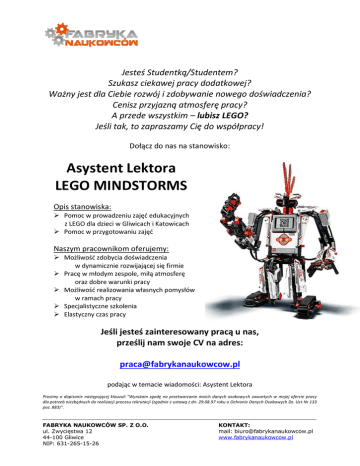 Jesteś Studentką/Studentem? Szukasz ciekawej pracy dodatkowej? Ważny jest dla Ciebie rozwój i zdobywanie nowego doświadczenia? Cenisz przyjazną atmosferę pracy? A przede wszystkim – lubisz LEGO? Jeśli tak, to zapraszamy Cię do współpracy! Dołącz do nas na stanowisko: Asystent Lektora LEGO MINDSTORMS Opis stanowiska: Pomoc w prowadzeniu zajęd edukacyjnych z LEGO dla dzieci w Gliwicach i Katowicach Pomoc w przygotowaniu zajęd Naszym pracownikom oferujemy: Możliwośd zdobycia doświadczenia w dynamicznie rozwijającej się firmie Pracę w młodym zespole, miłą atmosferę oraz dobre warunki pracy Możliwośd realizowania własnych pomysłów w ramach pracy Specjalistyczne szkolenia Elastyczny czas pracy Jeśli jesteś zainteresowany pracą u nas, prześlij nam swoje CV na adres: [email protected] podając w temacie wiadomości: Asystent Lektora Prosimy o dopisanie następującej klauzuli "Wyrażam zgodę na przetwarzanie moich danych osobowych zawartych w mojej ofercie pracy dla potrzeb niezbędnych do realizacji procesu rekrutacji (zgodnie z ustawą z dn. 29.08.97 roku o Ochronie Danych Osobowych Dz. Ust Nr 133 poz. 883)". FABRYKA NAUKOWCÓW SP. Z O.O. ul. Zwycięstwa 12 44-100 Gliwice NIP: 631-265-15-26 KONTAKT: mail: [email protected] www.fabrykanaukowcow.pl