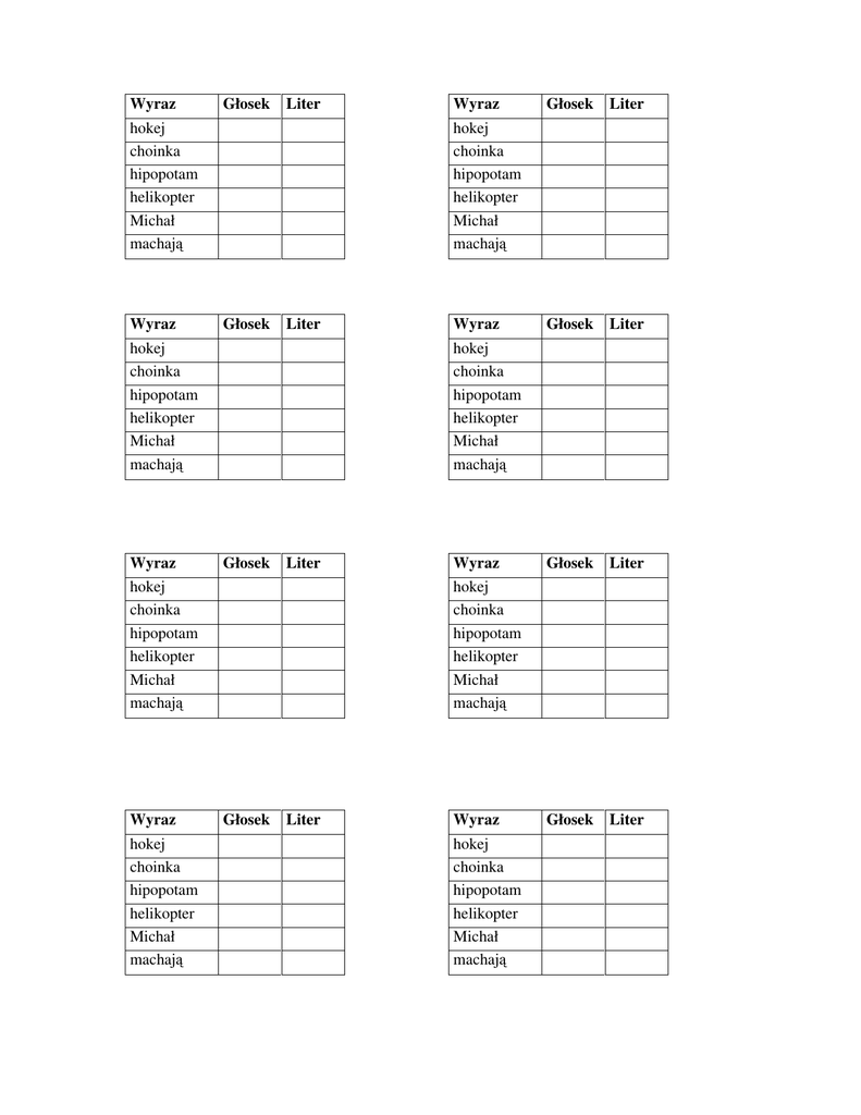 Wyraz Głosek Liter hokej choinka hipopotam helikopter Michał