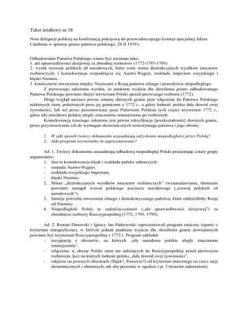 Tekst źródłowy nr 58 Nota delegacji polskiej na konferencję pokojową do przewodniczącego komisji specjalnej Julesa Cambona w sprawie granic państwa polskiego, 28 II 1919 r. Odbudowanie Państwa Polskiego winno być uważane jako: 1. akt sprawiedliwości dziejowej za zbrodnię rozbiorów (1772-1793-1795) 2. wynik rozwoju polskich sił narodowych, które rosły mimo destrukcyjnych wysiłków mocarstw rozbiorczych, i konsekwencja rozpadnięcia się Austro-Węgier, rozkładu imperium rosyjskiego i klęski Niemiec. 3. konieczność utworzenia między Niemcami a Rosją państwa silnego i prawdziwie niepodległego. Z pierwszego założenia wynika, że punktem wyjścia dla określenia granic odbudowanego Państwa Polskiego powinno służyć terytorium Polski sprzed pierwszego rozbioru (1772). Drugi wzgląd narzuca pewne zmiany dawnych granic prze włączenie do Państwa Polskiego niektórych ziem, położonych poza jej granicami z 1772 r., a gdzie ludność polska dała dowód swej żywotności, lub też przez pozostawienie poza Państwem Polskim tych części terytorium 1772 r., gdzie siły narodowe polskie uległy znacznemu zmniejszeniu po rozbiorach. Konsekwencją trzeciego założenia jest pewna rektyfikacja [przekształcenie] dawnych granic, przez przystosowanie ich do wymagań ekonomicznych nowożytnego państwa i jego obrony. 1. W jaki sposób twórcy dokumentu uzasadniają odzyskanie niepodległości przez Polskę? 2. Jaki program terytorialny tu zaprezentowano? Ad. 1. Twórcy dokumentu uzasadniają odbudowę niepodległej Polski prezentując cztery grupy argumentów: 1. Jest to konsekwencja klęsk i rozkładu państw zaborczych: - rozpadu Austro-Węgier, - rozkładu rosyjskiego imperium, - klęski Niemiec. 2. Mimo „destrukcyjnych wysiłków mocarstw rozbiorczych” (wynaradawianie, tłumienie powstań) nastąpił wzrost polskiego poczucia narodowego („rozwój polskich sił narodowych”). 3. Istnieje potrzeba stworzenia silnego i demokratycznego państwa, które oddzieliłoby Rosję od Niemiec. 4. Niepodległość Polski to zadośćuczynienie („akt sprawiedliwości dziejowej”) za zbrodnicze rozbiory Rzeczypospolitej (1772, 1793, 1795). Ad. 2. Roman Dmowski i Jgnacy Jan Paderweski zaprezentowali program etniczny (oparty o kryterium etnograficzne), w którym jednak punktem wyjścia dla określenia granic powojennych powinno być terytorium Rzeczypospolitej z 1772 r. Program zakładał: - rezygnację z obszarów, na których „siły narodowe polskie uległy znacznemu zmniejszeniu”, - włączenie w obszar Polski ziem nie należących do Rzeczypospolitej przed pierwszym rozbiorem, lecz na których ludność polska „dała dowód swej żywotności”, - odejście na pewnych obszarach (Śląsk?, Pomorze?) od kryterium etnicznego na rzecz racji ekonomicznych i obronnych, tak aby pozostać w zgodzie z p. 3 (trzecim założeniem).