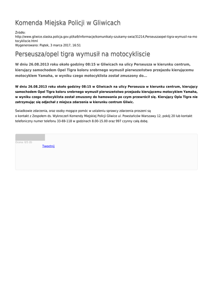 Komenda Miejska Policji w Gliwicach Źródło: http://www.gliwice.slaska.policja.gov.pl/ka9/informacje/komunikaty-szukamy-swia/31214,Perseuszaopel-tigra-wymusil-na-mo tocykliscie.html Wygenerowano: Piątek, 3 marca 2017, 16:51 Perseusza/opel tigra wymusił na motocykliscie W dniu 26.08.2013 roku około godziny 08:15 w Gliwicach na ulicy Perseusza w kierunku centrum, kierujący samochodem Opel Tigra koloru srebrnego wymusił pierwszeństwo przejazdu kierującemu motocyklem Yamaha, w wyniku czego motocyklista został zmuszony do... W dniu 26.08.2013 roku około godziny 08:15 w Gliwicach na ulicy Perseusza w kierunku centrum, kierujący samochodem Opel Tigra koloru srebrnego wymusił pierwszeństwo przejazdu kierującemu motocyklem Yamaha, w wyniku czego motocyklista został zmuszony do hamowania po czym przewrócił się. Kierujący Opla Tigra nie zatrzymując się odjechał z miejsca zdarzenia w kierunku centrum Gliwic. Świadkowie zdarzenia, oraz osoby mogące pomóc w ustaleniu sprawcy zdarzenia proszeni są o kontakt z Zespołem ds. Wykroczeń Komendy Miejskiej Policji Gliwice ul. Powstańców Warszawy 12, pokój 20 lub kontakt telefoniczny numer telefonu 33-69-118 w godzinach 8.00-15.00 oraz 997 czynny całą dobę. Ocena: 0/5 (0) Tweetnij