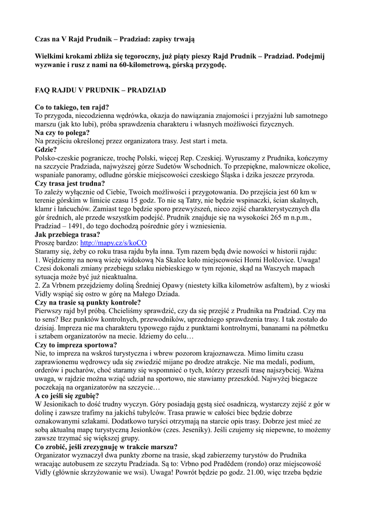 Czas na V Rajd Prudnik – Pradziad: zapisy trwają Wielkimi krokami zbliża się tegoroczny, już piąty pieszy Rajd Prudnik – Pradziad. Podejmij wyzwanie i rusz z nami na 60-kilometrową, górską przygodę. FAQ RAJDU V PRUDNIK – PRADZIAD Co to takiego, ten rajd? To przygoda, niecodzienna wędrówka, okazja do nawiązania znajomości i przyjaźni lub samotnego marszu (jak kto lubi), próba sprawdzenia charakteru i własnych możliwości fizycznych. Na czy to polega? Na przejściu określonej przez organizatora trasy. Jest start i meta. Gdzie? Polsko-czeskie pogranicze, trochę Polski, więcej Rep. Czeskiej. Wyruszamy z Prudnika, kończymy na szczycie Pradziada, najwyższej górze Sudetów Wschodnich. To przepiękne, malownicze okolice, wspaniałe panoramy, odludne górskie miejscowości czeskiego Śląska i dzika jeszcze przyroda. Czy trasa jest trudna? To zależy wyłącznie od Ciebie, Twoich możliwości i przygotowania. Do przejścia jest 60 km w terenie górskim w limicie czasu 15 godz. To nie są Tatry, nie będzie wspinaczki, ścian skalnych, klamr i łańcuchów. Zamiast tego będzie sporo przewyższeń, nieco zejść charakterystycznych dla gór średnich, ale przede wszystkim podejść. Prudnik znajduje się na wysokości 265 m n.p.m., Pradziad – 1491, do tego dochodzą pośrednie góry i wzniesienia. Jak przebiega trasa? Proszę bardzo: http://mapy.cz/s/koCO Staramy się, żeby co roku trasa rajdu była inna. Tym razem będą dwie nowości w historii rajdu: 1. Wejdziemy na nową wieżę widokową Na Skalce koło miejscowości Horni Holčovice. Uwaga! Czesi dokonali zmiany przebiegu szlaku niebieskiego w tym rejonie, skąd na Waszych mapach sytuacja może być już nieaktualna. 2. Za Vrbnem przejdziemy doliną Średniej Opawy (niestety kilka kilometrów asfaltem), by z wioski Vidly wspiąć się ostro w górę na Małego Dziada. Czy na trasie są punkty kontrole? Pierwszy rajd był próbą. Chcieliśmy sprawdzić, czy da się przejść z Prudnika na Pradziad. Czy ma to sens? Bez punktów kontrolnych, przewodników, uprzedniego sprawdzenia trasy. I tak zostało do dzisiaj. Impreza nie ma charakteru typowego rajdu z punktami kontrolnymi, bananami na półmetku i sztabem organizatorów na mecie. Idziemy do celu… Czy to impreza sportowa? Nie, to impreza na wskroś turystyczna i wbrew pozorom krajoznawcza. Mimo limitu czasu zaprawionemu wędrowcy uda się zwiedzić mijane po drodze atrakcje. Nie ma medali, podium, orderów i pucharów, choć staramy się wspomnieć o tych, którzy przeszli trasę najszybciej. Ważna uwaga, w rajdzie można wziąć udział na sportowo, nie stawiamy przeszkód. Najwyżej biegacze poczekają na organizatorów na szczycie… A co jeśli się zgubię? W Jesionikach to dość trudny wyczyn. Góry posiadają gęstą sieć osadniczą, wystarczy zejść z gór w dolinę i zawsze trafimy na jakichś tubylców. Trasa prawie w całości biec będzie dobrze oznakowanymi szlakami. Dodatkowo turyści otrzymają na starcie opis trasy. Dobrze jest mieć ze sobą aktualną mapę turystyczną Jesionków (czes. Jeseniky). Jeśli czujemy się niepewne, to możemy zawsze trzymać się większej grupy. Co zrobić, jeśli zrezygnuję w trakcie marszu? Organizator wyznaczył dwa punkty zborne na trasie, skąd zabierzemy turystów do Prudnika wracając autobusem ze szczytu Pradziada. Są to: Vrbno pod Pradědem (rondo) oraz miejscowość Vidly (głównie skrzyżowanie we wsi). Uwaga! Powrót będzie po godz. 21.00, więc trzeba będzie uzbroić się w cierpliwość. Uczestnik rezygnujący z marszu zobowiązany jest powiadomić o tym telefonicznie organizatora, bez względu na to, czy czeka na jednym z punktów zbornych, czy we własnym zakresie wraca do domu. Brak takiej informacji skutkować może koniecznością wzywania służb ratunkowych i organizacji akcji poszukiwawczej. Docieramy do szczytu i co? Spotykamy się w restauracji na szczycie, popijamy kofolę, piwo, jemy smażony ser i czekamy na pozostałych uczestników rajdu do godz. 20.00. Chwilę potem robimy spotkanie podsumowujące, gratulujmy sobie, wręczamy certyfikaty i przy zapadającym zmroku schodzimy do Ovčarni, gdzie czekać na nas będzie autobus do Prudnika. Dobra, przekonaliście mnie, jak się zapisać? Doskonale! Trzeba wpłacić wpisowe na dwa sposoby: gotówką w sklepie PTTK Prudnik przy ul. Kościuszki 56 lub przelewem na konto: Oddział PTTK Sudetów Wschodnich w Prudniku Bank Spółdzielczy w Prudniku 06 8905 0000 2000 0000 1401 0001 Tytuł wpłaty: Rajd Prudnik – Pradziad, imię i nazwisko uczestnika Kwota: 30 zł obejmuje: autobus, ubezpieczenie, certyfikat przejścia. Kwota jest bezzwrotna. Prosimy o wpłaty w możliwie jak najszybszym terminie. Start… Prudnik, Park Miejski, Pl. Rodziny Fränklów (obok altany) Sobota, 22 sierpnia, wyjście w godzinach: 5.00 – 5.30 Organizatorzy będą na starcie od godz. 4.40. Będziemy sprawdzać obecność i wydawać karty z opisem trasy. Czy tak jak w poprzednich latach można przyjść na start i tam się zapisać? Nie, konieczność zamówienia autobusu i objęcia wszystkich uczestników ubezpieczeniem wymagają uprzedniego załatwienia formalności z tym związanych. Niestety, 22 sierpnia mam inne plany, a tak bardzo chciałem się wybrać… Szkoda, ale okazja do następnej wędrówki długodystansowej będzie już 12 września podczas Prudnickiego Maratonu Pieszego (50 km). Jeśli macie jakieś uwagi, pytajcie: [email protected] Organizatorzy: Roman Gwóźdź, Andrzej Dereń Oddział PTTK Sudetów Wschodnich w Prudniku Imprezę wspiera organizacyjnie: Tygodnik Prudnicki wydawca comiesięcznego dodatku turystycznego „Wędrowiec” Patroni medialni: Tygodnik Prudnicki, Express Prudnicki, Prudnicka.pl
