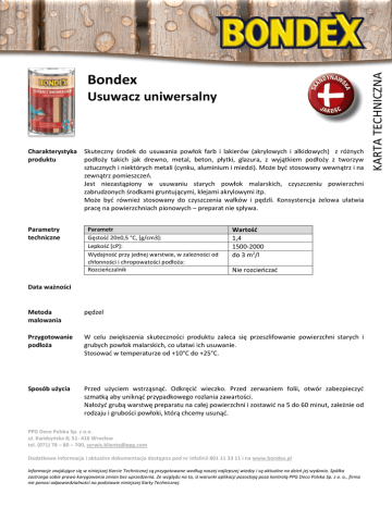 Usuwacz uniwersalny Charakterystyka Skuteczny środek do usuwania powłok farb i lakierów (akrylowych i alkidowych) z różnych produktu podłoży takich jak drewno, metal, beton, płytki, glazura, z wyjątkiem podłoży z tworzyw sztucznych i niektórych metali (cynku, aluminium i miedzi). Może być stosowany wewnątrz i na zewnątrz pomieszczeń. Jest niezastąpiony w usuwaniu starych powłok malarskich, czyszczeniu powierzchni zabrudzonych środkami gruntującymi, klejami akrylowymi itp. Może być również stosowany do czyszczenia wałków i pędzli. Konsystencja żelowa ułatwia pracę na powierzchniach pionowych – preparat nie spływa. Parametry techniczne Parametr Gęstość 20±0,5 °C, [g/cm3]: Lepkość [cP]: Wydajność przy jednej warstwie, w zależności od chłonności i chropowatości podłoża: Rozcieńczalnik Wartość 1,4 1500-2000 do 3 m2/l Nie rozcieńczać Data ważności Metoda malowania pędzel Przygotowanie podłoża W celu zwiększenia skuteczności produktu zaleca się przeszlifowanie powierzchni starych i grubych powłok malarskich, co ułatwi ich usuwanie. Stosować w temperaturze od +10°C do +25°C. Sposób użycia Przed użyciem wstrząsnąć. Odkręcić wieczko. Przed zerwaniem folii, otwór zabezpieczyć szmatką aby uniknąć przypadkowego rozlania zawartości. Nałożyć grubą warstwę preparatu na całej powierzchni i zostawić na 5 do 60 minut, zależnie od rodzaju i grubości powłoki, którą chcemy usunąć. PPG Deco Polska Sp. z o.o. ul. Kwidzyńska 8; 51- 416 Wrocław tel. (071) 78 – 80 – 700, [email protected] Dodatkowe informacje i aktualna dokumentacja dostępna pod nr infolinii 801 11 33 11 i na www.bondex.pl Informacje znajdujące się w niniejszej Karcie Technicznej są przygotowane według naszej najlepszej wiedzy i są aktualne na dzień jej wydania. Spółka zastrzega sobie prawo korygowania zmian bez uprzedzenia. Ze względu na to, iż warunki aplikacji pozostają poza kontrolą PPG Deco Polska Sp. z o. o., firma nie ponosi odpowiedzialności na podstawie niniejszej Karty Technicznej. KARTA TECHNICZNA Bondex Dodatkowe informacje Czas działania: • Farby i lakiery akrylowe: 5 do 15 minut • Farby i lakiery alkidowe: 5 do 20 minut • Farby strukturalne: Ponad 1 godz • Kleje: 5 do 30 minut Czyszczenie: Woda Atesty Produkt posiada atest higieniczny. Zalecenia BHP i P. Poż Stosować się do zaleceń podanych na opakowaniu. Szczegółowe informacje zamieszczone są w Karcie Charakterystyki Opakowanie handlowe 0,5L; 1L PPG Deco Polska Sp. z o.o. ul. Kwidzyńska 8; 51- 416 Wrocław tel. (071) 78 – 80 – 700, [email protected] Dodatkowe informacje i aktualna dokumentacja dostępna pod nr infolinii 801 11 33 11 i na www.bondex.pl Informacje znajdujące się w niniejszej Karcie Technicznej są przygotowane według naszej najlepszej wiedzy i są aktualne na dzień jej wydania. Spółka zastrzega sobie prawo korygowania zmian bez uprzedzenia. Ze względu na to, iż warunki aplikacji pozostają poza kontrolą PPG Deco Polska Sp. z o. o., firma nie ponosi odpowiedzialności na podstawie niniejszej Karty Technicznej. KARTA TECHNICZNA Usunąć farbę za pomocą szpachli lub miękkiej metalowej szczotki. W razie potrzeby czynność powtórzyć. Następnie powierzchnię umyć ciepłą wodą, używając twardej szczotki. Podłoża fornirowane i szlachetne odmiany drewna zmyć rozcieńczalnikiem EKO-1. Przed nałożeniem nowej powłoki lakierowej poczekać aż podłoże będzie całkowicie suche. Przy czyszczeniu narzędzi, moczyć je w preparacie przez noc, po czym opłukać w ciepłej wodzie. Nie należy stosować produktu do czyszczenia narzędzi z tworzyw sztucznych.