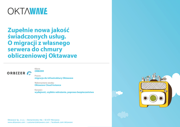 Zupełnie nowa jakość świadczonych usług. O migracji z własnego serwera do chmury obliczeniowej Oktawave Klient: ORBIZER Proces: migracja do infrastruktury Oktawave Wykorzystane zasoby: Oktawave Cloud Instance Korzyści: wydajność, szybkie wdrożenie, poprawa bezpieczeństwa Oktawave Sp. z o.o. | Domaniewska 44a | 02-672 Warszawa www.oktawave.com | [email protected] | facebook.com/oktawave Dzięki Oktawave, deweloper aplikacji nie musi się obawiać o to, czy jego aplikacje będą działały szybko i nieprzerwanie. Jedną z głównych wad dotychczasowego rozwiązania była zbyt niska wydajność. Nie było również możliwości szybkiego zwiększenia zasobów. Byłoby to poprostu nieopłacalne, bo większa wydajność serwera była czasami potrzebna tylko na kilka godzin czy dni. Na targach Cebit 2013 w Hanowerze została zaprezentowana, polska, innowacyjna platforma ORBIZER, która w modelu SaaS ma za zadanie wspierać małe i średnie firmy w zakresie zarządzania projektami, zadaniami, sprzedażą i zasobami w firmie, jak również wspierać obieg dokumentów i kontrolę kosztów. To uniwersalne i kompleksowe rozwiązanie do zarządzania MŚP w łatwy i intuicyjny sposób ma ułatwić prowadzenie działalności, przy zachowaniu niskich kosztów utrzymania. Migracja Za rozwój i wprowadzenie nowego, webowego narzędzia odpowiada Softhis Sp. z o.o., krakowski software house, który od 2005 rokudziała jako deweloper oprogramowania skupiając się na dostarczaniu dedykowanych aplikacji WWW i mobilnych. Firma specjalizuje się w zaawansowanych i innowacyjnych projektach takich jak: e-usługi, platformy e-commerce, aplikacje i systemy mobilne, UX, rozwiązania BPMN, BI i technologie semantyczne. Wyzwanie Przez lata firma starała się utrzymywać infrastrukturę IT we własnym zakresie. W przypadku uruchomienia platofrmy ORBIZER najlepszym rozwiązaniem okazała się współpraca z wyspecjalizowanym dostawcą najnowszych technologii w zakresie cloud computingu . Oczekiwania wobec platformy oraz dynamicznie rosnące potrzeby wymagały niezawodnej infrastruktury, aby świadczyć usługi na najwyższym poziomie. - Chcemy, aby użytkownik miał zawsze pewność, że jego narzędzie pracy będzie zawsze dostępne. Nasze dotychczasowe rozwiązanie nie pozwoliłoby dostarczyć nam usługi w tak rozbudowanym zakresie, w jakim oczekują tego Klienci. Stąd decyzja o migracji platformy ORBIZER do chmury Oktawave. powiedział Paweł Zieliński, PR & marketing manager w Softhis. Oktawave Sp. z o.o. | Domaniewska 44a | 02-672 Warszawa www.oktawave.com | [email protected] | facebook.com/oktawave - Chmura Oktawave jest tym, czego poszukiwaliśmy dla naszej platformy. Zadecydowało wiele argumentów, m.in. innowacyjność usługioraz pewne zaplecze techniczne, lepsze wskaźniki wydajności niż chmuraoferowana przez Amazon, atrakcyjna cena oraz dynamiczne autoskalowanie uzależnione od obciążenia i potrzeb. - komentuje Łukasz Rzepecki, Prezes Zarządu Softhis. Migracja nie była niczym skomplikowanym i udało się ją szybko i bezproblemowo przeprowadzić. Zespół Softhis rozpoczął od zdefiniowania elementów składowych infrastruktury i powołania ich do życia (serwery, maszyny wirtualne, bazy danych). Następnie skonfigurowano serwery Apache i Tomcat, po czym ustawiono porty na firewallu oraz ustawiono dostęp. Kolejne kroki migracji obejmowały: • zdefiniowanie konfiguracji dla maszyn wirtualnych, • uruchomienie trzech instancji bazy danych i zestawienie replikacji wedle schematu: Master-Slave-Backup, • ustawienie kopii zapasowej bazy danych (dump do pliku), • deploy aplikacji na serwery, • start aplikacji. Po migracji na infrastrukturę Oktawave platforma ORBIZER dysponuje między innymi dwoma serwerami “głównymi” z opcją uruchomienia kilku dodatkowych wirtualnych maszyn będących kopią serwerów głównych, na wypadek nagłego wzrostu ruchu. Ruch na maszynach sterowany jest loadbalancerem. Administratorzy usługi zamknęli dla świata wszystkie porty poza http/https. W obecnym rozwiązaniu informacje z bazy pobierane są poprzez loadbalancer bazodanowy z instancji “Master” i “Slave”, zapis odbywa się tylko do instancji “Slave”. Raz na godzinę następuje zrzut bazy do pliku w ramach backupu (offline). Zespołowi odpowiedzilanemu za rozwój platformy ORBIZER udało się osiągnąć wszystkie cele, jakie postawiono sobie przed migracją. Wzrosła wydajność systemu, infrastruktura była gotowa na przyjęcie większego ruchu w każdej chwili - bez ingerencji administratora, a dane były stosownie chronione przed utratą. Patrząc w przyszłość, jasnejest też to, że nowe rozwiązanie to również oszczędności. Cebit 2013 w Hanowerze, na których zaprezentowaliśmy platformę ORBIZER poza granicami Polski. Znaczny przyrost ruchu w aplikacji nie powodował jakichkolwiek problemów. Aplikacja zachowała pełną wydajność. - podsumowuje Paweł Zieliński, PR & marketing manager w Softhis. Więcej informacji Dariusz Nawojczyk Korzyści To, co od razu rzuca się w oczy po migracji, to poprawa wydajności całej infrastruktury IT. - Nie mamy wątpliwości, że nasi klienci odczuli wzrost jakości świadczonych przez nas usług. Nasze aplikacje działają poprostu szybciej i stabilniej, w dodatku nie zdarzają się już momenty przestoju, kiedy np. prowadzone były prace konserwacyjne. Obecnie proces ten jest przezroczysty dla użytkowników. - komentuje Tomasz Różański, Analityk IT w Softhis. Komfort odczuli również administratorzy ORBIZER - mają teraz dostęp do wygodnego i przejrzystego Panelu Administracyjnego z poziomu przeglądarki internetowej. Zdjęto z nich również obowiązek konserwacji i modernizacji serwera - tym wszystkimzajmuje się teraz Oktawave. W Oktawave płaci się tylko za rzeczywiste zużycie zasobów, co idealnie pasuje do specyfiki działania aplikacji ORBIZER – infrastruktura wykorzystywana jest głównie podczas dnia, a w
