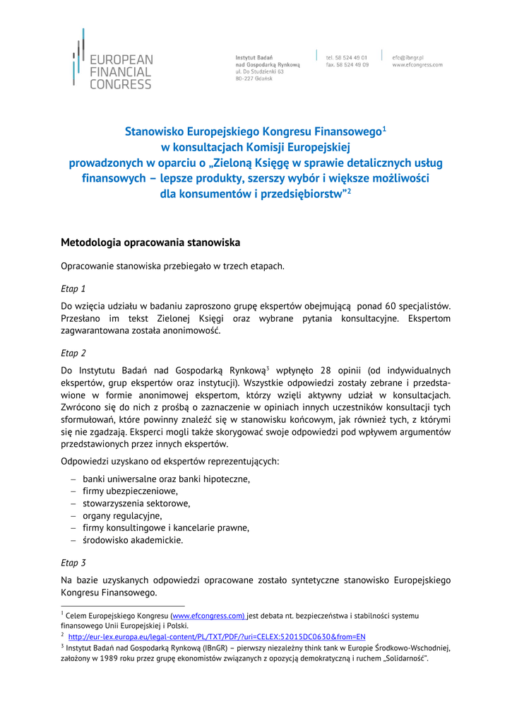 Stanowisko Europejskiego Kongresu Finansowego1 w konsultacjach Komisji Europejskiej prowadzonych w oparciu o „Zieloną Księgę w sprawie detalicznych usług finansowych – lepsze produkty, szerszy wybór i większe możliwości dla konsumentów i przedsiębiorstw”2 Metodologia opracowania stanowiska Opracowanie stanowiska przebiegało w trzech etapach. Etap 1 Do wzięcia udziału w badaniu zaproszono grupę ekspertów obejmującą ponad 60 specjalistów. Przesłano im tekst Zielonej Księgi oraz wybrane pytania konsultacyjne. Ekspertom zagwarantowana została anonimowość. Etap 2 Do Instytutu Badań nad Gospodarką Rynkową3 wpłynęło 28 opinii (od indywidualnych ekspertów, grup ekspertów oraz instytucji). Wszystkie odpowiedzi zostały zebrane i przedstawione w formie anonimowej ekspertom, którzy wzięli aktywny udział w konsultacjach. Zwrócono się do nich z prośbą o zaznaczenie w opiniach innych uczestników konsultacji tych sformułowań, które powinny znaleźć się w stanowisku końcowym, jak również tych, z którymi się nie zgadzają. Eksperci mogli także skorygować swoje odpowiedzi pod wpływem argumentów przedstawionych przez innych ekspertów. Odpowiedzi uzyskano od ekspertów reprezentujących: banki uniwersalne oraz banki hipoteczne, firmy ubezpieczeniowe, stowarzyszenia sektorowe, organy regulacyjne, firmy konsultingowe i kancelarie prawne, środowisko akademickie. Etap 3 Na bazie uzyskanych odpowiedzi opracowane zostało syntetyczne stanowisko Europejskiego Kongresu Finansowego. 1 Celem Europejskiego Kongresu (www.efcongress.com) jest debata nt. bezpieczeństwa i stabilności systemu finansowego Unii Europejskiej i Polski. 2 http://eur-lex.europa.eu/legal-content/PL/TXT/PDF/?uri=CELEX:52015DC0630&from=EN 3 Instytut Badań nad Gospodarką Rynkową (IBnGR) – pierwszy niezależny think tank w Europie Środkowo-Wschodniej, założony w 1989 roku przez grupę ekonomistów związanych z opozycją demokratyczną i ruchem „Solidarność”. Odpowiedzi Europejskiego Kongresu Finansowego na pytania konsultacyjne 1. W przypadku których produktów usprawniona dostawa trans-graniczna mogłaby zwiększyć konkurencyjność na rynkach krajowych pod względem większego wyboru i lepszych cen? Pomimo postępującej integracji rynków trans-graniczna dostawa produktów finansowych jest na rynku wspólnotowym ograniczona do wąskich segmentów rynku. Można więc oczekiwać, że usprawnienie dostawy trans-granicznej produktów finansowych powinno zaowocować istotnym wzrostem konkurencyjności oferty dostępnej konsumentom na rynkach krajowych. W wymiarze produktowym, jedynym racjonalnym ograniczeniem dla wzrostu konkurencyjności rynków krajowych wydają się być niepożądane sytuacje, gdy na skutek usprawnionej dostawy trans-granicznej mogłoby dojść do otwarcia rynków krajowych dla produktów i podmiotów, w stosunku do których uczestnicy rynków krajowych nie mogliby dokonać właściwej oceny ich atrakcyjności rynkowej i/lub ceny. Sytuacje te mogłyby mieć wymiar zarówno przedmiotowy – wadliwe produkty wprowadzające w błąd nabywców, oraz podmiotowy – nowi uczestnicy rynków dostarczający transgranicznie produkty i niezasługujący na zaufanie konsumentów. Wydaje się, iż produkty, w przypadku których dostawa trans-graniczna może skutecznie zwiększyć konkurencyjność na rynkach krajowych, pod względem większego wyboru i lepszych cen, mogą stanowić rachunki bankowe, karty płatnicze, kredyty konsumenckie, kredyty hipoteczne, ubezpieczenia komunikacyjne. W obliczu szczególnych uwarunkowań związanych z nabywaniem produktów transgranicznych (bariera językowa, uwarunkowania prawne, ekonomiczne, polityczne występujące w innym kraju UE, kurs walutowy) produkty, które będą oferowane klientom powinny być produktami: popularnymi, stosunkowo prostymi (nie powinny być one skomplikowane, jak np. produkty strukturyzowane), nie wymagającymi częstego kontaktu z instytucją finansową. Ponadto zapisy w umowach powinny być proste i zrozumiałe, a rozwiązanie umowy łatwe. 2a. Jakie bariery uniemożliwiają instytucjom finansowym bezpośrednie świadczenie trans-granicznych usług finansowych, a konsumentom bezpośrednie dokonywanie transgranicznych zakupów produktów? (perspektywa instytucji finansowych) Kluczową barierą po stronie instytucji finansowych wydaje się brak kompatybilnych, trans-granicznych rozwiązań w obszarze: 2 infrastruktury rynkowej wykorzystywanej do oferowania określonych produktów (m.in. brak wystandaryzowanych API dla systemów wspierających określone produkty, czy brak standardów informacji kredytowej do oceny ryzyka), taniego i łatwego dostępu do rzetelnej, kompleksowej informacji o kliencie, pozwalającej na zweryfikowanie rzetelności, moralności płatniczej, zdolności kredytowej i wiarygodności kredytowej, wymogów informacji konsumenckiej związanej z oferowaniem określonych produktów, upadłości konsumenckiej, skuteczności procesów odzyskiwania należności, procedur zmiany dostawcy produktów finansowych – optymalnie wystandaryzowanych w skali rynku wspólnotowego – gdzie nowy dostawca mógłby wykonać w imieniu klienta wszystkie niezbędne czynności związane ze zmianą dostawcy. Pozostałe bariery po stronie instytucji finansowych to: ograniczenia i różnice prawne/regulacje w poszczególnych krajach członkowskich UE, brak możliwości oferowania usług nierezydentom przez niektóre instytucje, zawierania transakcji/umów w różnych walutach, brak wiedzy o akceptowalnych na danym rynku zapisach umów kredytowych – klauzule abuzywne, brak znajomości lokalnych uwarunkowań istotnie wpływających na poziom ryzyka kredytowania – brak systemów scoringowych zwalidowanych na danych z określonego rynku, dopasowanie cen (marż) do danego rynku a nie do możliwości przedsiębiorstwa, mało elastyczni klienci i niedostateczna ich liczba. 2b. Jakie bariery uniemożliwiają ins