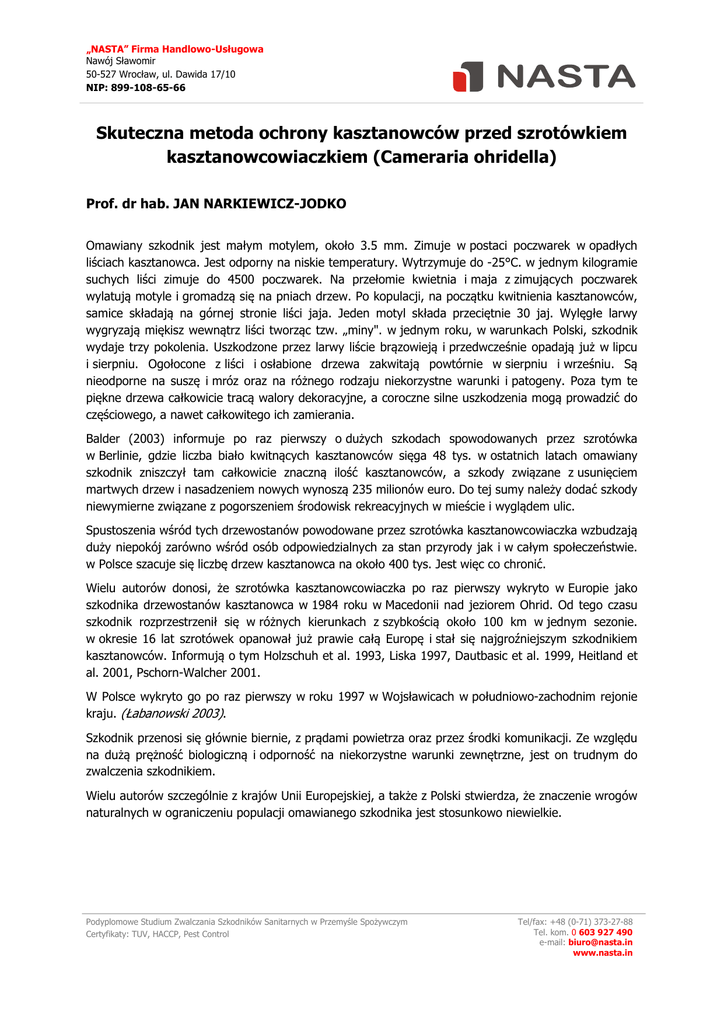 „NASTA” Firma Handlowo-Usługowa Nawój Sławomir 50-527 Wrocław, ul. Dawida 17/10 NIP: 899-108-65-66 Skuteczna metoda ochrony kasztanowców przed szrotówkiem kasztanowcowiaczkiem (Cameraria ohridella) Prof. dr hab. JAN NARKIEWICZ-JODKO Omawiany szkodnik jest małym motylem, około 3.5 mm. Zimuje w postaci poczwarek w opadłych liściach kasztanowca. Jest odporny na niskie temperatury. Wytrzymuje do -25°C. w jednym kilogramie suchych liści zimuje do 4500 poczwarek. Na przełomie kwietnia i maja z zimujących poczwarek wylatują motyle i gromadzą się na pniach drzew. Po kopulacji, na początku kwitnienia kasztanowców, samice składają na górnej stronie liści jaja. Jeden motyl składa przeciętnie 30 jaj. Wylęgłe larwy wygryzają miękisz wewnątrz liści tworząc tzw. „miny". w jednym roku, w warunkach Polski, szkodnik wydaje trzy pokolenia. Uszkodzone przez larwy liście brązowieją i przedwcześnie opadają już w lipcu i sierpniu. Ogołocone z liści i osłabione drzewa zakwitają powtórnie w sierpniu i wrześniu. Są nieodporne na suszę i mróz oraz na różnego rodzaju niekorzystne warunki i patogeny. Poza tym te piękne drzewa całkowicie tracą walory dekoracyjne, a coroczne silne uszkodzenia mogą prowadzić do częściowego, a nawet całkowitego ich zamierania. Balder (2003) informuje po raz pierwszy o dużych szkodach spowodowanych przez szrotówka w Berlinie, gdzie liczba biało kwitnących kasztanowców sięga 48 tys. w ostatnich latach omawiany szkodnik zniszczył tam całkowicie znaczną ilość kasztanowców, a szkody związane z usunięciem martwych drzew i nasadzeniem nowych wynoszą 235 milionów euro. Do tej sumy należy dodać szkody niewymierne związane z pogorszeniem środowisk rekreacyjnych w mieście i wyglądem ulic. Spustoszenia wśród tych drzewostanów powodowane przez szrotówka kasztanowcowiaczka wzbudzają duży niepokój zarówno wśród osób odpowiedzialnych za stan przyrody jak i w całym społeczeństwie. w Polsce szacuje się liczbę drzew kasztanowca na około 400 tys. Jest więc co chronić. Wielu autorów donosi, że szrotówka kasztanowcowiaczka po raz pierwszy wykryto w Europie jako szkodnika drzewostanów kasztanowca w 1984 roku w Macedonii nad jeziorem Ohrid. Od tego czasu szkodnik rozprzestrzenił się w różnych kierunkach z szybkością około 100 km w jednym sezonie. w okresie 16 lat szrotówek opanował już prawie całą Europę i stał się najgroźniejszym szkodnikiem kasztanowców. Informują o tym Holzschuh et al. 1993, Liska 1997, Dautbasic et al. 1999, Heitland et al. 2001, Pschorn-Walcher 2001. W Polsce wykryto go po raz pierwszy w roku 1997 w Wojsławicach w południowo-zachodnim rejonie kraju. (Łabanowski 2003). Szkodnik przenosi się głównie biernie, z prądami powietrza oraz przez środki komunikacji. Ze względu na dużą prężność biologiczną i odporność na niekorzystne warunki zewnętrzne, jest on trudnym do zwalczenia szkodnikiem. Wielu autorów szczególnie z krajów Unii Europejskiej, a także z Polski stwierdza, że znaczenie wrogów naturalnych w ograniczeniu populacji omawianego szkodnika jest stosunkowo niewielkie. Podyplomowe Studium Zwalczania Szkodników Sanitarnych w Przemyśle Spożywczym Certyfikaty: TUV, HACCP, Pest Control Tel/fax: +48 (0-71) 373-27-88 Tel. kom. 0 603 927 490 e-mail: [email protected] www.nasta.in Z pośród kilkunastu gatunków parazytoidów największe znaczenie mają błonkówki z rodziny Eulophidae. Jednak ilość spasozytowanych larw i poczwarek nie przekracza 25 proc, a najczęściej jest mniejsza niż 10 proc. Pewne znaczenie w redukcji ilości szkodnika mają także ptaki, głównie sikorki, jednak i ich znaczenie jest również stosunkowo małe i nie przekracza 4 proc. zniszczonych larw oraz poczwarek szrotówka. Donoszą o tym między innymi Łabanowski 2003, Grabenweger et al. 1999, Freise et al. 2002, Skuhravy 1999. Wielu autorów, w celu ograniczenia populacji szkodnika, zaleca niszczenie stadiów zimujących w okresie jesiennym w opadłych liściach. Grabienie i palenie lub kompostowanie liści z zimującymi poczwarkami daje stosunkowo wyższą skuteczność niż aktywność wrogów naturalnych. Jednak i w tym przypadku skuteczność zwalczania szkodnika w pierwszym pokoleniu nie przekracza 50 proc. i nie jest wystarczająca do ograniczenia jego występowania oraz szkodliwości w pokoleniach następnych. Poza tym, wraz z paleniem lub kompostowaniem liści z zimującymi poczwarkami szkodnika niszczymy także wrogów naturalnych. Informują o tym: Del Bene et al. 2001, Trenchev et al. 2000. Z innych metod ochrony przed szrotówkiem zarówno w krajach Unii Europejskiej jak i w Polsce, dużo uwagi poświęca się możliwości zastosowania feromonów (pułapki feromonowe, dezorientacja samców). Stosowanie pułapek feromonowych i potrzeba częstej ich wymiany wiąże się z ogromnym nakładem finansowym oraz nie ma znaczniejszego wpływu na stopień porażenia liści i terminu ich opadania. Poza tym umieszczanie ich w miejscach publicznych, przy ulicach i alejach, naraża je na zniszczenie. Biorąc pod uwagę jeszcze stosunkowo słaby stan zaawansowania badań należy stwierdzić, że do praktycznego zastosowania feromonów jest jeszcze dosyć daleka droga. Informują o tym Łabanowski 2003, Kropczyńska 2003, Kalinowa et al. 2003, Soika 2003. W badaniach nad chemicznym zwalczaniem szrotówka kasztanowcowiaczka przy pomocy opryskiwania insektycydami koron drzew, w różnych krajach oraz w Polsce stosowano głównie preparaty z grupy regulatorów rozwoju owadów, a więc Dimilin, Nomolt Alsistin Z innych grup insektycydów były uwzględnione takie środki jak Piriproxyfen, Orthene, niektóre pyretroidy oraz Azadirachtin (preparat roślinny). Po wykonaniu oprysków na różne pokolenia szkodnika, stosunkowo najlepsze wyniki uzyskano po zastosowaniu regulatorów rozwoju owadów (Dimilin, Nomolt, Alsistin). Ze względu jednak na szkodliwy wpływ zabiegów 