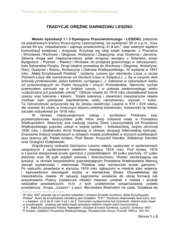 Tradycje orężne 4.Zielonogórskiego Pułku Przeciwlotniczego TRADYCJE ORĘŻNE GARNIZONU LESZNO Miasto dyslokacji 1 i 3 Dywizjonu Przeciwlotniczego - LESZNO, położone na południowym krańcu Wysoczyzny Leszczyńskiej, na wysokości 95 m n.p.m., liczy ponad 64 tys. mieszkańców i zajmuje powierzchnię 31,9 km. 2 Jest ważnym węzłem komunikacji kolejowej i drogowej. Krzyżują się tutaj szlaki kolejowe: z Poznania i Wrocławia, Wschowy i Głogowa, Wolsztyna i Zbąszynia, oraz Gostynia i Jarocina. Główną drogą jest międzynarodowy szlak drogowy wiodący z Gdańska, przez Bydgoszcz – Poznań – Rawicz i Wrocław, do przejścia granicznego w Jakuszycach, koło Szklarskiej Poręby. Drogi lokalne prowadzą do Wschowy i Głogowa, Wolsztyna, Góry, Gostynia i Śremu, Krotoszyna i Ostrowa Wielkopolskiego. W wydanej w 1847 roku ,,Małej Encyklopedii Polskiej’’1 czytamy: Leszno (po niemiecku Lissa, a raczej Polnisch-Lissa dla rozróżnienia od Deutsch-Lissa w Szląsku).(...) Są w Lesznie dwa kościoły protestanckie, jeden katolicki, synagoga.(...). Założone w szesnastym wieku od przechodzących do Polski Hussytów i innych Protestantów, Niemców; tychże przemysłem wzniosło się w krótkim czasie, i w połowie siedemnastego wieku uczęszczane już posiadało szkoły 2. Oblicze miasta do 1918 roku ukształtowali bracia czescy oraz luteranie i kalwini. Dzięki tolerancji i otwartości mieszkańców miasta możliwe było pokojowe współistnienie wielu narodowości, wyznań i kultur. Ta różnorodność przyczyniła się do okresu świetności Leszna w XVI i XVII wieku, ale również do utraty w znacznym stopniu polskiej tożsamości, tożsamość tą miasto zaczęło odzyskiwać po 1918 roku. W okresie międzywojennym ostoją i symbolem Polskości były przedwrześniowe leszczyńskie pułki które swój rodowód miały w Powstaniu Wielkopolskim. Stworzyły one tradycję orężną Ziemi Leszczyńskiej od Powstania Wielkopolskiego poprzez udział w wojnie polsko – bolszewickiej, wojnie obronnej 1939 roku i działalności Armii Krajowej w okresie okupacji hitlerowskiej kończąc. Znaczenie tradycji wojskowych w dziejach miasta podkreślali w licznych publikacjach tacy autorzy jak: Paweł Anders, Piotr Bauer, Krzysztof Handke, Waldemar Handke oraz Grzegorz Gołębiewski. Współczesny rodowód Garnizonu Leszno należy upatrywać w wydarzeniach związanych z wydarzeniami ostatnich miesięcy 1918 roku. Pod koniec 1918 w Lesznie stacjonował pruski garnizon z pododdziałami 50 pułku piechoty, 37 pułku piechoty oraz 56 pułk artylerii polowej i Grenzschutzu. Wobec zaostrzającej się sytuacji w okresie bezpośrednio poprzedzającym Powstanie Wielkopolskie Niemcy zaczęli szykanować i internować Polaków oraz wzmacniać pruski garnizon. 3 Po wybuchu powstania w styczniu 1919 roku ogłoszono w mieście stan wojenny i wprowadzono obowiązek służby w niemieckiej Straży Obywatelskiej dla mieszkańców miasta. W sytuacji zagrożenia: wcielenia do obcej formacji lub aresztowania Polacy (zwłaszcza młodzi) masowo uciekali z miasta i szukali oddziałów powstańczych, m.in. z tych uciekinierów zorganizowana została powstańcza Grupa ,,Leszno”- z ppor. Bernardem Śliwińskim na czele. Działania tej W roku 1847 ukazała się w Lesznie nakładem i drukiem Ernesta Gunthera „Mała Encyklopedia Polska". Autor tej encyklopedii określony jest inicjałami "S.P.". Wydanie obejmowało dwa tomy: tom I z hasłami od A do K i tom II od L do Z. Cenzorem wydawnictwa był Czarnecki. Wśród wielu haseł w encyklopedii, znajdują się także hasła opisujące niektóre miasta ziemi leszczyńskiej. 2 S.P., Mała Encyklopedia Polska, Nakładem i drukiem Ernesta Gunthera, Leszno i Gniezno 1847. 3 P Anders, Szlakiem Powstania Wielkopolskiego, Wydawnictwo Amos, Poznań 1993,s. 100-101. 1 Strona 1 z 5 Tradycje orężne 4.Zielonogórskiego Pułku Przeciwlotniczego grupy , a w szczególności ,,Bitwa pod Wiatrakami’’ (Bitwa pod Osieczną) są powodem szczególnej dumy mieszkańców miasta i regionu - było to największe starcie Powstania Wielkopolskiego w okolicach Leszna. Bitwa stoczona 11 stycznia 1918 pod Osieczną nie miała decydującego wpływu na wyzwolenie miasta spod panowania pruskiego. Spowodowała jednak, że miejscowi Niemcy nie czuli się pewnie i bezpiecznie, a Polacy zaczęli odzyskiwać poczucie wspólnoty i tożsamości narodowej. Układ zawarty w Wersalu postanowił, iż Ziemia Leszczyńska powróci w granice państwa polskiego. W piątek 16 i w sobotę 17 stycznia 1920 roku na leszczyńskim Rynku odbyły się pożegnania Niemców z miastem. Ostatnia defilada wojsk niemieckich na leszczyńskim rynku miała miejsce 17 stycznia o godzinie 9.00. Na krótko przed godziną 12 do miasta wkroczyły dwie kompanie 12 pułku strzelców oraz szwadron 2 pułku ułanów. O godz.12 rozległ się z wieży Ratusza hejnał, zawierający fragmenty hymnu narodowego i Roty. W niedzielę 18 stycznia, na Rynku nastąpiło uroczyste przejęcie miasta i Ziemi Leszczyńskiej przez administrację polską. Na uroczystość przybyli gen. Józef Dowbor - Muśnicki, wojewoda poznański dr Witold Celichowski oraz przedstawiciele misji koalicyjnej z pułkownikiem Marguet na czele4. Miastu przypadła rola miasta przygranicznego. Z tego też względu wynikła konieczność zorganizowania go, jako ośrodka stacjonujących tutaj jednostek wojskowych. W okresie międzywojennym w garnizonie Leszno stacjonowały: 55 Poznański Pułk Piechoty i 17 Pułk Ułanów Wielkopolskich im. Króla Bolesława Chrobrego, które w składzie Armii Poznań walczyły i sławiły się męstwem na polach bitew polskiego września 1939 roku. W czasie okupacji hitlerowskiej w Lesznie żołnierze Armii Krajowej tworzyli struktury polskiego państwa podziemnego. W okresie powojennym od maja 1945 roku po przejściu szlaku bojowego w składzie 3 DAPlot II Armii Wojska Polskiego w leszczyńskim garnizonie stacjonował min.69 paplot (do 1948