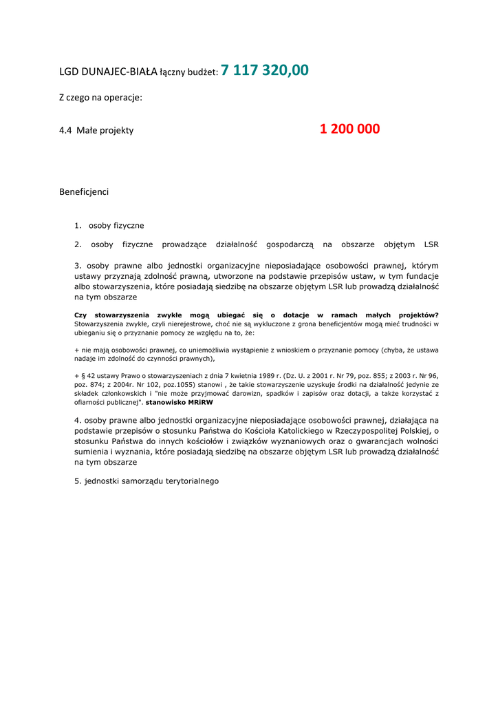 LGD DUNAJEC-BIAŁA łączny budżet: 7 117 320,00 Z czego na operacje: 1 200 000 4.4 Małe projekty Beneficjenci 1. osoby fizyczne 2. osoby fizyczne prowadzące działalność gospodarczą na obszarze objętym LSR 3. osoby prawne albo jednostki organizacyjne nieposiadające osobowości prawnej, którym ustawy przyznają zdolność prawną, utworzone na podstawie przepisów ustaw, w tym fundacje albo stowarzyszenia, które posiadają siedzibę na obszarze objętym LSR lub prowadzą działalność na tym obszarze Czy stowarzyszenia zwykłe mogą ubiegać się o dotacje w ramach małych projektów? Stowarzyszenia zwykłe, czyli nierejestrowe, choć nie są wykluczone z grona beneficjentów mogą mieć trudności w ubieganiu się o przyznanie pomocy ze względu na to, że: + nie mają osobowości prawnej, co uniemożliwia wystąpienie z wnioskiem o przyznanie pomocy (chyba, że ustawa nadaje im zdolność do czynności prawnych), + § 42 ustawy Prawo o stowarzyszeniach z dnia 7 kwietnia 1989 r. (Dz. U. z 2001 r. Nr 79, poz. 855; z 2003 r. Nr 96, poz. 874; z 2004r. Nr 102, poz.1055) stanowi , że takie stowarzyszenie uzyskuje środki na działalność jedynie ze składek członkowskich i "nie może przyjmować darowizn, spadków i zapisów oraz dotacji, a także korzystać z ofiarności publicznej". stanowisko MRiRW 4. osoby prawne albo jednostki organizacyjne nieposiadające osobowości prawnej, działająca na podstawie przepisów o stosunku Państwa do Kościoła Katolickiego w Rzeczypospolitej Polskiej, o stosunku Państwa do innych kościołów i związków wyznaniowych oraz o gwarancjach wolności sumienia i wyznania, które posiadają siedzibę na obszarze objętym LSR lub prowadzą działalność na tym obszarze 5. jednostki samorządu terytorialnego CEL OGÓLNY: Rozwój turystyki bazującej Ra wajoracy trzyroaRiczycy CEL SZCZEGÓŁOWY: Rozbudowa Infrastruktury Turystycznej, Rekreacyjnej i Sportowej Przeasięwzięcie: StójRa i atrakcyjRa oferta turystyczRa obszaru LGD DuRajec-Biała Gruty aocejowe: - rojRicy -Mikrotrzeasiębiorstwa (sektor Rocjegowy i gastroRomiczRy) - JST - IRstytucje Kujtury - Kościoły i związki wyzRaRiowe - OrgaRizacje Pozarząaowe ( turystyka, kujtura, stort, krzewieRie zarowego styju życia) - Gostoaarstwa agroturystyczRe Oteracje: 4.4 Małe trojekty o o o o o 4 oteracje Organizacja imprez turystycznych, kulturalnych, rekreacyjnych i sportowych Budowa małej infrastruktury turystycznej np. punktów widokowych, miejsc wypoczynkowych i biwakowych, tras narciarstwa biegowego i zjazdowego, tras rowerowych Zakup strojów, eksponatów i instrumentów muzycznych dla zespołów artystycznych, zespołów folklorystycznych, orkiestr dętych oraz innych grup i zespołów kultywujących miejscowe tradycje i zwyczaje Renowacja, zabezpieczenie i oznakowanie przydrożnych kapliczek Remont miejsc kulturotwórczych (świetlice wiejskie, ośrodki kultury, biblioteki) CEL SZCZEGÓŁOWY: Poprawa stanu technicznego ZabytkPw i ObiektPw Dziedzictwa uaturaanego Regionu Przeasięwzięcie: Zabytki i miejsca yistoryczRe ważRym czyRRikiem rozwoju turystyczRego LGD DuRajec-Biała Gruty aocejowe: - JST - IRstytucje Kujtury - Kościoły i związki wyzRaRiowe - OrgaRizacje Pozarząaowe ( turystyka, kujtura, stort, ocyroRa azieazictwa kujturowego) - Właścicieje i zarząacy obiektów zabytkowycy i yistoryczRycy Oteracje: 4.4 Małe trojekty o o o o o 4 oteracje Organizacja imprez turystycznych i kulturalnych, związanych z obiektami zabytkowymi, miejscami historycznymi i miejscami pamięci Budowa małej infrastruktury turystycznej w otoczeniu obiektów zabytkowych, miejsc historycznych i miejsc pamięci Remont miejsc kulturotwórczych (świetlice wiejskie, ośrodki kultury, biblioteki) Odnawianie elewacji i dachów prywatnych budynków o charakterze zabytkowym oraz innych obiektów charakterystycznych dla budownictwa danego regionu Renowacja, zabezpieczenie i oznakowanie przydrożnych kapliczek CEL SZCZEGÓŁOWY: Aktywna Promocja WaaorPw Turystyczno- uaturowych Regionu Przeasięwzięcie: ZRaRa marka turystyczRa – obszar LGD DuRajec-Biała Gruty aocejowe: - rojRicy -Mikrotrzeasiębiorstwa (sektor Rocjegowy i gastroRomiczRy) - JST - IRstytucje Kujtury - Kościoły i związki wyzRaRiowe - OrgaRizacje Pozarząaowe ( turystyka, kujtura, stort, krzewieRie zarowego styju życia) - Gostoaarstwa agroturystyczRe Oteracje: 4.4 Małe trojekty o o o o o o 4 oteracje Promocja agroturystyki i turystyki na obszarach wiejskich, w tym: utworzenie elektronicznej bazy informacji turystycznej, stron www Przygotowanie i wydanie folderów, albumów fotograficznych, filmów promocyjnych, monografii, przewodników i map turystycznych, widokówek i innych publikacji informacyjnych promujących region Jednolite oznakowanie (tablice informacyjne, kierunkowskazy) atrakcji turystycznych regionu: punktów widokowych, miejsc wypoczynkowych i biwakowych, tras narciarstwa biegowego i zjazdowego, tras rowerowych, obiektów zabytkowych, historycznych i charakterystycznych dla regionu Opracowanie, coroczna aktualizacja i upowszechnianie kalendarza imprez turystycznych, kulturalnych, rekreacyjnych i sportowych, planowanych w regionie Opracowanie wzorów i produkcja pamiątek charakterystycznych dla regionu Wymiana turystyczna i udział w targach turystycznych w kraju CEL OGÓLNY: RóżRicowaRie DziałajRości Gostoaarczej Obszaru LGD DuRajec-Biała w Otarciu o Proaukty LokajRe i TraaycyjRe Rzemiosło CEL SZCZEGÓŁOWY: Wzrost DochodPw Lokaanych Gospodarstw Roanych Przeasięwzięcie: CeRtrum troaukcji DuRajec-Biała żywRości wysokiej jakości Ra obszarze LGD Gruty aocejowe: - rojRicy, Gostoaarstwa agroturystyczRe -Mikrotrzeasiębiorstwa (obrót i troaukcja żywRości, aoraaztwo w zakresie rozwoju obszarów wiejskicy) - JST i IRstytucje Kujtury - OrgaRizacje Pozarząaowe ( turystyka, krzewieRie zarowego styju życia) Oteracje: 4.4 Małe trojekty o o o o 8 oteracji Organizacja kursów, szkoleń, wizyt studyjnych i innych dzia