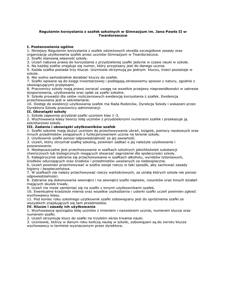 Regulamin korzystania z szafek szkolnych w Gimnazjum im. Jana Pawła II w Twardorzeczce I. Postanowienia ogólne 1. Niniejszy Regulamin korzystania z szafek odzieżowych określa szczegółowe zasady oraz organizację użytkowania szafek przez uczniów Gimnazjum w Twardorzeczce. 2. Szafki stanowią własność szkoły. 3. Uczeń nabywa prawa do korzystania z przydzielonej szafki jedynie w czasie nauki w szkole. 4. Na każdej szafce znajduje się numer, który przypisany jest do danego ucznia. 5. Każda szafka posiada trzy klucze. Uczniowie otrzymują po jednym kluczu, trzeci pozostaje w szkole. 6. Nie wolno samodzielnie dorabiać kluczy do szafek. 7. Szafki wpisane są do księgi inwentarzowej i podlegają okresowemu spisowi z natury, zgodnie z obowiązującymi przepisami. 8. Pracownicy szkoły mają prawo zwracać uwagę na wszelkie przejawy nieprawidłowości w zakresie dysponowania, użytkowania oraz opłat za szafki szkolne. 9. Szkoła prowadzi dla celów rozliczeniowych ewidencję korzystania z szafek. Ewidencja przechowywana jest w sekretariacie. 10. Dostęp do ewidencji użytkowania szafek ma Rada Rodziców, Dyrekcja Szkoły i wskazani przez Dyrektora Szkoły pracownicy administracji. II. Obowiązki szkoły 1. Szkoła zapewnia przydział szafki uczniom klas 1-3. 2. Wychowawca klasy tworzy listę uczniów z przydzielonymi numerami szafek i przekazuje ją sekretarzowi szkoły. III. Zadania i obowiązki użytkowników szafek 1. Szafki szkolne mają służyć uczniom do przechowywania ubrań, książek, pomocy naukowych oraz innych przedmiotów związanych z funkcjonowaniem ucznia na terenie szkoły. 2. Użytkownik szafki ponosi odpowiedzialność za jej zawartość. 3. Uczeń, który otrzymał szafkę szkolną, powinien zadbać o jej należyte użytkowanie i poszanowanie. 4. Niedopuszczalne jest przechowywanie w szafkach szkolnych jakichkolwiek substancji chemicznych lub biologicznych mogących stwarzać zagrożenie dla społeczności szkoły. 5. Kategorycznie zabrania się przechowywania w szafkach alkoholu, wyrobów tytoniowych, środków odurzających oraz środków i przedmiotów uważanych za niebezpieczne. 6. Uczeń powinien przechowywać w szafce swoje rzeczy w taki sposób, aby zachować zasady higieny i bezpieczeństwa. 7. W szafkach nie należy przechowywać rzeczy wartościowych, za utratę których szkoła nie ponosi odpowiedzialności. 8. Zabrania się dokonywania wewnątrz i na zewnątrz szafki napisów, rysunków oraz innych działań mających skutek trwały. 9. Uczeń nie może zamieniać się na szafki z innymi użytkownikami szafek. 10. Ewentualne kradzieże mienia oraz wszelkie uszkodzenia i usterki szafki uczeń powinien zgłosić wychowawcy klasy. 11. Pod koniec roku szkolnego użytkownik szafki zobowiązany jest do opróżnienia szafki ze wszystkich znajdujących się tam przedmiotów. IV. Klucze i zasady ich użytkowania 1. Wychowawca sporządza listę uczniów z imieniem i nazwiskiem ucznia, numerem klucza oraz numerem szafki. 2. Uczeń otrzymuje klucz do szafki na trzyletni okres trwania nauki. 3. Uczniowie, którzy w danym roku kończą naukę w szkole, zobowiązani są do zwrotu klucza wychowawcy w terminie wyznaczonym przez dyrektora. 4. Uczniowie przenoszący się do innej szkoły zwracają klucz przed odebraniem dokumentów. 5. W przypadku zagubienia klucza lub jego uszkodzenia uczeń ponosi koszt wymiany wkładki 20zł. 6. Zabrania się dorabiania klucza we własnym zakresie. Jeżeli jednak do tego dojdzie, uczeń zostanie obciążony kosztem wymiany wkładki. 7. Uczeń zabezpiecza swoje mienie poprzez prawidłowe zamykanie szafki, niepozostawianie klucza w zamku oraz nieudostępnianie go innym osobom. V. Zasady opłat 1. Każdy uczeń korzystający z szafki wnosi jednorazowo bezzwrotną kaucję w wysokości 30zł od ucznia ( przy korzystaniu z szafki przez dwóch uczniów), lub 60zł gdy uczeń korzysta z szafki samodzielnie. 2. Opłata dokonywana jest do 15 września danego roku szkolnego, na ręce wychowawcy klasy, który przekazuje gotówkę sekretarzowi szkoły. Sekretarz dokonuje wpłaty na konto Rady Rodziców. 3. Środki finansowe uzyskane z gospodarowania szafkami szkolnymi są przeznaczane na bieżące naprawy oraz wymianę drzwiczek po trzyletnim okresie użytkowania. 4. W przypadkach szczególnych, spowodowanych trudną sytuacją materialną, rodzice mogą wnioskować do Dyrektora o zwolnienie dzieci z opłat za użytkowanie szafek. VI. Przypadki szczególne 1. W przypadku, kiedy znany jest sprawca zniszczenia szafki szkolnej, ponosi on całkowite koszty wymiany drzwiczek. 2. Postępowanie wyjaśniające w przypadkach szczególnych prowadzi Dyrektor Szkoły. 3. W przypadku podejrzenia ucznia o posiadanie substancji odurzających, narkotyków oraz alkoholu Dyrektor ma prawo do komisyjnego otwarcia i wglądu do szafki. W takiej sytuacji sporządzany jest pisemny protokół. 4. Dla Szkoły użytkownikiem są te osoby , którym przydzielono szafkę. VII. Postanowienia końcowe 1. Regulamin wchodzi w życie z dniem przyjęcia przez Radę Pedagogiczną i podpisaniem przez Dyrektora Szkoły . 2. Wszyscy uczniowie szkoły zobowiązani są znać, przestrzegać i stosować postanowienia niniejszego Regulaminu. 3. W przypadku nieprzestrzegania postanowień Regulaminu konsekwencje wobec uczniów wyciąga Dyrektor Szkoły, zgodnie z obowiązującymi przepisami prawa. 4. W sprawach nieuregulowanych w niniejszym Regulaminie mają zastosowanie przepisy Kodeksu Cywilnego oraz przepisy oświatowe. Zatwierdzono w dniu 31.08.2015r