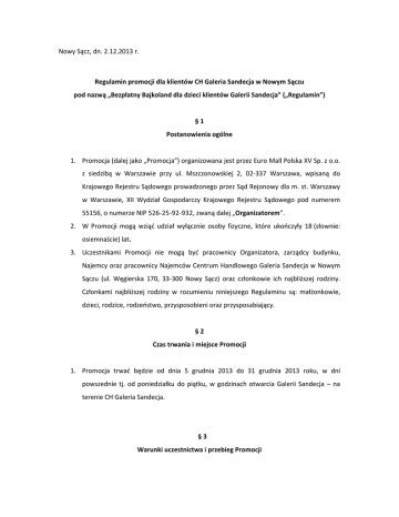 Nowy Sącz, dn. 2.12.2013 r. Regulamin promocji dla klientów CH Galeria Sandecja w Nowym Sączu pod nazwą „Bezpłatny Bajkoland dla dzieci klientów Galerii Sandecja” („Regulamin”) §1 Postanowienia ogólne 1. Promocja (dalej jako „Promocja”) organizowana jest przez Euro Mall Polska XV Sp. z o.o. z siedzibą w Warszawie przy ul. Mszczonowskiej 2, 02-337 Warszawa, wpisaną do Krajowego Rejestru Sądowego prowadzonego przez Sąd Rejonowy dla m. st. Warszawy w Warszawie, XII Wydział Gospodarczy Krajowego Rejestru Sądowego pod numerem 55156, o numerze NIP 526-25-92-932, zwaną dalej „Organizatorem”. 2. W Promocji mogą wziąć udział wyłącznie osoby fizyczne, które ukończyły 18 (słownie: osiemnaście) lat. 3. Uczestnikami Promocji nie mogą być pracownicy Organizatora, zarządcy budynku, Najemcy oraz pracownicy Najemców Centrum Handlowego Galeria Sandecja w Nowym Sączu (ul. Węgierska 170, 33-300 Nowy Sącz) oraz członkowie ich najbliższej rodziny. Członkami najbliższej rodziny w rozumieniu niniejszego Regulaminu są: małżonkowie, dzieci, rodzice, rodzeństwo, przysposobieni oraz przysposabiający. §2 Czas trwania i miejsce Promocji 1. Promocja trwać będzie od dnia 5 grudnia 2013 do 31 grudnia 2013 roku, w dni powszednie tj. od poniedziałku do piątku, w godzinach otwarcia Galerii Sandecja – na terenie CH Galeria Sandecja. §3 Warunki uczestnictwa i przebieg Promocji 1. Osoby, biorące udział Promocji powinny zgłosić zamiar uczestnictwa w Promocji w chwili przekazywania dziecka pracownikom Centrum Zabaw Dla Dzieci "Bajkoland" Jolanta Gowgiel (dalej jako „Bajkoland”) znajdującego się na I piętrze od strony wejścia głównego (obok salonu Mohito) w Galerii Sandecja. 2. Po otrzymaniu zgłoszenia pracownicy Bajkolandu dokonają wpisu na Listę uczestników Promocji, stanowiącej załącznik nr 1 do niniejszego Regulaminu (dalej jako Lista), poprzez wprowadzenie następujących danych: imię, nazwisko, numer telefonu, godzina przekazania dziecka, podpis potwierdzający akceptację warunków Promocji i niniejszego Regulaminu oraz zgodę na przetwarzanie danych osobowych w celu realizacji celów Promocji, 3. Wypełnienie pozostałych rubryk Listy to jest: numer paragonu, wartość zakupów oraz czas korzystania z placu zabaw nastąpi w chwili odbioru dziecka z Bajkolandu. 4. Wyznaczona przez Organizatora osoba (pracownik Bajkolandu) oznaczy pieczątką każdy zgłaszany w Promocji dowód zakupu celem uniemożliwienia kilkukrotnego skorzystania z paragonu oraz uzupełni Listę. §4 Nagrody w Promocji 1. Nagrodą w promocji jest darmowe korzystanie z usług Bajkolandu. 2. Uprawnienie do zwolnienia z opłat za usługę Bajkolandu, z zastrzeżeniem § 4 pkt 4, przysługiwać będzie po okazaniu wyznaczonym pracownikom Bajkolandu upoważniających do wzięcia udziału w Promocji paragonów, będących dowodem dokonania zakupów w sklepach lub innych punktach handlowych lub usługowych, z wyłączeniem hipermarketu Carrefour, znajdujących się na terenie Galerii Sandecja oraz udostępnienie ich do sporządzenia fotokopii. 3. Zakupy o których mowa powyżej muszą zostać dokonane w tym sam dniu, w czasie trwania Promocji i sumują się na kwotę łączną o wartości 100 zł, 200 zł lub 300 zł. 4. Osobami, które otrzymają nagrody będą osoby, które spełnią wszystkie warunki Regulaminu Promocji. 5. Czas darmowego korzystania z Bajkolandu dla 1 (słownie: jednego) dziecka uzależniony jest od sumy wartości wskazanych § 4 pkt 2 paragonów i przedstawia się następująco: a) przy zakupach za kwotę od 100 zł do 199,99 zł – 1 (słownie: jedna) godzina, b) przy zakupach za kwotę od 200 zł do 299,99 zł – 2 (słownie: dwie) godziny, c) przy zakupach za kwotę 300 zł i powyżej – 3 (słownie: trzy) godziny. 6. W przypadku braku przedstawienia paragonów o odpowiednio określonej § 4 pkt 5 wartości wpisany na Listę uczestnik zobowiązany się zapłacić za usługę zgodnie z obowiązującym cennikiem Centrum Zabaw Dla Dzieci "Bajkoland" Jolanta Gowgiel. §5 Postanowienia końcowe 1. Poprzez zgłoszenie uczestnictwa w Promocji w trybie określonym w § 3 Regulaminu Promocji Uczestnik Promocji wyraża jednocześnie zgodę na postanowienia Regulaminu Promocji. 2. W związku z Promocją przewidzianą niniejszym Regulaminem, Organizator i administrator danych, będzie przetwarzał dane osobowe Uczestników, którzy zgodnie z postanowieniami Regulaminu są objęci Promocją. Dane będą przetwarzane w celu realizacji Promocji. 3. Informacje o Promocji, w tym niniejszy Regulamin, dostępne są przez cały okres trwania Promocji w Biurze Administracji Galerii Sandecja oraz w Bajkolandzie.