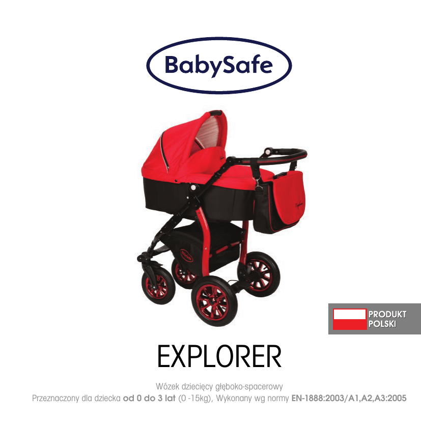 EXPLORER Wózek dziecięcy głęboko-spacerowy Przeznaczony dla dziecka od 0 do 3 lat (0 -15kg), Wykonany wg normy EN-1888:2003/A1,A2,A3:2005 DZIĘKUJEMY ZA ZAKUP NASZEGO WÓZKA Przed rozpoczęciem użytkowania należy przeczytać niniejszą instrukcję i zachować ją na później. Bezpieczeństwo dziecka może być zagrożone w przypadku nie stosowania zaleceń zawartych w niniejszej instrukcji! OSTRZEŻENIA: - Wózek przeznaczony jest dla dzieci w wieku 0-36 miesięcy i do masy 15 kg. - Pozostawienie dziecka bez opieki może grozić niebezpieczeństwem. - Przed użyciem wózka upewnij się, że mechanizmy składania wózka zostały zablokowane. - Używaj, szelek gdy dziecko zacznie samodzielnie siadać. - Nie stosuj materacyka grubszego niż 20 mm. - Zawsze używaj pasa krokowego w połączeniu z pasem biodrowym. - Każde obciążenie zawieszone na prowadnicy wózka narusza jego stabilność. - Produkt nie jest przeznaczony do jazdy na rolkach, łyżwach ani do biegania. - Wózek służy do przewozu tylko 1 dziecka. - Nigdy nie zostawiaj wózka z dzieckiem na pochyłości nawet jeśli hamulec został zablokowany, gdyż istnieje prawdopodobieństwo zsunięcia. - Nie używaj wózka jeśli jakikolwiek jego element został uszkodzony. - Upewnij się, że podczas składania i rozkładania wózka dziecko znajduje się w bezpiecznej odległości. - Dokonując, regulacji należy upewnić się, że części ruchome produktu nie stykają się z częściami ciała dziecka. - Zawsze należy blokować hamulec podczas postoju. - Nie przenoś gondoli z dzieckiem w środku. Uchwyt w budce służy wyłącznie do przenoszenia pustej gondoli. - Nigdy nie przenoś wózka z dzieckiem w środku, trzymając za barierkę. Grozi wypadkiem. - Maksymalne obciążenie koszyka wynosi 2 kg. - Maksymalne obciążenie torby wynosi 2 kg. - W produkcie powinny być zastosowane wyłącznie oryginalne części zatwierdzone przez producenta. - Wjeżdżając na krawężnik lub inny stopień należy podnieść przednie zawieszenie. - Nie zjeżdżać wózkiem po schodach. - Wózek należy przechowywać w miejscu suchym, niedostępnym dla dzieci. - Zabrania się poprzecznego kołysania wózka na boki. INSTRUKCJA OBSŁUGI ROZKŁADANIE WÓZKA Aby rozłożyć wózek, połóż go na płasko (rys. 1), przeciągnij rączkę do góry, a następnie energicznie do siebie, aż do zablokowania się mechanizmu składania. UWAGA ! Upewnij się, że wózek jest prawidłowo rozłożony przed rozpoczęciem użytkowania. MONTAŻ I DEMONTAŻ KÓŁ Aby zdemontować koła tylne, wciśnij przycisk znajdujący się w centralnej części koła (rys. 2) i zdejmij je z osi. Aby je powtórnie zamontować wsuń koła na oś, aż do momentu zablokowania trzymając wciśnięty przycisk w centralnej części koła. Koła przednie zdejmujemy poprzez przyciśnięcie górnego przycisku w obrotnicy (rys. 4) i wyjmujemy całe koło z osią. Aby powtórnie założyć koło należy oś włożyć do obrotnicy i wciskać, aż do momentu zablokowania (rys. 4). UWAGA ! Upewnij się, że wszystkie koła są prawidłowo zamontowane, przed rozpoczęciem użytkowania. HAMULEC POSTOJOWY Wózek wyposażony jest w hamulec postojowy tylny. Aby zablokować hamulec, wciśnij jego stopkę (rys. 5). W celu odblokowania, unieś stopkę. UWAGA ! Przed rozpoczęciem jazdy, upewnij się, że hamulec jest odblokowany. UWAGA ! Zawsze blokuj hamulec bezpieczeństwa, gdy pozostawisz wózek na nachylonej powierzchni. UWAGA ! Hamulec nie służy do zwalniania, należy go zablokować po całkowitym zatrzymaniu wózka. REGULACJA WYSOKOŚCI RĄCZKI Wózek posiada regulację wysokości rączki. Aby dokonać regulacji , wciśnij okrągłe przyciski, znajdujące się po obu stronach rączki, a następnie ustaw właściwą wysokość (rys. 6) MONTAŻ I DEMONTAŻ GONDOLI Aby zamontować gondolę ustaw plastikowe prowadnice pionowo (rys. 7).Następnie wprowadź je do kaset znajdujących się po obu stronach ramy do momentu zablokowania. Aby gondolę zdemontować, naciśnij jedną ręką przycisk znajdujący się przy kasecie, a następnie pociągnij gondolę ku górze (rys. 8) UWAGA ! Przed rozpoczęciem użytkowania wózka upewnij się, że gondola jest prawidłowo zamontowana. Gondola posiada funkcję kołysania i regulowany podgłówek, którego pozycję uzyskujemy pociągając go do góry, a opuszczamy podnosząc blokadę (rys. 9). Funkcję kołysania gondoli blokujemy przez wysunięcie podpórek z przodu i tyłu gondoli. REGULACJA BUDKI Regulacja budki wózka przy gondoli odbywa się poprzez naciśnięcie przycisków po obu stronach budki (rys. 10). Montaż budki wózka przy spacerówce odbywa się na wcisk w przeznaczone do tego otwory (rys. 11). Późniejsza regulacja odbywa się poprzez delikatne przesuwanie do przodu lub do tyłu. MONTAŻ I DEMONTAŹ SIEDZISKA Wózek posiada możliwość montażu siedziska zarówno przodem jak i tyłem do kierunku jazdy (rys. 12). Siedzisko montujemy i demontujemy tak samo jak gondolę (patrz MONTAŻ I DEMONTAŻ GONDOLI). UWAGA ! Upewnij się ,że siedzisko jest prawidłowo zamontowane przed rozpoczęciem użytkowania. UWAGA ! Wózek składać przy oparciu złożonym do pozycji leżącej. REGULACJA PODNÓŻKA Wózek ma regulowany podnóżek. By ustawić we właściwej pozycji wcśnij przyciski po obu stronach (rys. 13). MONTAŻ I DEMONTAŻ BARIERKI Siedzisko posiada barierkę bezpieczeństwa. Aby ją zamontować zamknij „skrzydełka” blokady. W celu jej zdemontowania należy otworzyć „skrzydełka” blokady (rys. 14), a następnie pociągnąć do siebie. Barierkę można odpinać jednostronnie. UWAGA ! Zawsze używaj barierki razem z pasem zabezpieczającym, gdy w siedzisku znajduje się dziecko. UWAGA ! Barierka nie służy do przenoszenia wózka. PASY BEZPIECZEŃSTWA Siedzisko wyposażone jest w 5-punktowe pasy bezpieczeństwa. Należy ich używać od momentu, gdy dziecko zaczyna samodzielnie siadać. Usadź dziecko, wyreguluj długość paskó