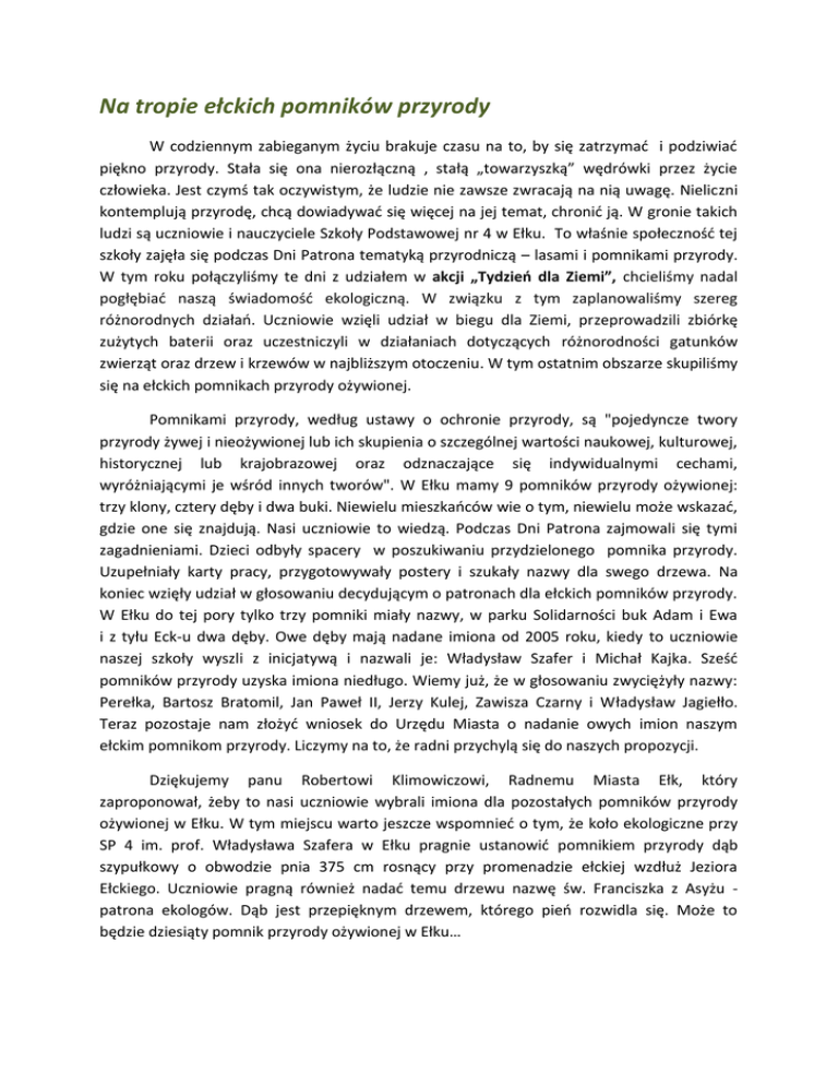Na tropie ełckich pomników przyrody W codziennym zabieganym życiu brakuje czasu na to, by się zatrzymać i podziwiać piękno przyrody. Stała się ona nierozłączną , stałą „towarzyszką” wędrówki przez życie człowieka. Jest czymś tak oczywistym, że ludzie nie zawsze zwracają na nią uwagę. Nieliczni kontemplują przyrodę, chcą dowiadywać się więcej na jej temat, chronić ją. W gronie takich ludzi są uczniowie i nauczyciele Szkoły Podstawowej nr 4 w Ełku. To właśnie społeczność tej szkoły zajęła się podczas Dni Patrona tematyką przyrodniczą – lasami i pomnikami przyrody. W tym roku połączyliśmy te dni z udziałem w akcji „Tydzień dla Ziemi”, chcieliśmy nadal pogłębiać naszą świadomość ekologiczną. W związku z tym zaplanowaliśmy szereg różnorodnych działań. Uczniowie wzięli udział w biegu dla Ziemi, przeprowadzili zbiórkę zużytych baterii oraz uczestniczyli w działaniach dotyczących różnorodności gatunków zwierząt oraz drzew i krzewów w najbliższym otoczeniu. W tym ostatnim obszarze skupiliśmy się na ełckich pomnikach przyrody ożywionej. Pomnikami przyrody, według ustawy o ochronie przyrody, są "pojedyncze twory przyrody żywej i nieożywionej lub ich skupienia o szczególnej wartości naukowej, kulturowej, historycznej lub krajobrazowej oraz odznaczające się indywidualnymi cechami, wyróżniającymi je wśród innych tworów". W Ełku mamy 9 pomników przyrody ożywionej: trzy klony, cztery dęby i dwa buki. Niewielu mieszkańców wie o tym, niewielu może wskazać, gdzie one się znajdują. Nasi uczniowie to wiedzą. Podczas Dni Patrona zajmowali się tymi zagadnieniami. Dzieci odbyły spacery w poszukiwaniu przydzielonego pomnika przyrody. Uzupełniały karty pracy, przygotowywały postery i szukały nazwy dla swego drzewa. Na koniec wzięły udział w głosowaniu decydującym o patronach dla ełckich pomników przyrody. W Ełku do tej pory tylko trzy pomniki miały nazwy, w parku Solidarności buk Adam i Ewa i z tyłu Eck-u dwa dęby. Owe dęby mają nadane imiona od 2005 roku, kiedy to uczniowie naszej szkoły wyszli z inicjatywą i nazwali je: Władysław Szafer i Michał Kajka. Sześć pomników przyrody uzyska imiona niedługo. Wiemy już, że w głosowaniu zwyciężyły nazwy: Perełka, Bartosz Bratomil, Jan Paweł II, Jerzy Kulej, Zawisza Czarny i Władysław Jagiełło. Teraz pozostaje nam złożyć wniosek do Urzędu Miasta o nadanie owych imion naszym ełckim pomnikom przyrody. Liczymy na to, że radni przychylą się do naszych propozycji. Dziękujemy panu Robertowi Klimowiczowi, Radnemu Miasta Ełk, który zaproponował, żeby to nasi uczniowie wybrali imiona dla pozostałych pomników przyrody ożywionej w Ełku. W tym miejscu warto jeszcze wspomnieć o tym, że koło ekologiczne przy SP 4 im. prof. Władysława Szafera w Ełku pragnie ustanowić pomnikiem przyrody dąb szypułkowy o obwodzie pnia 375 cm rosnący przy promenadzie ełckiej wzdłuż Jeziora Ełckiego. Uczniowie pragną również nadać temu drzewu nazwę św. Franciszka z Asyżu patrona ekologów. Dąb jest przepięknym drzewem, którego pień rozwidla się. Może to będzie dziesiąty pomnik przyrody ożywionej w Ełku…