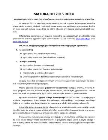 MATURA OD 2015 ROKU INFORMACJA DYREKCJI VII LO DLA UCZNIÓW KLAS PIERWSZYCH I DRUGICH ORAZ ICH RODZICÓW W kwietniu 2015 r. zakończy naukę pierwszy rocznik uczniów, którzy przez wszystkie etapy swojej szkolnej edukacji realizowali nową, zmienioną podstawę programową. Będzie on także zdawać maturę inną od tej, do której obecnie przystępują absolwenci szkół średnich. Informatory zawierające wymagania maturalne z poszczególnych przedmiotów oraz przykładowe zadania egzaminacyjne zamieszczone są na stronach www.cke.edu.pl oraz www.oke.waw.pl Od 2015 r. zdający przystępuje obowiązkowo do następujących egzaminów: 1. w części ustnej a) język polski (bez określania poziomu) b) język obcy nowożytny (bez określania poziomu) 2. w części pisemnej a) język polski (poziom podstawowy) b) język obcy nowożytny (poziom podstawowy) c) matematyka (poziom podstawowy) d) wybrany przedmiot dodatkowy zdawany na poziomie rozszerzonym Zdający może też przystąpić do innych wybranych egzaminów zdawanych na poziomie rozszerzonym (nie więcej niż pięciu). Można zdawać następujące przedmioty rozszerzone: biologia, chemia, filozofia, fizyka, geografia, historia, historia muzyki, historia sztuki, informatyka, język łaciński i kultura antyczna, język obcy nowożytny, język polski, matematyka, wiedza o społeczeństwie. Egzamin maturalny z języka obcego nowożytnego można zdawać z następujących języków: angielskiego, francuskiego, hiszpańskiego, niemieckiego, rosyjskiego, włoskiego (także w przypadku, gdy dany język nie był nauczany w szkole, którą zdający ukończył). Dokonując wyboru przedmiotów zdawanych na poziomie rozszerzonym zdający powinien kierować się własną znajomością materiału z poszczególnych przedmiotów oraz wymaganiami rekrutacyjnymi uczelni, o przyjęcie do której będzie się ubiegać. Do egzaminu maturalnego zdający przystępuje w szkole, którą ukończył. Na egzamin do innej szkoły zdający może być skierowany- w przypadku części ustnej z języka obcego – jeśli w danej szkole nie ma nauczycieli - specjalistów z zakresu danego języka obcego nowożytnego. W roku szkolnym, w którym zdający przystępuje do egzaminu maturalnego: do 30 września składa wstępną deklarację dotyczącą przedmiotów zdawanych na egzaminie maturalnym do 7 lutego składa ostateczną deklarację Zakodowane arkusze egzaminacyjne (egzaminy pisemne) są sprawdzane przez komisje złożone z egzaminatorów wpisanych do rejestru okręgowej komisji egzaminacyjnej poza szkołą macierzystą zdającego. Wypowiedzi zdających egzamin ustny są oceniane w szkole przez komisję złożoną z dwóch osób (nauczyciel ze szkoły macierzystej, który nie uczył zdającego oraz nauczyciel spoza szkoły; co najmniej jeden z nich musi być egzaminatorem wpisanym do ewidencji okręgowej komisji egzaminacyjnej). Aby zdać egzamin, absolwent musi: otrzymać co najmniej 30% punktów możliwych do uzyskania z każdego przedmiotu obowiązkowego w części ustnej (egzaminy bez określania poziomu) i pisemnej (egzaminy na poziomie podstawowym) przystąpić do jednego egzaminu dodatkowego na poziomie rozszerzonym Wyniki egzaminów dodatkowych nie decydują o zdaniu matury, są jednak istotne przy rekrutacji na studia. Wyniki egzaminów maturalnych można podwyższać w okresie 5 lat od pierwszego zdawanego egzaminu. Jeśli absolwent nie zdał egzaminu, może przystąpić do niezdanych egzaminów w ciągu 5 lat od pierwszego zdawanego egzaminu. Egzamin maturalny obejmuje nie tylko treści nauczane w liceum, lecz także na niższych etapach edukacji (w szkole podstawowej i gimnazjum). NAJISTOTNIEJSZE ZMIANY W EGZAMINACH PRZEDMIOTOWYCH Język polski: odejście od formy prezentacji na egzaminie ustnym i zastąpienie jej egzaminem ustnym, podczas którego zdający będzie musiał ad hoc przygotować samodzielną wypowiedź argumentacyjną rezygnacja z klucza odpowiedzi w ocenianiu prac pisemnych zwiększenie roli tekstów teoretycznoliterackich i historycznoliterackich na maturze rozszerzonej Historia: kompleksowe sprawdzanie umiejętności z zakresu chronologii historycznej, analizy i interpretacji historycznej oraz tworzenia rozbudowanej wypowiedzi pisemnej na jeden z podanych tematów Wiedza o społeczeństwie: położenie akcentu na sprawdzanie umiejętności złożonych (interpretowanie informacji, dostrzeganie związków przyczynowo -skutkowych) w oparciu o poszerzony zakres materiałów źródłowych (teksty prawne, naukowe, publicystyczne, materiały statystyczne, mapy, rysunki). Matematyka: zwiększenie wymagań na poziomie rozszerzonym przez włączenie zadań z rachunku różniczkowego i pojęć zaawansowanej matematyki zwiększenie wymagań z zakresu kombinatoryki oraz teorii prawdopodobieństwa Biologia i chemia zwiększenie znaczenia umiejętności wyjaśniania procesów i zjawisk ocena umiejętności analizy eksperymentu Fizyka: zwiększenie znaczenia rozumienia istoty zjawisk tworzenie formuł matematycznych łączących kilka zjawisk sprawdzanie poziomu umiejętności planowania i opisu doświadczeń sprawdzanie umiejętności analizy wyników z uwzględnieniem niepewności pomiarowych Geografia: uwzględnienie interdyscyplinarności tej nauki (wykorzystanie wiedzy z nauk przyrodniczych do analizy zjawisk i procesów zachodzących w środowisku geograficznym) wzbogacenie zasobu materiałów źródłowych (mapy, wykresy, tabele statystyczne, teksty źródłowe, zdjęcia, w tym lotnicze i satelitarne) ZMIANA DOTYCZĄCA ŚWIADECTWA Na świadectwach maturalnych od 2015 r. wprowadzona zostanie dodatkowa forma określenia wyniku uzyskanego przez zdającego w postaci jego pozycji na skali centylowej (określa, jaki procent zdających uzyskał taki sam lub słabszy wynik od posiadacza świadectwa- dzięki temu łatwo określić też odsetek zdających, którzy uzyskali wynik wyższy).
