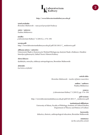 2 http://www.laboratoriumkultury.us.edu.pl tytuł artykułu: Bronisław Malinowski – nauczyciel przyszłych badaczy autor / autorzy: Paulina Miśkiewicz źródło: „Laboratorium Kultury” 2 (2013), s. 174–194 wersja pdf: http://www.laboratoriumkultury.us.edu.pl/pdf/LK-2013-7_ miskiewicz.pdf afiliacja autora / autorów: Uniwersytet Śląski w Katowicach, Wydział Filologiczny, Instytut Nauk o Kulturze i Studiów Interdyscyplinarnych, Zakład Teorii i Historii Kultury słowa klucze: dydaktyka, retoryka, edukacja antropologiczna, Bronisław Malinowski abstrakt: (na końcu artykułu) article title: Bronisław Malinowski – teacher of future reaserchers author / authors: Paulina Miśkiewicz source: „Laboratorium Kultury” 2 (2013), pp. 174–194 pdf version: http://www.laboratoriumkultury.us.edu.pl/pdf/LK-2013-7_ miskiewicz.pdf institutional affiliation: University of Silesia, Faculty of Philology, Institute of Cultural Studies, Department of Theory and History of Culture keywords: didactics, rhetoric, anthropological education, Bronislaw Malinowski summary: (at the end of the article) 173 Laboratorium Kultury 2 (2013) Paulina Miśkiewicz Studentka kulturoznawstwa UŚ (specjalność: teoria i historia kultury). Interesuje się przejawami hiperrealności w Stanach Zjednoczonych i historią kultury śląskich miast. 174 Paulina Miśkiewicz Bronisław Malinowski – nauczyciel przyszłych badaczy A zatem zarówno pod względem charakteru jak i wykształcenia w wymowie jak najwybitniejszy powinien być ten człowiek, który na wzór Homerowego Fojniksa ma uczyć słowa i czynu. Marek Fabiusz Kwintylian, Kształcenie mówcy1 Treść Argonautów zachodniego Pacyfiku pozwala czytelnikowi poznać rytuały, działania związane z systemem kula, rodzaj mentalności tubylców i szczegóły życia codziennego mieszkańców Wysp Trobriandzkich. Bronisław Malinowski nie skupił się jednak tylko na przekazaniu informacji uzyskanych w czasie swojego pobytu w Oceanii, ale też dokładnie opisał sposób, w jaki te informacje zebrał. Zwracając się bezpośrednio do hipotetycznego odbiorcy, instruował, jak należy się zachowywać, prowadzić badania i zapisywać dane etnograficzne podczas wyprawy. Wskazywał błędy, których nie należy popełniać oraz podsuwał pomysły, jak tych błędów uniknąć. Retoryczne określenia miały kształtować 1 Marek Fabiusz Kwintylian, Kształcenie mówcy, przeł. M. Brożek, Wydawnictwo Akademickie „Żak”, Warszawa 2002, s. 173. 175 Laboratorium Kultury 2 (2013) przyszłych badaczy terenowych. Grażyna Kubica we wstępie do najnowszego polskiego wydania Argonautów… przywołuje antropologów, którzy po wielu latach od pierwszej edycji tej pracy, nadal prowadzą swoje badania inspirując się metodami, wskazówkami i przestrogami Malinowskiego2. W tym artykule, na podstawie wyrażeń dydaktycznych3 znajdujących się w rozdziale Introduction. The subject, method and scope of this inquiry4, postaram się przybliżyć charakterystyczny dla autora Ogrodów koralowych i ich magii sposób przekazywania wiedzy. Tekst słynnego Wprowadzenia jest sformułowany w taki sposób, że podczas czytania go mam wrażenie jakbym znajdowała się na konwersatorium, w trakcie którego prowadzący ciągle zachęca studentów do dyskusji, zadaje pytania i nie pozwala biernie podchodzić do tematu zajęć. Dalsze rozdziały również zawierają bezpośrednie zwroty do odbiorcy, lecz bardziej przypominają formą pełen dygresji wykład, niż dynamiczne zajęcia, których podstawą, moim zdaniem, mogłoby być Wprowadzenie5. Ten dydaktyczny aspekt tekstu postaram się uwypuklić za pomocą narzędzi strukturalistycznych. W tabelach zawrę większość wypowiedzi, które kojarzą się z nauczaniem, stronę na której się znajdują oraz ich umiejscowienie w tekście. Postaram się również określić treść, której dotyczą konkretne zwroty i omówić sposób przekazania informacji. Moja analiza nie ma być jedynie statystycznym zobrazowaniem tekstu, jej celem jest również dookreślenie, które informacje Bronisław Malinowski zaznaczył jako te najbardziej warte przekazania czytelnikom. Część wypowiedzi, które umieszczam w tabelach nie zawiera zwrotów retorycznych kojarzących się z uczeniem, lecz pośrednio wskazuje na sposoby działania etnologa poprzez przykłady lub konkretne instrukcje. Cytaty zawarte w zestawieniu zwykle są merytorycznymi całostkami, „motywami”, które po rozłożeniu na mniejsze części nie miałyby wartości naukowej bez dalszej partii tekstu lub przynajmniej poczynionych do danego fragmentu uwag. Czasami pojawiają się jednak niepełne wyrażenia. W takich przypadkach w kolumnie „Treść i uwagi” staram się dookreślić brakujący kontekst. Pojęcie „motywu”, podobnie jak Władimir Propp, zapożyczyłam od Aleksandra Wiesiołowskiego, 2 G. Kubica, Argonauci, Triobrandy i kula z perspektywy stulecia, w: B. Malinowski, Argonauci zachodniego Pacyfiku. Relacje o poczynaniach i przygodach krajowców z Nowej Gwinei, przeł. B. Olszewska-Dyoniziak, S. Szynkiewicz, przekł. opracował i posł. opatrzył A. Waligórski, PWN, Warszawa 2005, s. XX. 3 Za wyrażenia dydaktyczne uznaję wypowiedzi, które mają na celu instruowanie czytelnika, przekazanie wskazówek lub przestróg. 4 B. Malinowski, Argonauts of the Western Pacific. An account of native enterprise and adventures in the Archipelagoes of Melanesian New Guinea, George Routledge & Sons, Ltd., London 1932. 5 Dla ułatwienia odczytu będę czasami używała polskich określeń zaczerpniętych z: B. Malinowski, Argonauci… 176 Paulina Miśkiewicz, Bronisław Malinowski – nauczyciel... który uważał, że jest to nierozkładalna na mniejsze części logiczna jednostka narracji6, ponieważ jednak analizuję inny typ tekstu i poszczególne elementy wskazuję w oparciu o inne wyznaczniki, „motyw” traktuję tylko jako ogólną jednostkę strukturyzacji tekstu. Dzielę wy