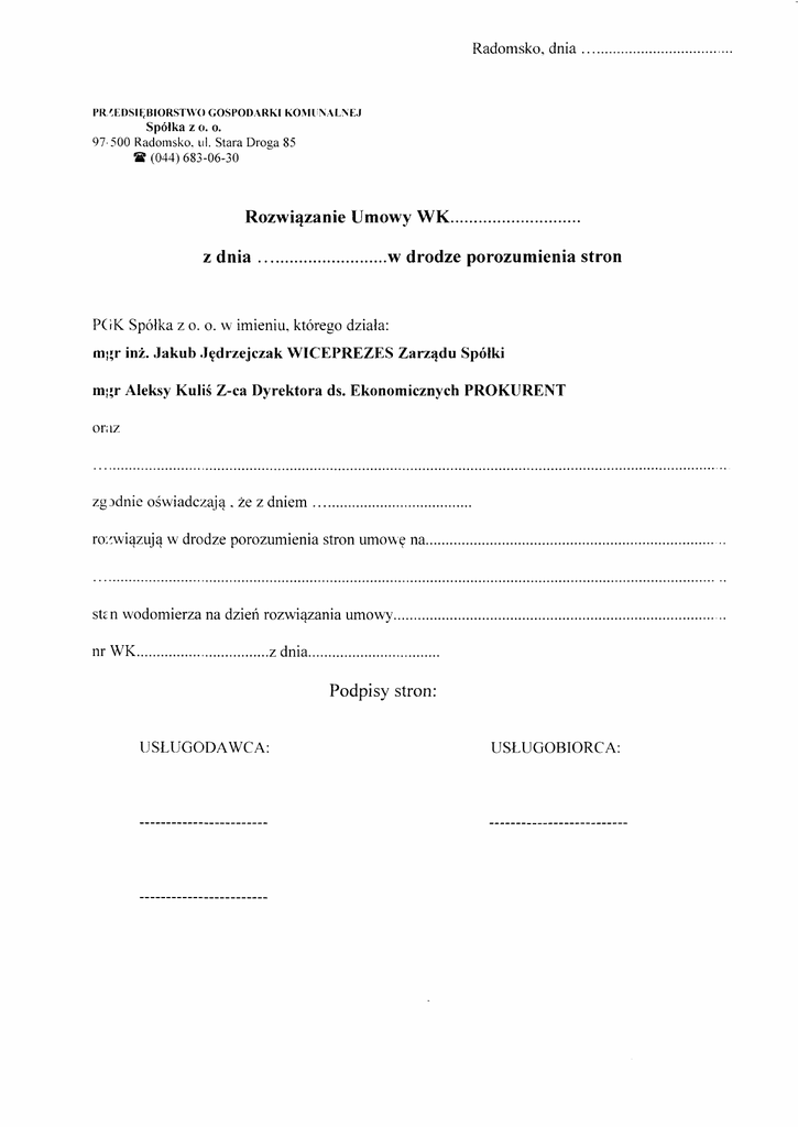 PR,ŁEDSlĘBIoRST\1'() GoSPoDARKIKoNttiNALNEJ SpÓłka z o. o. 97. 500R adom s k o u , l . S ta raD ro g a8 5 I (044)683-06-30 Rozwiązanie Umowy wK. .w drodze porozumieniastron z dnia P(iK SpotkaZ o. o. w imieniu,ktoregodziaŁa: mi|r inż.Jakub .Iędrzejczak WICEPREZES Zarządu SpÓłki mi|r Aleksy Kuliś Z-ca Dyrektora ds. Ekonomicznych PROKURENT Of',lZ sten wod omlerza na dzien rozwiqzania umowy.. nr WK. ..2 dnia. Podpisy stron: tJSŁUGoDAWCA: USŁUGOBIoRCA: