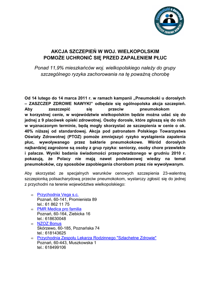 AKCJA SZCZEPIEŃ W WOJ. WIELKOPOLSKIM POMOŻE UCHRONIĆ SIĘ PRZED ZAPALENIEM PŁUC Ponad 11,9% mieszkańców woj. wielkopolskiego należy do grupy szczególnego ryzyka zachorowania na tę poważną chorobę Od 14 lutego do 14 marca 2011 r. w ramach kampanii „Pneumokoki u dorosłych – ZASZCZEP ZDROWE NAWYKI” odbędzie się ogólnopolska akcja szczepień. się przeciw pneumokokom Aby zaszczepić w korzystnej cenie, w województwie wielkopolskim będzie można udać się do jednej z 9 placówek opieki zdrowotnej. Osoby dorosłe, które zgłoszą się do nich w wyznaczonym terminie, będą mogły skorzystać ze szczepienia w cenie o ok. 40% niższej od standardowej. Akcja pod patronatem Polskiego Towarzystwa Oświaty Zdrowotnej (PTOZ) pomoże zmniejszyć ryzyko wystąpienia zapalenia płuc, wywoływanego przez bakterie pneumokokowe. Wśród dorosłych najbardziej zagrożone są osoby z grup ryzyka: seniorzy, osoby chore przewlekle i palacze. Wyniki badania świadomości przeprowadzonego w grudniu 2010 r. pokazują, że Polacy nie mają nawet podstawowej wiedzy na temat pneumokoków, czy sposobów zapobiegania chorobom przez nie wywoływanym. Aby skorzystać ze specjalnych warunków cenowych szczepienia 23-walentną szczepionką polisacharydową przeciw pneumokokom, wystarczy zgłosić się do jednej z przychodni na terenie województwa wielkopolskiego: • • • • Przychodnia Vega s.c. Poznań, 60-141, Promienista 89 tel.: 61 862 11 75 PMR Medica pro familia Poznań, 60-164, Ziebicka 16 tel.: 618630048 NZOZ Bonus Skórzewo, 60-185, Poznańska 74 tel.: 618143625 Przychodnia Zespołu Lekarza Rodzinnego "Szlachetne Zdrowie" Poznań, 60-443, Muszkowska 1 tel.: 618499106 • • • • • Zespół Lekarza Rodzinnego "Pro Familia" Czerwonak, 62-004, Działkowa 2 tel.: 618120400 NSZOZ Inmed Konin, 62-510, ul. Kosmonautów 10 tel.: 63/2491212 NZOZ Przychodnia ZLR Jarmedic Jarocin, 63-200, Hallera 9 tel.: 627478090 NZOZ Przychodnia lekarska Jutrosin, 63-930, Mickiewicza 8a tel.: 655471266 Przychodnia Zespołu Lekarzy Rodzinnych "Limamed" Kuślin, 64-314, Szczanieckiej 6 tel.: 614473008 Szczepienia w ramach akcji będą odbywały się w terminie od 14 lutego do 14 marca br. Na zabieg należy zapisać się telefonicznie lub osobiście w wybranej przez siebie placówce. Specjalna cena szczepienia w ramach kampanii wynosić będzie ok. 40-45 zł, choć może nieznacznie różnić się w poszczególnych przychodniach. Lista zakładów opieki zdrowotnej biorących udział w akcji, mapa dojazdu do nich oraz inne informacje na temat kampanii „Pneumokoki u dorosłych – ZASZCZEP ZDROWE NAWYKI” znajdują się na stronie internetowej www.pneumokokiudoroslych.pl. „Pacjenci nie interesują się problemem infekcji pneumokokowych, sądząc, że prawdopodobieństwo zachorowania jest minimalne. Tymczasem pneumokoki powodują większość pozaszpitalnych zapaleń płuc – zakażeń, które występują stosunkowo często. Aby zapaść na tę chorobę potrzeba niewiele: jest między innymi powikłaniem zwykłej grypy sezonowej. Większość dorosłych pacjentów, którzy są hospitalizowani lub umierają z powodu zapalenia płuc, jest atakowana właśnie przez pneumokoki. Dlatego należy uświadamiać pacjentom rzeczywiste zagrożenie i zachęcać ich do szczepień” – mówi prof. Adam Antczak, pulmonolog z Uniwersytetu Medycznego w Łodzi, przedstawiciel Polskiego Towarzystwa Chorób Płuc. Bakterie nazywane pneumokokami wywołują zakażenia groźne nie tylko dla dzieci, ale również dla osób dorosłych, i są przyczyną ponad 1 mln zgonów rocznie na całym świecie1. Wagę problemu obrazują wytyczne Światowej Organizacji Zdrowia (WHO), która zwalczanie i zapobieganie infekcjom pneumokokowym uznała za jeden z najważniejszych priorytetów w dziedzinie zdrowia publicznego2. Chorobami wywoływanymi przez pneumokoki o najwyższym wskaźniku umieralności są sepsa (posocznica) oraz zapalenie opon mózgowo-rdzeniowych. To jednak zapalenie płuc jest chorobą, którą pneumokoki wywołują najczęściej. Zgodnie z danymi GUS 3 w tym roku ryzykiem ciężkiego przebiegu zakażeń pneumokokowych obarczonych jest ponad 11,9% mieszkańców województwa wielkopolskiego należących do jednej tylko grupy ryzyka – osób powyżej 65. r.ż., a seniorzy to nie jedyna taka grupa. 2 Wśród dorosłych pacjentów szczególnie narażonych na ciężki przebieg choroby pneumokokowej wymienia się właśnie osoby powyżej 65. roku życia. To wśród nich odnotowuje się 32% wszystkich przypadków, ale aż 52% wszystkich zgonów4. Zakażenie może być bardzo groźne także dla osób cierpiących na choroby przewlekłe, m.in. układu oddechowego, sercowo-naczyniowego oraz na cukrzycę. Wśród osób chorujących przewlekle zapadalność na inwazyjną chorobę pneumokokową (IChP) jest nawet do dziesięciu razy wyższa, niż w grupie zdrowych dorosłych5. Do grupy szczególnego ryzyka należą również osoby palące tytoń6. Przeprowadzone badania kliniczne wskazują, że palacze stanowią ponad połowę wszystkich chorych na IChP7, 8. Znaczenie zagrożenia dla zdrowia ostro kontrastuje z poziomem wiedzy Polaków na temat infekcji pneumokokowych. W grudniu 2010 r. instytut badawczy PBS DGA przeprowadził badanie świadomości, z którego wynika, że nie mają oni nawet podstawowej wiedzy na temat pneumokoków czy sposobów zapobiegania chorobom przez nie wywoływanym. Ponad 70% Polaków posiada błędną wiedzę lub przyznaje, że nie wie, że pneumokoki to bakterie. Tylko kilka do kilkunastu procent respondentów wie, jakie choroby mogą wywołać pneumokoki: zapalenie opon mózgowo-rdzeniowych wskazuje 21%, sepsę i zapalenie płuc – 16%, a zapalenie gardła – zaledwie 5% pytanych. Również prawie 70% Polaków nie wie, że zakażeniom pneumokokowym u dorosłych można zapobiegać za pomocą szczepień ochronnych. Co gorsza, świadomość zagrożeń jest jeszcze niższa wśród seniorów oraz osób pal