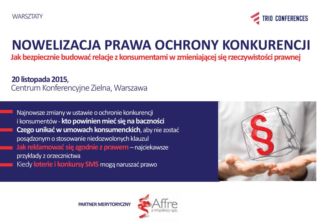 WARSZTATY NOWELIZACJA PRAWA OCHRONY KONKURENCJI Jak bezpiecznie budować relacje z konsumentami w zmieniającej się rzeczywistości prawnej 20 listopada 2015, Centrum Konferencyjne Zielna, Warszawa Najnowsze zmiany w ustawie o ochronie konkurencji i konsumentów - kto powinien mieć się na baczności Czego unikać w umowach konsumenckich, aby nie zostać posądzonym o stosowanie niedozwolonych klauzul Jak reklamować się zgodnie z prawem – najciekawsze przykłady z orzecznictwa Kiedy loterie i konkursy SMS mogą naruszać prawo PARTNER MERYTORYCZNY 7 lipca br. rząd przyjął projekt ustawy, którego celem będzie lepsza ochrona konsumentów na różnych rynkach i wprowadzenie nowych rozwiązań, pozwalających na szybszą eliminację nieuczciwych praktyk. Jest to odpowiedź na postulaty różnych środowisk o lepszą ochronę konsumentów i dobra informacja dla klientów, czyli nas wszystkich. Z drugiej jednak strony kolejne zaostrzenie przepisów prawnych powoduje dezorientację wśród przedsiębiorców co do możliwości realizacji swoich celów biznesowych zgodnie z wymogami prawa. Z myślą o bieżących, konkretnych potrzebach firm w zakresie pozyskania kompleksowej wiedzy prawnej niezbędnej do działania na rynku konsumenckich, przygotowaliśmy praktyczne warsztaty: NOWELIZACJA PRAWA OCHRONY KONKURENCJI � JAK BEZPIECZNIE BUDOWAĆ RELACJE Z KONSUMENTAMI W ZMIENIAJĄCEJ SIĘ RZECZYWISTOŚCI PRAWNEJ W trakcie tego wydarzenia, eksperci z kancelarii Affre & Wspólnicy kompleksowo omówią najnowsze, szykowane zmiany prawne, jak również przeprowadzą Państwa przez meandry niepewności co do planowanych obostrzeń. To nie będzie kolejne nudne szkolenie oparte na czytaniu paragrafów, ale realna analiza wątpliwych i powodujących problemy z interpretacją sytuacji, bardzo często występujących w codziennej pracy. Gwarantujemy Państwu formułę opartą na dynamicznej interakcji! Zachęcamy do przygotowania pytań, które będą mogli Państwo zadać naszym ekspertom w trakcie wydarzenia. Jak wiadomo, kolejne obostrzenia prawne i wprowadzenie nowych instytucji, których zadaniem będzie bardziej szczegółowa analiza poczynań nieuczciwych przedsiębiorców, będą miały skutki dla wszystkich firm opierających swoją działalność na relacjach z konsumentami. Warto więc zdobyć niezbędną wiedzę, która uchroni przed posądzeniem o stosowanie niekorzystnych rozwiązań dla klientów. Do udziału w warsztatach zapraszamy MENEDŻERÓW I SPECJALISTÓW ODPOWIEDZIALNYCH ZA ZARZĄDZANIE NASTĘPUJĄCYMI OBSZARAMI: PRAWNYM, COMPLIANCE, MARKETINGU, PROMOCJI I REKLAMY. Zapraszam JOANNA JAMKA CONFERENCE DIRECTOR M. +48 500 161 297 [email protected] y 20 LISTOPADA, PIĄTEK 9:30 REJESTRACJA, PORANNA KAWA 10:00 Powitanie, wzajemne przedstawienie się uczestników warsztatów 10:10 IDZIE NOWE, CZYLI KOLEJNE ZMIANY W USTAWIE O OCHRONIE KONKURENCJI I KONSUMENTÓW Najważniejsze zmiany: Nowe postaci praktyk naruszających zbiorowe interesy konsumentów Decyzja tymczasowa Urzędnik jako mystery shopper – wprowadzenie instytucji „tajemniczego klienta” Bezpłatne komunikaty i ostrzeżenia urzędu w mediach Wydłużenie okresu przedawnienia Nowy model kontroli klauzul abuzywnych Skutki nowelizacji czyli jak przygotować się do zmian i które branże powinny mieć się na baczności 13:20 CZEGO UNIKAĆ W UMOWACH KONSUMENCKICH – NIEDOZWOLONE POSTANOWIENIA UMOWNE Polityka prezesa UOKiK i statystyki z ostatnich lat Klauzule abuzywne – definicja i praktyka Przesłanki uznania postanowień za niedozwolone Kontrola abuzywności klauzul – incydentalna i abstrakcyjna Klauzule niedozwolone, a pozwy zbiorowe Skuteczne minimalizowanie ryzyka - jak prawidłowo formułować regulaminy i umowy? Najczęstsze naruszenia – przykłady z orzecznictwa Przemysław Rybicki – Radca Prawny Katarzyna Górna – Adwokat 11:10 PRZERWA NA KAWĘ I DYSKUSJĘ W KULUARACH 14:20 PRZERWA NA KAWĘ I DYSKUSJĘ W KULUARACH 11:30 JAK REKLAMOWAĆ SIĘ ZGODNIE Z PRAWEM - REKLAMA W KONTEKŚCIE ZAPISÓW O CZYNACH NIEUCZCIWEJ KONKURENCJI 14:40 KONKURSY I LOTERIE SMS, A REGULACJE KONSUMENCKIE Czy każda informacja jest reklamą? Reklama jako czyn nieuczciwej konkurencji Keywords, meta-tags, pop-up – czyli jak zgodnie z prawem reklamować się w Internecie Których produktów nie można reklamować? Samoregulacja, czyli kogo obowiązuje kodeks etyki reklamy Case-study: omówienie najciekawszych przykładów z orzecznictwa Marek Rumak – Radca Prawny 12:30 LUNCH Źródła prawa – źródła zagrożeń? Przepisy o których należy pamiętać Kiedy przedsiębiorca narusza zbiorowe interesy konsumentów i dopuszcza się nieuczciwej praktyki rynkowej Nie tylko UOKiK, czyli sankcje karne i odpowiedzialność cywilna Komunikat o konkursie i loterii – czy to SPAM? Kiedy loterie i konkursy SMS mogą naruszać prawo – przykłady z orzecznictwa Joanna Affre – Adwokat 15:40 PODSUMOWANIE WARSZTATÓW, SESJA Q&A 16:00 ZAKOŃCZENIE WARSZTATÓW, WRĘCZENIE CERTYFIKATÓW Joanna Affre – Adwokat Od ponad 15 lat specjalizuje się w szeroko rozumianym prawie konkurencji. Doradza klientom z branży FMCG, spożywczej, motoryzacyjnej, chemicznej, budowlanej oraz sektorów mediów i reklamy, a także bankowego w zakresie kształtowania polityki dystrybucyjnej, przeciwdziałania porozumieniom antykonkurencyjnym i nadużywaniu pozycji dominującej, fuzji i przejęć, prawa konsumenckiego, a także zwalczania nieuczciwej konkurencji. W tym zakresie prowadzi audyty i szkolenia dla przedsiębiorców, a także reprezentuje klientów zarówno w postępowaniach przed organami administracji państwowej, jak i sądami. Absolwentka Uniwersytetu Wrocławskiego oraz studiów podyplomowych z zakresu nauk politycznych (IEP Strasbourg Francja), prawa wspólnotowego (Lyon III Francja) i prawa konkurencji (King's College, Londyn, Wielka Brytania). Katarzyna Górna – Adwokat Specjalizuje się w prawie własności przemysłowej oraz w prawie konkure