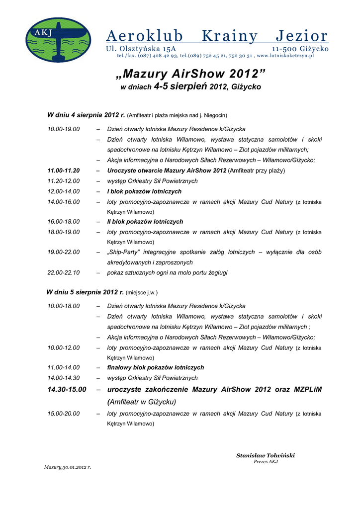 Aeroklub Krainy Ul. Olsztyńska 15A Jezior 11-500 Giżycko tel./fax. (087 ) 428 42 93, tel.(089) 7 52 4 5 21, 7 52 30 31 , www.lotniskoketrzyn.pl „Mazury AirShow 2012” w dniach 4-5 sierpień 2012, Giżycko W dniu 4 sierpnia 2012 r. (Amfiteatr i plaża miejska nad j. Niegocin) 10.00-19.00 – Dzień otwarty lotniska Mazury Residence k/Giżycka – Dzień otwarty lotniska Wilamowo, wystawa statyczna samolotów i skoki spadochronowe na lotnisku Kętrzyn Wilamowo – Zlot pojazdów militarnych; – Akcja informacyjna o Narodowych Siłach Rezerwowych – Wilamowo/Giżycko; 11.00-11.20 – Uroczyste otwarcie Mazury AirShow 2012 (Amfiteatr przy plaży) 11.20-12.00 – występ Orkiestry Sił Powietrznych 12.00-14.00 – I blok pokazów lotniczych 14.00-16.00 – loty promocyjno-zapoznawcze w ramach akcji Mazury Cud Natury (z lotniska Kętrzyn Wilamowo) 16.00-18.00 – II blok pokazów lotniczych 18.00-19.00 – loty promocyjno-zapoznawcze w ramach akcji Mazury Cud Natury (z lotniska Kętrzyn Wilamowo) 19.00-22.00 – „Ship-Party” integracyjne spotkanie załóg lotniczych – wyłącznie dla osób akredytowanych i zaproszonych 22.00-22.10 – pokaz sztucznych ogni na molo portu żeglugi W dniu 5 sierpnia 2012 r. (miejsce j.w.) 10.00-18.00 – Dzień otwarty lotniska Mazury Residence k/Giżycka – Dzień otwarty lotniska Wilamowo, wystawa statyczna samolotów i skoki spadochronowe na lotnisku Kętrzyn Wilamowo – Zlot pojazdów militarnych ; 10.00-12.00 – Akcja informacyjna o Narodowych Siłach Rezerwowych – Wilamowo/Giżycko; – loty promocyjno-zapoznawcze w ramach akcji Mazury Cud Natury (z lotniska Kętrzyn Wilamowo) 11.00-14.00 – finałowy blok pokazów lotniczych 14.00-14.30 – występ Orkiestry Sił Powietrznych 14.30-15.00 – uroczyste zakończenie Mazury AirShow 2012 oraz MZPLiM (Amfiteatr w Giżycku) 15.00-20.00 – loty promocyjno-zapoznawcze w ramach akcji Mazury Cud Natury (z lotniska Kętrzyn Wilamowo) Stanisław Tołwiński Prezes AKJ Mazury,30.01.2012 r.